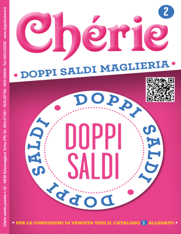 l d a i s Chérie casella postale n. 63 - 43039 Salsomaggiore Terme (PR) Tel. 0524.571921 - 0524.527186 - 0524.528448 - Fax 0524.523232 - www.negoziocherie.it 2 • a i r e i l g a m i d l a s i p • dop opp d i • s a l di • per le condizioni di vendita vedi il catalogo 1 allegato • op • d pi DOPPI SALDI SPECIALE: DOPPI SALDI FASCIA AD ANELLO LONDRA In lana Merinos Extrafine cipria cod 085 € 15,00 (prezzo scontato). MAGLIA AGATA In lana Merinos Extrafine cipria cod 085 € 69,00 (prezzo scontato). CARDIGAN LUNGO Cipria (cod 085) Adelita (100% lana Merinos Extrafine) Caldo e morbido, unisce la praticità sportiva a un’allure raffinata il lungo cardigan-spolverino di stile rétro. Aderente nel corpino, si amplia leggermente nella gonna. Lo caratterizzano gli alti bordi lavorati a coste fantasia in rilievo. TAGLIE: 42, 44, 46, 48, 50, 52, 54 2 € 83 PREZZO ORIGINALE € PREZZO SCONTATO € Per ordini: www.negoziocherie.it ,00 149,00 104,00 CAMICIA ALTHEA In cotone elasticizzato bianco cod C01 € 57,00. CARDIGAN LUNGO Adelita € Antracite mélange (cod 041) (100% lana Merinos Extrafine) 83 PREZZO ORIGINALE € PREZZO SCONTATO € Per ordini: tel. 0524/571921 ,00 149,00 104,00 3 SPECIALE: DOPPI SALDI T-SHIRT ERICA In viscosa elasticizzata viola cod 073 € 29,90 (prezzo scontato). MAXI MAGLIA Viola (cod 073) Alexandra (100% lana Merinos Extrafine) Mini-abito o maxi maglia? A voi la scelta! Si accosta a capi in tinta o in contrasto il modello diritto, reso aderente dalle coste a fisarmonica. La parte centrale davanti è caratterizzata da un riquadro-scultura di tre maxi-motivi intrecciati. TAGLIE: 42, 44, 46, 48, 50, 52, 54 4 € 77 PREZZO ORIGINALE € PREZZO SCONTATO € Per ordini: www.negoziocherie.it ,00 139,00 97,00 FASCIA AD ANELLO LONDRA In lana Merinos Extrafine nocciola cod 074 € 15,00 (prezzo scontato). T-SHIRT ERICA In viscosa elasticizzata nero cod 003 € 49,00. MAXI MAGLIA Alexandra € Nocciola (cod 074) 77 ,00 (100% lana Merinos Extrafine) PREZZO ORIGINALE € PREZZO SCONTATO € Per ordini: tel. 0524/571921 139,00 97,00 5 SPECIALE: DOPPI SALDI MAGLIA AGATA In lana Merinos Extrafine rosa mauve cod 086 € 69,00 (prezzo scontato). CARDIGAN 100 Ariel € Uva mélange (cod 048) (100% lana Merinos Extrafine) Larghe e orizzontali sull’ampio bordo che sale a formare il collo a scialle, le coste diventano fitte sulla parte principale del capo, con maniche “a martello” che arrivano sulle spalle. La spilla da balia fornita con il cardigan ne agevola la portabilità. TAGLIE: 42, 44, 46, 48, 50, 52, 54 6 PREZZO ORIGINALE € PREZZO SCONTATO € Per ordini: www.negoziocherie.it ,00 179,00 125,00 MAGLIA Agata € Antracite melangé (cod 041) (100% lana Merinos Extrafine) In tonalità neutra, il pull rappresenta l’ideale capo passepartout immancabile in ogni armadio. Facile da abbinare con pantaloni e gonne, sportivo nel look a collo alto, si indossa come sottogiacca oppure assieme a un cardigan o a una camicia. TAGLIE: 42, 44, 46, 48, 50, 52, 54 55 PREZZO ORIGINALE € PREZZO SCONTATO € Per ordini: tel. 0524/571921 ,00 99,00 69,00 7 SPECIALE: DOPPI SALDI CAMICIA CAROLA In viscosa verde titanio cod 030 € 48,00 (prezzo scontato). SMANICATO Ardea € Cipria (cod 085) (100% lana Merinos Extrafine) Look informale per il modello diritto, caldo e leggero, da indossare sopra pull o camicie. La lavorazione alterna pannelli a maglia rasata diritta e rovescia. Orlo “a vivo” per la scollatura, profilati da coste gli altri bordi. TAGLIE: 42, 44, 46, 48, 50, 52, 54 8 49 PREZZO ORIGINALE € PREZZO SCONTATO € Per ordini: www.negoziocherie.it ,00 89,00 62,00 MAGLIA Arabella € Nero (cod 003) (100% lana Merinos Extrafine) Classico il modello girocollo, rinnovato dal particolare motivo geometrico a riquadri concentrici, in leggero rilievo, che evoca una struttura a labirinto. TAGLIE: 42, 44, 46, 48, 50, 52, 54 64 PREZZO ORIGINALE € PREZZO SCONTATO € Per ordini: tel. 0524/571921 ,00 116,00 81,00 9 SPECIALE: DOPPI SALDI T-SHIRT ERICA In viscosa elasticizzata nero cod 003 € 49,00. MAGLIA Amy € Grigio perla (cod 066) (100% lana Merinos Extrafine) Sembra fatto a mano il pull dalle proporzioni perfette. Diritto, tutto lavorato a legaccio, è costruito con maniche raglan. Ampio il girocollo. Decorative le diminuzioni.Lungo sui fianchi, è ideale con i pantaloni. TAGLIE: 42, 44, 46, 48, 50, 52, 54 10 76 PREZZO ORIGINALE € PREZZO SCONTATO € Per ordini: www.negoziocherie.it ,00 136,00 95,00 MAGLIA Amy € Ottanio (cod 060) 76 ,00 (100% lana Merinos Extrafine) PREZZO ORIGINALE € PREZZO SCONTATO € Per ordini: tel. 0524/571921 136,00 95,00 11 SPECIALE: DOPPI SALDI MAGLIA Aurora € Ottanio (cod 060) (100% lana Merinos Extrafine) Versatile nell’aspetto, il pull a maglia rasata con alti bordi a coste e ampio collo a scialle, incrociato alla base, accentua il look elegante se indossato a fior di pelle con bijoux d’effetto. TAGLIE: 42, 44, 46, 48, 50, 52, 54 12 70 PREZZO ORIGINALE € PREZZO SCONTATO € Per ordini: www.negoziocherie.it ,00 126,00 88,00 MAGLIA Aurora € Latte (cod 079) 70 ,00 (100% lana Merinos Extrafine) PREZZO ORIGINALE € PREZZO SCONTATO € Per ordini: tel. 0524/571921 126,00 88,00 13 SPECIALE: DOPPI SALDI MAGLIA Alena € Verde oliva (cod 036) (100% lana Merinos Extrafine) La linea incrociata, creata dalla sovrapposizione dei due davanti simmetrici, regala subito un’atmosfera calda al pull a maglia rasata, da indossare anche nelle occasioni più impegnative con bijoux importanti. TAGLIE: 42, 44, 46, 48, 50, 52, 54 14 62 PREZZO ORIGINALE € PREZZO SCONTATO € Per ordini: www.negoziocherie.it ,00 112,00 78,00 Dettaglio del ricamo MAGLIA Astrid € Latte (cod 079) (100% lana Merinos Extrafine) Molto particolare, il modello a costine con ampie maniche a pipistrello basta da solo a risolvere la richiesta di un abbigliamento elegante. A illuminare il capo il prezioso ricamo etnico disposto in simmetria sulle spalle. TAGLIE: 42, 44, 46, 48, 50, 52