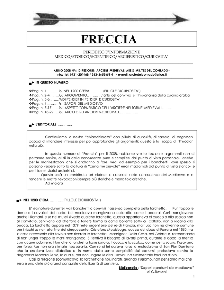 FRECCIA PERIODICO D’INFORMAZIONE MEDICO/STORICO/SCIENTIFICO/ARCIERISTICO/CURIOSITA’ ________________________________________________________________________________ ANNO 2008 N°6 DIREZIONE: ARCIERI MEDIEVALI AESIS MILITES DEL CONTADO – Info: tel. 0731-201468 / 333-2655659,4 - e-mail: [email protected] ═══════════════════════════════════════════════════════════════════════════ ▄► IN QUESTO NUMERO: Pag. n. 1 ……… . NEL 1200 C’ERA…………(PILLOLE DICURIOSITA’) Pag. n. 2-4. . …..L’ARGOMENTO…………L’arte del convivio e l’Importanza della cucina araba Pag. n. 5-6..…….DI PENSIER IN PENSIER E CURIOSITA’ Pag. n. 4 ……… I SAPORI DEL MEDIOEVO Pag. n. 7-17. …..L’ASPETTO TORNEISTICO DEL L’ARCIERE NEI TORNEI MEDIEVALI ……… Pag. n. 18-22…..L’ARCO E GLI ARCIERI MEDIEOVALI…………….. ▄► L’EDITORIALE………….. Continuiamo la nostra “chiacchierata” con pillole di curiosità, di sapere, di cognizioni capaci di infondere interesse per poi approfondire gli argomenti: questo è lo scopo di “Freccia” nulla più. In questo numero di “Freccia” per il 2008, abbiamo voluto toc care argomenti che ci potranno servire, al di la della conoscenza pura e semplice dal punto di vista personale, anche per le manifestazioni che si andranno a fare; vedi ad esempio per i banchetti -ove spesso si possono vedere sotto la dicitura di “cena me dievale” errori madornali dal punto di vista storico - e per i tornei storici arcieristici. Questo sarà un contributo ad aiutarci a crescere nella conoscenza del Medioevo e a rendere le nostre rievocazioni sempre più storiche e meno folcloristiche. Ad maiora. ▄► NEL 1200 C’ERA …………(PILLOLE DICURIOSITA’) E’ da notare durante i vari banchetti o convivii l’assenza completa della forchetta. Pur troppo le dame e i cavalieri del nostro bel medioevo mangiavano colle dita come i pecorai. Così mangiavano anche i Romani, e se nei musei si vede qualche forchetta, questa apparteneva al cuoco o allo scalco non al convitato. Servivano ad afferrare e tenere ferma la carne bollente sotto al coltello, non a recarla alla bocca. La forchetta appare nel 1379 nelle argent erie del re di Francia, ma l’uso non ne divenne comune per i ricchi se non alla fine del cinquecento. Cristoforo Messisbugo, cuoco del duca di Ferrara nel 1530, tra le cose necessarie alla tavola non ricorda la forchetta . Monsignor Della Casa, nel Galate o, raccomanda di non unger troppo le mani mangiando. Si sentiva il bisogno di lavarsi prima, durante e dopo la mensa con acque odorifere. Non che la forchetta fosse ignota. Il cuoco e lo scalco, come detto sopra, l’usavano per forza. Ma non era stimata nec essaria. Contro di lei durava forse la maledizione di San Pier Damiano che la credeva lusso diabolico e, in nome della santa semplicità dei costumi, protestava contro la dogaressa Teodora Selvo, la quale, per non ungere le dita, usava una rudimentale forci na d’oro. Così la religione scomunicava la forchetta; e noi, ingrati, quando l’usiamo, non pensiamo mai che essa è una delle più grandi conquiste della libertà di pensiero. Bibliografia: “Sapori e profumi del medioevo” di G.Roversi 1 ▄▀►●GLI ARGOMENTI: L’ARTE DEL CONVIVIO E’ stata chiamata “arte” il banchettare perché ha avuto sempre un ruolo fondamentale fin dalla creazione dell’uomo segnando qualsiasi atto importante della sua vita. Ha avuto un ruolo nella cultura e nelle religioni attraverso sia il digiuno che il banchetto, le pietanze ricche di significato nelle varie culture e nelle varie feste rituali. La tavola è servita anche nei rapporti fra i singoli e non solo per saziarsi. Come nota Michelle Eyquen de Montagne:…… la civiltà ha come asse portante il pranzo: Socrate insegna a tavola; Cristo saluta i suoi Apostoli a tavola; la società medievale vive del “convivium”. Il medioevo, che è stato l’età del gotico, delle cattedrali, dei grandi Santi e dei solenni mistici, dei pellegrinag gi e delle crociate, non poteva non lasciare un segno anche in campo culinario. C’era infatti molta attenzione per una alimentazione attenta alle prescrizioni religiose collegate al vivere quotidiano ed al festivo,regolate dal calendario liturgico nel “tempo de carne” e nel “tempo de magro”. Questa suddivisione era dettata da motivazioni di fede, vedeva la quaresima come periodo di magro mentre, per tutto l’anno, la settimana era così regolata: il mercoledì, il venerdì, il sabato e le vigilie di tutte le feste, dovevano considerarsi giorni di magro, quindi per gustare le carni, rimanevano il lunedì, il martedì, il giovedì e la domenica. Esistevano inoltre particolari divieti estesi a tutto l’anno, sempre di natura religiosa, come ad esempio la proib i zione, non per il clero,ma per i monaci, di cibarsi di carni di quadrupedi. Per i nobili, per i ricchi ed i prelati, i banchetti sempre sontuosi e ricchi, vedevano al posto delle carni pesci di alta qualità accompagnati da brodetti e salse a base di spezie ed i n agrodolce dove era frequente l’uso del latte di mandorla in sostituzione del latte animale e dei brodi di carne. AI contadini ed al popolo, rimaneva per sfamarsi pane e zuppe di cereali, di erbe selvatiche, di verdure,fave,ceci e lenticchie. Tutto ciò, con grande uso di aglio per dargli un sapore e, negli anni più fortunati, con qualche grano di pepe nero. I nobili consumavano grandi quantità di cacciagione, dagli orsi ai daini, cervi, cinghiali, selvaggina ed inoltre affia n cavano a queste carni i cosiddetti animali di allev a mento domestico e,cioè,vitelli, vaccine,agnelli,capretti, poll a me, maiali e gran numero di uova e formaggi. Per il popolo, specialmente per i meno abbienti, le cose erano sempre più o meno le stesse, sia nei giorni di abbondanza ch