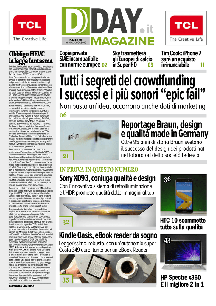 n.133 / 16 16 MAGGIO 2016 MAGAZINE Copia privata Sky trasmetterà Obbligo HEVC SIAE incompatibile Europei di calcio la legge fantasma con norme europee 02 gli in Super HD 09 Nel silenzio di tutti gli attori coinvolti, ci avviciniamo alle scadenze di legge che mettono al bando dal primo gennaio prossimo, a torto o a ragione, tutti i TV privi di tuner DVB-T2 e codec HEVC. In un Paese normale, nei mesi precedenti a tale divieto, le istituzioni chiarirebbero cosa accadrà nei prossimi anni alle frequenze televisive e agli standard di trasmissione, così da consentire acquisti consapevoli. In un Paese normale, ci sarebbero chiari ed evidenti segni a differenziare i TV evoluti da quelli destinati a breve a diventare obsoleti. In un Paese normale ci sarebbero sanzioni severe e facilmente applicabili per i negozianti che, una volta scattato l’obbligo di legge, violino questa disposizione continuando a vendere TV obsoleti. Evidentemente l’Italia non è un Paese normale, se succede il perfetto contrario: nessuna informazione su tempi e modi di un eventuale switch off; nessuna possibilità concreta per il consumatore non evoluto di capire quali siano, tra quelli in vendita e in promozione, i TV HEVC; nessuna sanzione prevista per chi, dopo il 1° gennaio 2017, continuerà a vendere i TV banditi. Tanto da arrivare a stupirsi se Esselunga (e non i retailer specializzati), per prima si “azzarda” a mettere in evidenza sul volantino che un TV in offerta è compatibile con il nuovo standard. Un “dettaglio”, la compatibilità con HEVC, che nessun retailer, men che meno specializzato, può ignorare ma che, guarda caso non compare a margine di nessun TV tra quelli promossi sui volantini dedicati ai campionati europei di calcio. Beninteso, non chiediamo che i rivenditori pratichino dell’autolesionismo “bollando” i TV che diventeranno invendibili dal gennaio prossimo. Uno stupido obbligo di questo tipo fu introdotto nel 2008, durante lo switch off della TV analogica, con un triste “necrologio” in bianco e nero che sarebbe stato obbligatorio affiggere agli apparecchi obsoleti: “Questo apparecchio non è compatibile con le trasmissioni in tecnica digitale”. Ovviamente i negozianti che si adeguarono furono pochissimi e l’obbligo finì per essere così largamente disatteso da rendere impossibile qualsiasi forma di sanzione. Ma basterebbe segnalare in maniera chiara quelli compatibili con HEVC: chi sa, capisce; e chi non sa, magari si può porre la domanda. Dove sono i bollini, quando servono? Negli ultimi dieci anni siamo stati invasi da bollini di tutti i colori appesi sui TV. E ora, quando sarebbe bene che venisse fatta chiarezza su quali TV sono effettivamente rispondenti ai nuovi standard, i produttori, le associazioni di categoria e i consorzi di filiera si “dimenticano” che forse un po’ di chiarezza andrebbe fatta, anche con gli abusati bollini. E se produttori e rivenditori – senza obblighi espliciti in tal senso - tutto sommato è comprensibile che non abbiano tutta questa fretta di porsi il problema, le istituzioni non solo sarebbe opportuno che intervenissero ma anzi sono esse stesse obbligate dalla legge a farlo. E non lo fanno. Infatti, proprio la legge 44/2012 che istituisce l’obbligo di vendita di TV DVB-T2 e HEVC dal prossimo gennaio, indica anche chiaramente tra i compiti del Ministero dello Sviluppo Economico e dell’Autorità per le Garanzie nelle Comunicazioni di porre in essere “ogni azione utile alla promozione degli standard televisivi DVB-T2 e MPEG-4 o successive evoluzioni approvate nell’ambito dell’Unione internazionale delle telecomunicazioni (ITU)”. Nulla si è visto in questo senso da parte del MISE e dell’AGCOM, ma proprio nulla. E se sono le istituzioni le prime a smentire la legge, come si pretende che a rispettarle siano i produttori e rivenditori? Insomma, ci dicano se ci siamo sognati tutto. Perché tutto quello che vediamo accadere attorno a noi dice chiaramente che questa legge non la sta prendendo sul serio nessuno, anzi che forse neppure esiste. E in queste condizioni di informazione inesistente, programmazione inesistente e possibilità di far rispettare la legge inesistente, i propositi di fare uno switch off nel 2020 o al più tardi nel 2022, non solo sono discutibili ma addirittura da incoscienti. Gianfranco GIARDINA Tim Cook: iPhone 7 sarà un acquisto irrinunciabile 11 Tutti i segreti del crowdfunding I successi e i più sonori “epic fail” Non basta un’idea, occorrono anche doti di marketing 06 21 Reportage Braun, design e qualità made in Germany Oltre 95 anni di storia Braun svelano il successo del design dei prodotti nati nei laboratori della società tedesca IN PROVA IN QUESTO NUMERO Sony XD93, coniuga qualità e design Con l’innovativo sistema di retroilluminazione e l’HDR promette qualità delle immagini al top 32 Kindle Oasis, eBook reader da sogno Leggerissimo, robusto, con un’autonomia super Costa 349 euro: tanto per un eBook Reader 35 36 HTC 10 scommette tutto sulla qualità 43 HP Spectre x360 È il migliore 2 in 1 n.133 / 16 16 MAGGIO 2016 MAGAZINE MERCATO Emesse le conclusioni dell’avvocato generale della Corte di Giustizia Europea:SIAE e Ministero verso la revisione delle regole Procedure rimborsi ed esenzioni per copia privata Gestione SIAE incompatibile con norme europee Le procedure previste per gli usi professionali non sono sufficientemente trasparenti ed equilibrate, lo dice la Corte di Giustizia L di Gianfranco GIARDINA a gestione delle esenzioni per uso professiona‑ le della copia privata in Italia, gestita da SIAE, non sarebbe compatibile con il diritto europeo. A sostenerlo la Corte di Giustizia Europea nelle con‑ clusioni dell’avvocato generale Nils Wahl (disponibili qui per chi volesse approfondire) pubblicate e riferite a un contenzioso tra una serie di aziende produttrici e distributrici di cellulari e PC (Nokia Italia SpA, Hewlett‑Packard Italiana Srl, Telecom Italia SpA, 