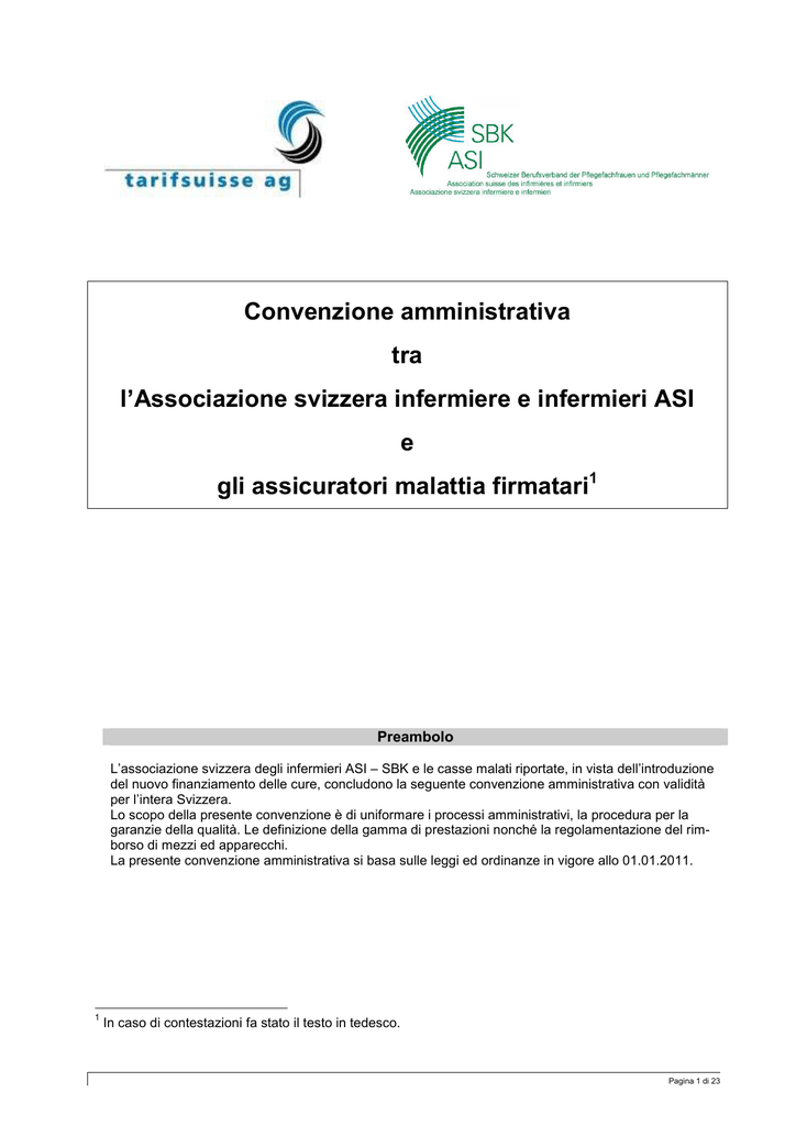 Convenzione amministrativa tra l’Associazione svizzera infermiere e infermieri ASI e gli assicuratori malattia firmatari1 Preambolo L’associazione svizzera degli infermieri ASI – SBK e le casse malati riportate, in vista dell’introduzione del nuovo finanziamento delle cure, concludono la seguente convenzione amministrativa con validità per l’intera Svizzera. Lo scopo della presente convenzione è di uniformare i processi amministrativi, la procedura per la garanzie della qualità. Le definizione della gamma di prestazioni nonché la regolamentazione del rimborso di mezzi ed apparecchi. La presente convenzione amministrativa si basa sulle leggi ed ordinanze in vigore allo 01.01.2011. 1 In caso di contestazioni fa stato il testo in tedesco. Pagina 1 di 23 Art. 1 Parti contraenti 1 Le parti contraenti della presente convenzione amministrativa sono l’Associazione svizzera degli infermieri ASI–SBK, Choisystrasse 1, Casella postale 8124, 3001 Berna, di seguito denominata ASI-SBK, da un lato e gli assicuratori malattia qui di seguito elencati AMB Assurance-maladie et accidents Aquilana Versicherungen Arcosana AG Atupri Krankenkasse AUXILIA Assurance-maladie SA Avenir Assurance Maldie SA Caisse-maladie de la Vallée d’Entremont Caisse da malsauns LUMNEZIANA CONCORDIA Schweiz. Kranken- und Unfallversicherung CSS Kranken-Versicherung AG Easy Sana Assurance Maladie SA EGK Grundversicherungen GALENOS Kranken- und Unfallversicherung Glarner Krankenversicherung innova Versicherungen innova Wallis AG INTRAS Assurance-maladie SA KLuG Krankenversicherung kmu-Krankenversicherung Kranken- und Unfallkasse, Bezirkskrankenkasse Einsiedeln Krankenkasse Agrisano Krankenkasse Birchmeier Krankenkasse Institut Ingenbohl Krankenkasse Luzerner Hinterland Krankenkasse Simplon Krankenkasse SLKK Krankenkasse Steffisburg Krankenkasse Stoffel Mels KKS Krankenkasse Turbental Krankenkasse Visperterminen Krankenkasse Wädenswil Krankenkasse Zeneggen Krankenversicherung Flaachtal AG Moove Sympany AG Mutuel Assurance Maladie SA ÖKK Kranken-und Unfallversicherungen AG PHILOS Assurance Maladie SA Provita Gesundheitsversicherung AG rhenusana-Die Rheintaler Krankenkasse sana24 Sanagate AG sanavals Gesundheitskasse sodalis gesundheitsgruppe sumiswalder SUPRA Caisse-maladie ???????? SWICA Gesundheitsorganisation Visana BAG Nr. 1507 BAG Nr. 32 BAG Nr. 1569 BAG Nr. 312 BAG Nr. 1159 BAG Nr. 343 BAG Nr. 1113 BAG Nr. 820 BAG Nr. 290 BAG Nr. 8 BAG Nr. 774 BAG Nr. 881 BAG Nr. 1386 BAG Nr. 780 BAG Nr. 1563 BAG Nr. 790 BAG Nr. 1529 BAG Nr. 829 BAG Nr. 1328 BAG Nr. 134 BAG Nr. 1560 BAG Nr. 1322 BAG Nr. 1142 BAG Nr. 360 BAG Nr. 1362 BAG Nr. 923 BAG Nr. 246 BAG Nr. 1331 BAG Nr. 1147 BAG Nr. 1040 BAG Nr. 1318 BAG Nr. 1003 BAG Nr. 558 BAG Nr. 57 BAG Nr. 1479 BAG Nr. 455 BAG Nr. 1535 BAG Nr. 182 BAG Nr. 1401 BAG Nr. 1568 BAG Nr. 1577 BAG Nr. 901 BAG Nr. 941 BAG Nr. 194 BAG Nr. 62 BAG Nr. 1384 BAG Nr. 1555 Pagina 2 di 23 vita surselva vivacare Vivao Sympany AG BAG Nr. 966 BAG Nr. 1570 BAG Nr. 509 D’altro lato, tutti gli assicuratori rappresentati per procura da tarifsuisse ag Römerstrasse 20 4502 Solothurn 2 La convenzione è valida per : a. I fornitori di prestazioni che hanno dichiarato l’adesione alla presente convenzione amministrativa (definiti in seguito „fornitori di prestazioni“) e b. Gli assicuratori malattia che hanno dichiarato l’adesione alla presente convenzione amministrativa (definiti in seguito „assicuratori“) Art. 2 Adesione, quote di adesione, esclusione 1 L’adesione implica il riconoscimento integrale della presente convenzione amministrativa con tutti i suoi allegati ai sensi dell’art. 21 quale parte integrante della presente convenzione. 2 La procedura d’adesione viene avviata dall’ASI-SBK dopo la firma della convenzione amministrativa. 3 Regolarmente l’ASI-SBK informa gli assicuratori, rappresentati da tarifsuisse.ag, sugli elenchi attuali. 4 tarifsuisse ag ha il diritto di non ammettere alla convenzione amministrativa un fornitore di prestazioni. Prima della decisione tarifsuisse ag. Consulta l’ASI-SBK. La decisione viene motivata al fornitore di prestazioni nonché all’ASI-SBK. I fornitori di prestazione, in virtù dell’art. 89 LAMal, possono rivolgersi al tribunale arbitrale cantonale. 5 tarifsuisse ag e l’ASI-SBK possono escludere congiuntamente un fornitore di prestazioni dalla convenzione amministrativa. 6 A questa convenzione amministrativa possono aderire tutti i fornitori di prestazioni che rispondono ai requisiti secondo art. 49 OAMal e che sono in possesso di un libero esercizio rilasciato dal cantone. 7 I fornitori di prestazioni possono aderire alla presente convenzione amministrativa mediante una dichiarazione scritta a ASI-SBK. L’adesione alla convenzione amministrativa è per i membri ASI-SBK gratuita. Fornitori di prestazioni che non sono membri ASI-SBK, pagano all’ ASI-SBK una quota d’adesione ed un contributo annuale. Ia quota del contributo è definito in un regolamento. Il regolamento attualmente in vigore, relativo alle quote di adesione, è pubblicato su Internet. Art. 3 Validità, offerte di prestazioni 1 La presente convenzione amministrativa regolamenta i processi amministrativi per le prestazioni di cura ambulatoriali ai sensi degli art. 25° LAMal. Art. 49 OAMal e art. 7 e segg. Opre. Pagina 3 di 23 2 La LAMal e la convenzione amministrativa distinguono tra prestazioni di cura, perlopiù fornite presso il domicilio del paziente, e quelle fornite in strutture diurne o notturne. La convenzione amministrativa è valida per entrambi i tipi di prestazioni di cure ambulatoriali precedentemente menzionate. Viene operata una distinzione per il rimborso (vedi art. 8 ed allegato 4 della presente convenzione). 3 I fornitori di prestazioni necessitano un numero RCC separato per ognuno degli ambiti: cure di lunga durata, cure acute e transitorie, così come strutture diurne o notturne. 4 Le prestazioni di cura ambulatoriali vengono fornite puntualmente e 