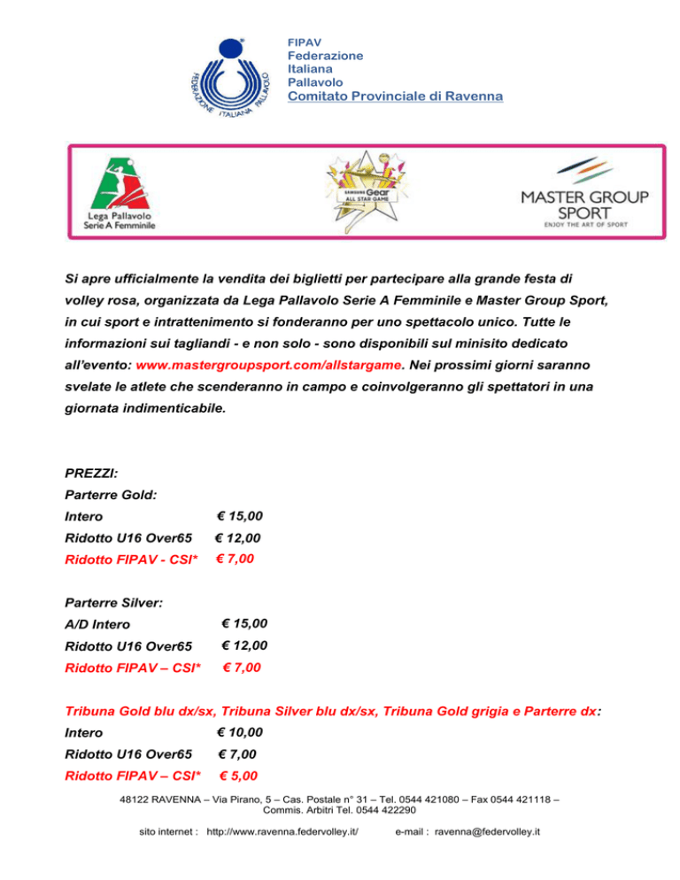 FIPAV Federazione Italiana Pallavolo Comitato Provinciale di Ravenna Si apre ufficialmente la vendita dei biglietti per partecipare alla grande festa di volley rosa, organizzata da Lega Pallavolo Serie A Femminile e Master Group Sport, in cui sport e intrattenimento si fonderanno per uno spettacolo unico. Tutte le informazioni sui tagliandi - e non solo - sono disponibili sul minisito dedicato all'evento: www.mastergroupsport.com/allstargame. Nei prossimi giorni saranno svelate le atlete che scenderanno in campo e coinvolgeranno gli spettatori in una giornata indimenticabile. PREZZI: Parterre Gold: Intero € 15,00 Ridotto U16 Over65 € 12,00 Ridotto FIPAV - CSI* € 7,00 Parterre Silver: A/D Intero € 15,00 Ridotto U16 Over65 € 12,00 Ridotto FIPAV – CSI* € 7,00 Tribuna Gold blu dx/sx, Tribuna Silver blu dx/sx, Tribuna Gold grigia e Parterre dx: Intero € 10,00 Ridotto U16 Over65 € 7,00 Ridotto FIPAV – CSI* € 5,00 48122 RAVENNA – Via Pirano, 5 – Cas. Postale n° 31 – Tel. 0544 421080 – Fax 0544 421118 – Commis. Arbitri Tel. 0544 422290 sito internet : http://www.ravenna.federvolley.it/ e-mail : [email protected] FIPAV Federazione Italiana Pallavolo Comitato Provinciale di Ravenna INGRESSO GRATUITO: Under 4 (senza posto a sedere) * I biglietti per i tesserati FIPAV e CSI saranno acquistabili presso le casse del PalaCattani di Faenza nei giorni dell’evento, presentando la tessera che attesti l’effettivo tesseramento. Per i tesserati FIPAV sarà inoltre possibile acquistarli tramite la FIPAV Comitato Provinciale di Ravenna come sotto specificato. MODALITA' D'ACQUISTO BIGLIETTI È possibile acquistare i tagliandi online sul sito Vivaticket. La vendita online sarà attiva fino a giovedì 6 ottobre 2016 alle ore 11:00. I tagliandi acquistati online potranno essere ritirati presso le casse del PalaCattani il giorno dell'evento. È possibile acquistare online anche i biglietti RIDOTTI (solo per Under 16 e Over 65). Al momento del ritiro dei biglietti ridotti - sempre presso le casse del PalaCattani dovranno essere presenti le persone Under 16 o Over 65 che beneficeranno della riduzione, i quali si dovranno presentare con un documento di riconoscimento. I biglietti saranno inoltre disponibili in tutte le ricevitorie Vivaticket by Best Union fino a sabato 8 ottobre e presso la biglietteria del PalaCattani il giorno dell'evento. 48122 RAVENNA – Via Pirano, 5 – Cas. Postale n° 31 – Tel. 0544 421080 – Fax 0544 421118 – Commis. Arbitri Tel. 0544 422290 sito internet : http://www.ravenna.federvolley.it/ e-mail : [email protected] FIPAV Federazione Italiana Pallavolo Comitato Provinciale di Ravenna ALL STAR GAME Faenza PALA CATTANI 8 OTTOBRE 2016 ore 20.30 Lega Pallavolo Serie A Femminile - Master Group Sport - Comitato Provinciale FIPAV di Ravenna hanno definito le modalità circa la vendita dei biglietti da destinarsi esclusivamente ai tesserati FIPAV (dirigenti, tecnici, atleti, arbitri) Il costo del singolo biglietto è di euro 5,00 per i posti in tribuna e di euro 7,00 per i posti in parterre gold. I biglietti sono numerati, pertanto per operare la scelta potete recarvi presso i nostri uffici VIA PIRANO 5 – RAVENNA dal lunedì al venerdì dalle 9.00 alle 11.30 – dalle 15.30 alle 18.30. Qualora decideste di effettuare la prenotazione via e-mail vi verranno assegnati i posti in ordine progressivo. Inviare la richiesta, indicando il nome del referente incaricato al ritiro ed un recapito telefonico, a [email protected] ENTRO E NON OLTRE IL GIORNO 6 OTTOBRE alle ore 10.00. Il Comitato provinciale FIPAV di Ravenna provvederà a dare riscontro della prenotazione. Il referente indicato provvederà al ritiro dei biglietti prenotati nel giorno dell’evento allo sportello dedicato presso il Pala Cattani previa consegna dell’equivalente monetario qualora non abbia già provveduto all’atto della prenotazione in FIPAV RA. 48122 RAVENNA – Via Pirano, 5 – Cas. Postale n° 31 – Tel. 0544 421080 – Fax 0544 421118 – Commis. Arbitri Tel. 0544 422290 sito internet : http://www.ravenna.federvolley.it/ e-mail : [email protected] FIPAV Federazione Italiana Pallavolo Comitato Provinciale di Ravenna Prenotazione/acquisto biglietti tesserati FIPAV appartenenti ad altri Comitati Effettuare la richiesta tramite e-mail seguendo le indicazioni sopra riportate ed allegando anche i seguenti documenti: - elenco atleti tesserati (ATL2) - elenco dirigenti (DIR 1) - elenco TEC 1 per tecnici ( o copia tesserino allenatore) - copia tesserino commissario di gara - Indicare nella richiesta nome dei referente societario delegato al ritiro dei biglietti I non tesserati FIPAV dovranno acquistare i biglietti on line sul circuito Vivaticket o direttamente alle casse del Pala Cattani nel giorno dell’evento, qualora ci fossero ancora disponibilità. 48122 RAVENNA – Via Pirano, 5 – Cas. Postale n° 31 – Tel. 0544 421080 – Fax 0544 421118 – Commis. Arbitri Tel. 0544 422290 sito internet : http://www.ravenna.federvolley.it/ e-mail : [email protected]