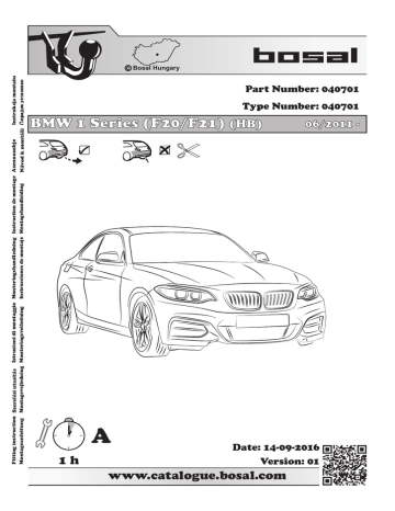 Fitting instruction Szerelési utasítás Istruzioni di montaggio Monteringshandledning Instruction de montage Asennusohje Instrukcja montazu Instrucciones de montaje Montagehandleiding Montageanleitung Montagevejledning Monteringsveiledning Návod k montázi op oK ycTaHoBK Bosal Hungary Part Number: 040701 Type Number: 040701 BMW 1 Series (F20/F21) (HB) A 1h www.catalogue.bosal.com 06/2011 - Date: 14-09-2016 Version: 01 E7 55R-011650 ECE R55 homologation S = 75 kg D= MAX KG X MAX KG MAX KG + MAX KG X 0,00981 < 8,60 kN 2090 kg 1510 kg D = 8,60 kN GB The clearance specified in appendix VII, diagram 25 of guideline ECE-R 55 must be guaranteed. GB at laden weight of the vehicle D Der Freiraum nach Anhang VII, Abbildung 25 der Richtlinie ECE-R 55 ist zu gewährleisten. D bei zulässigem Gesamtgewicht des Fahrzeuges H H rakománnyal terhelt járműsúly esetén. F Az ECE-R 55 irányelv VII. mellékletében, a 25. ábrán a vonógömb elhelyezése számára előírt szabad tér-adatokat biztosítani kell. La zone de dégagement doit être garantie conformément à l’annexe VII, illustration 25 de la directive ECE-R 55. I Deve essere garantito lo spazio libero secondo l’allegato VII, figura 25 della direttiva ECE-R 55. NL De tussenruimte conform supplement VII, afbeelding 25 van de richtlijn ECE-R 55 moet in acht worden genomen. E N pour poids total en charge autorisé du véhicule I per un peso complessivo ammesso del veicolo NL bij toelaatbaar totaal gewicht van het voertuig E Debe garantizarse el espacio libre, conforme al anexo VII, figura 25 de la directiva comunitaria ECE-R 55. con peso total autorizado del vehiculo FIN ajoneuvon suurimmalla sallitulla kokonaispainolla FIN Vapaa tila on taattava direktiivin ECE-R 55 liitteen VII, kuvan 25 mukaisesti. S F Spelrummet enligt bilaga VII, figur 25 i riktlinje ECE-R 55 skall garanteras. Frirommet etter tillegg VII, figur 25 i direktiv ECE-R 55 skal overholdes. S vid fordonets tillĺtna totalvikt N ved kjøretøyets tillatte totalvekt CZ při celkové přípustné hmotnosti vozidla CZ Volný prostor ve smyslu Přílohy VII, obr. 25 Směrnice č. ECE-R 55 musí být zaručen. PL Należy zagwarantować wolną wysokość określoną na rysunku nr 25 dyrektywy ECE-R 55 zawartej w załączniku nr VII. RU Необходимо обеспечить данные свободного пространства, предписанные для размещения тягового шарика в приложении VII. директивы ECE-R 55. DK Frirummet skal overholdes iht. bilag VII, fig. 25 i direktiv ECE-R 55. PL w przypadku największej dozwolonej masy całkowitej RU В случае нагруженного автомобиля. DK ved tilladt samlet vægt for køretøjet 15 Clearance space 100 Clearance space Vertical plane at limits of vehicle overal dimensions 65 max. 250 mm Vertical plane at limits of vehicle overal dimensions Ground 2 www.catalogue.bosal.com Przed holowaniem w każdym przypadku należy zapewnić dodatkowe połączenie, łańcuch bezpieczeństwa, który umożliwiają automatyczne zatrzymanie się przyczepy w przypadku oderwania się haka. English Polski W przypadku korzystania z zaczepu kulistego należy obowiązkowo przestrzegać przepisów producenta dotyczących maksymalnej masy przyczepy oraz maksymalnego pionowego obciążenia zaczepu, jak instrukcja użycia i dokumentacja WVTA. Proszę zapytać dystrybutora/miejscowego sprzedawcy, jaka jest maksymalna masa ciągniona Waszego samochodu. Specyfikacje dla zaczepu kulowego nie mogą być przekroczone. W skrajnych przypadkach, przeciążenie zaczepu kulistego może spowodować uwolnienie się sprzętu ciągnionego, a więc przyczepy, przyczepy kempingowej lub uchwytu na rower. Może to spowodować poważne lub śmiertelne obrażenia ciała osób znajdujących się w pojeździe ciągnącym i/lub przebywających w pobliżu przypadkowych przechodniów. The fixing points specified as standard must be observed. National guidelines concerning official approval of accessories must also be observed. All our products are adjusted upon dispatch with a weight control system. In the case of missing parts we can only accept a request of replacement with the weight control sticker. Guarantee is valid only for new towbars and accessories. The use of second-hand towbars is prohibited and could be life-threatening, where Bosal cannot be held responsible. Szélsőséges esetben a vonóhorog túlterhelése a vontatott berendezés, tehát az utánfutó, lakókocsi vagy kerékpártartó elszabadulását eredményezheti. Ez pedig súlyos vagy halálos kimenetelű sérülést okozhat a vontató járműben tartózkodó személyeknek és/vagy a területen tartózkodó vétlen nézelődőknek. A Bosal nem vonható felelősségre a termék olyan esetleges hibáiért, amelyeket helytelen vagy nem rendeltetésszerű használat okozott (többek között túlterhelés), akár a felhasználó, akár olyan személy részéről, akiért a felhasználó felelősséggel tartozik. Die Überbelastung der Anhängevorrichtung (bzw. das Missachten der Vorschriften) kann zu schweren Schäden am Fahrzeug und/oder der Anhängevorrichtung führen. A szabványosként meghatározott rögzítési pontoktól eltérni nem lehet. A tartozékok hatósági jóváhagyására vonatkozó nemzeti irányelveket is be kell tartani. Es dürfen keine Änderungen oder Umbauten an der Anhängevorrichtung vorgenommen werden ! Sie führen zum Erlöschen der Betriebserlaubnis. Die Anhängevorrichtung dient zum Ziehen von Anhängern, welche mit Zugkugelkupplungen ausgerüstet sind und zum Betrieb von Lastenträgern welche für die Montage auf der Kupplungskugel zugelassen sind, artfremde Benutzung ist verboten. Kiszállítás előtt valamennyi termékünket súlyellenőrző rendszerrel állítjuk be. Hiányzó alkatrész esetén, csak a súlyellenőrzés megtörténtét igazoló matrica ellenében áll módunkban eleget tenni a pótl
