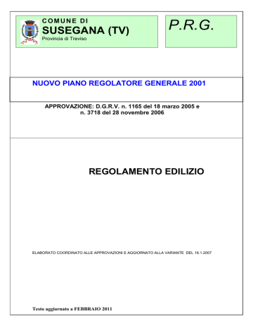 COMUNE DI SUSEGANA (TV) P.R.G. Provincia di Treviso NUOVO PIANO REGOLATORE GENERALE 2001 APPROVAZIONE: D.G.R.V. n. 1165 del 18 marzo 2005 e n. 3718 del 28 novembre 2006 REGOLAMENTO EDILIZIO ELABORATO COORDINATO ALLE APPROVAZIONI E AGGIORNATO ALLA VARIANTE DEL 16.1.2007 Testo aggiornato a FEBBRAIO 2011 COMUNE DI SUSEGANA REGOLAMENTO EDILIZIO COMUNALE Iter di approvazione del NUOVO PRG 2001 Delibera C.C.n. 3 del 13.2.2002 per adozione del nuovo Piano Regolatore Generale. Delibera C.C n. 19 del 31.3.2004 per controdeduzioni con modifiche alle osservazioni pervenute, ai sensi degli artt. 42 e 70 della L.R. n. 61/1985, con ripubblicazione del piano. Delibera C.C. n. 42 del 20.7.2004 per ulteriori controdeduzioni alle osservazioni pervenute a seguito della ripubblicazione del piano. Delibera G.R.V. n. 1165 del 18 marzo 2005 per approvazione del P.R.G. con modifiche d’ufficio ai sensi dell’art. 45 della L.R. 27/6/1985, n. 61 e con proposte di modifica ai sensi dell’art. 46 della medesima L.R.. Delibera C.C n. 41 del 11.08.2005 per controdeduzioni alle proposte di modifica della regione. Delibera C.C. n. 19 del 27.04.2006 per integrazione alla delibera di C.C. 41/2005 per sopravvenuto accordo con la ditta Maccari. Delibera C.C. n. 43 del 10.08. 2006 per rettifica per mero errore materiale Delibera G.R.V. n. 3718 in data 28 novembre 2006 per approvazione definitiva del nuovo P.R.G. Delibera C.C n. 6 del 06.02.2007 per correzioni errori materiali. VARIANTI PARZIALI 1. 2. 3. 4. 5. Delibera C.C. n. 24 del 16.05.2006 avente ad oggetto:”Variante parziale al P.R.G. vigente e al P.R.G. in via di approvazione regionale, ai sensi art. 50, comma 4, lettera l), L.R. n. 61/1985 per la modifica alle N.T.A., a seguito istanza della ditta Grifina S.r.l.: esame delle osservazioni e approvazione.” Delibera C.C. n. 41 del 10.08.2006 avente ad oggetto: “Variante parziale al P.R.G., ai sensi del comma 4, art. 18 L.R. n. 15/2004 per individuazione dei parchi commerciali: approvazione.” Delibera C.C. n. 42 del 10.08.2006 avente ad oggetto: “Variante parziale al P.R.G. vigente e al P.R.G. in via di approvazione regionale, ai sensi art. 50, comma 4, lett. b) L.R. n. 61/1985, per indicazioni progettuali puntuali relative a recupero immobili esistenti: approvazione.” Delibera C.C. n. 65 del 28.12.2006 avente ad oggetto: “Adozione variante parziale al P.R.G., ai sensi art. 50, comma 4, lett. f), L.R. 61/85, per la realizzazione del progetto della Provincia di Treviso di variante alla S.P. 38 F.Fabbri” Delibera C.C. n. 3 del 16.01.2007 avente ad oggetto: “Variante parziale al P.R.G., ai sensi art. 50, comma 4, lett. F, L.R. 61/85, per realizzazione piste ciclabili, marciapiede e opere complementari in via Mandre e via Colonna a Ponte della Priula: adozione” 2 COMUNE DI SUSEGANA REGOLAMENTO EDILIZIO COMUNALE Delibera C.C. n. 6 del 06.02.2007 avente ad oggetto: “Nuovo PRG 2001: correzione errori materiali.” 7. Delibera C.C. n. 18 del 08.03.2007 avente ad oggetto: “Variante parziale al P.R.G. ai sensi art. 50, comma 4, lett. f) L.R. n. 61/1985, per la realizzazione di piste ciclabili e opere complementari in via Mandre e via Colonna a Ponte della Priula: approvazione” 8. Delibera C.C. n. 15 del 06.03.2008 avente ad oggetto: “Riadozione variante parziale al P.R.G. ai sensi art. 50, comma 4, lett. f) e l) L.R. n. 61/1985, per la realizzazione del progetto della Provincia di Treviso di variante alla S.P. 38 F. Fabbri” 9. Delibera C.C. n. 16 del 06.03.2008 avente ad oggetto: “Nuovo P.R.G 2001: correzione errore materiale” 10. Delibera C.C. n. 24 del 31.03.2008 avente ad oggetto: “Nuovo P.R.G 2001: zone territoriali omogenee F/e “Aree per parcheggi pubblici a raso e/o multipiano ricomprese in ambito di strumenti urbanistici attuativi (SUA) Z.T:O. “D”: linee di indirizzo“ 11. Delibera C.C. n. 41 del 15.07.2008 avente ad oggetto: “Variante parziale al P.R.G. ai sensi art. 50, comma 4, lett. f) e l) L.R. n. 61/1985, per la realizzazione del progetto della Provincia di Treviso di variante alla S.P. 38 F. Fabbri: approvazione” 12. Delibera C.C. n. 44 del 15.07.2008 avente ad oggetto: “Nuovo P.R.G 2001: correzione errore materiale” 13. Delibera C.C. n. 56 del 30.09.2008 avente ad oggetto: “Variante parziale al P.R.G. ai sensi art. 50, comma 4, lett. f) L.R. n. 61/1985, per la realizzazione pista ciclabile di Colfosco: adozione” 14. Delibera C.C. n. 65 del 27.11.2008 avente ad oggetto: “Variante parziale al P.R.G. ai sensi art. 50, comma 4, lett. f) L.R. n. 61/1985, per la realizzazione pista ciclabile di Colfosco: approvazione” 15. Delibera C.C. n. 18 del 28.04.2009 avente ad oggetto: “Adozione variante parziale al P.R.G. per modifica alle norme tecniche di attuazione e al regolamento edilizio comunale” 16. Delibera C.C. n. 19 del 28.04.2009 avente ad oggetto: “Correzione di errore materiale al vigente Piano Regolatore Generale.” 17. Delibera C.C. n. 32 del 06.08.2009 avente ad oggetto: “Approvazione variante parziale al PRG per modifica alle Norme Tecniche di Attuazione e al Regolamento Edilizio comunale” 18. Delibera C.C. n. 43 del 12.11.2009 avente ad oggetto: “Individuazione limiti e modalità applicative della L.R. 8.7.2009, N. 14 relativa al piano casa.” 19. Delibera C.C. n. 45 del 12.11.2009 avente ad oggetto: “Presa d'atto variante urbanistica conseguente a dichiarazione di pubblica utilità dei lavori di ampliamento della centrale Edison Collalto.” 6. 3 COMUNE DI SUSEGANA REGOLAMENTO EDILIZIO COMUNALE Delibera C.C. n. 6 del 23.02.2010 avente ad oggetto: “Rettifica deliberazione consiliare n. 43/2009 avente ad oggetto "individuazione limiti e modalita' applicative della l.r. 8.7.2009, n. 14 relativa al cd. piano casa"” 21. Delibera C.C. n. 19 del 29.06.2010 avente ad oggetto: “Adozione Variante al P.R.G. per modifica alle Norme Tecniche di Attuazione e per realizzazione rotatoria sulla SS 13 a Ponte della Priula.” 22. Delibera C.C. n. 