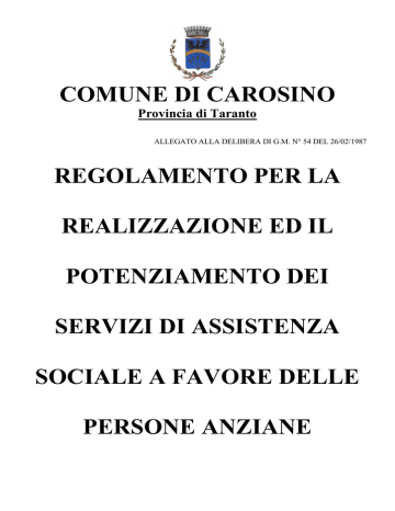 COMUNE DI CAROSINO Provincia di Taranto ALLEGATO ALLA DELIBERA DI G.M. N° 54 DEL 26/02/1987 REGOLAMENTO PER LA REALIZZAZIONE ED IL POTENZIAMENTO DEI SERVIZI DI ASSISTENZA SOCIALE A FAVORE DELLE PERSONE ANZIANE PREMESSO che gli anziani residenti in questo Comune sono circa 1.100 unità (inclusi gli invalidi che non esercitano attività lavorativa) pari oltre al 200% della popolazione residente. CONSIDERATO che il 45% di detta fascia sociale é percettrice di pensioni minime e che il 15% sono casalinghe ancora non ai limiti di età pensionabile,si evince quanto sia necessario formulare un programma concreto nella sua rigorosa possibilità d'intervento nel sociale. QUESTO Comune svolge da sempre una assistenza di tipo generale e non per settori,atta a risolvere situazioni pregiudizievoli alle condizioni del cittadino. Assistenza di SETTORE é stata realizzata per gli anni 1980/86 con l'intervento e favore degli anziani per soggiorni climatici estivi,che hanno avuto pieno soddisfacimento da parte degli anziani,ma che al tempo stesso non ha potuto soddisfare tutte le richieste in tal senso pervenute all'Amministrazione. L’insufficienza per qualità e quantità dei servizi prestati in passato in relazione soprattutto alle ristrettezze dei bilanci comunali e all'ineguatezza dei contributi regionali rende necessario uno sforzo per qualificare un impegno programmatico dell' Amministrazione che intende a tal uopo far fronte anche con oneri propri gravanti sul nuovo bilancio dì previsione in corso di formazione. Si propone pertanto il programma comunale elaborato per il 1987 che conferma,con parziali modifiche,quello precedente. PROGRAMMA COMUNALE Art. 1 Il Comune di Carosino poiché intende realizzare dei Servizi Sociali di base a favore dell'intera comunità,ha elaborato un programma per la realizzazione ed il potenziamento dei Servizi di Assistenza Sociale in favore delle persone anziane,anche per l'anno 1987. Art. 2 All'erogazione ed all'organizzazione dei servizi é preposto l'Assessorato ai Servizi Sociali d'intesa con la Giunta Municipale. Art. 3 Soggetti per questo tipo di intervento sono gli anziani che abbiano compiuto se maschi il 60° anno di età e 55° anno se donne,fatta eccezione per gli invalidi che non esercitano o non possono esercitare attività lavorative (art. 16 L.R. 49/81) Art. 4 I servizi che si vogliono realizzare in favore degli anziani comprendono: 1. a) b) c) d) e) f) SERVIZI APERTI: Segretariato Sociale; Assistenza economica; Assistenza abitativa; Assistenza domiciliare; Assistenza ambulatoriale; Centro aperto Polivalente. 2. SERVIZI RESIDENZIALI: a) Soggiorni climatici di vacanza e di cura; b) Case – alloggi - albergo. Art. 5 IL SEGRETARIATO SOCIALE: comprende l'opera di informazione,orientamento e assistenza per le fruizioni dei vari servizi e delle relative norme proceduali. Per lo svolgimento di tale mansione si procederà al convenzionamento di personale qualificato (assistenti sociali,educatori di comunità ecc.) tramite cooperative di giovani ai sensi dell'art. 15 della L.R. n° 9 del 26/3/1985. Art. 6 ASSISTENZA ECONOMICA:consiste nell'erogazione di contributi straordinari, senza offendere la dignità dell'anziano,che mutino o sanino elementi peggiorativi della vita e evitino allo stesso il ricovero in Istituti. Detti contributi hanno carattere di tempestività e temporaneità in generale;possono essere continuativi se lo stato di indigenza é tale da non farlo vivere nel sociale. Le pratiche relative saranno svolte dagli uffici comunali competenti. Art. 7 ASSISTENZA ABITATIVA:esistono casi di anziani che vivono in abitazioni quasi fatiscenti e prive del benché minimo confort. Pertanto questo tipo di assistenze consiste in interventi di manutenzione e di miglioramento della struttura abitativa privilegiando i servizi igienici e l'allacciamento della rete idrica e fognante. Sono previsti inizialmente n. 5 interventi con una spesa di £. 2.000.000 per nucleo familiare da attuarsi sotto la responsabilità e la direzione degli uffici competenti del comune. Art. 8 ASSISTENZA DOMICILIARE: Servizio domiciliare prevede le seguenti prestazioni: a) di tipo domestico; • governo della casa; • lavaggio della biancheria; • preparazione dei pasti Caldi. b) di tipo igienico - sanitario ed infermieristico (con la guida del medico curante): • aiuto per l'igiene personale, anche per le persone costrette temporaneamente a letto; • controllo sulle condizioni igieniche dell'ambiente; • somministrazione dei medicinali; • medicazioni; • controllo terapie; • informazioni di educazione igienica. c) di carattere socio - assistenziale: • aiuto per disbrigo pratiche amministrative; • accompagnamento presso enti od amministrazioni per la risoluzione di problemi di rilevanza sociale; • cura dei rapporti con i familiari e la comunità; • occupazione del tempo libero,attività ricreativo - culturali,soprattutto con i centri di vita associativa presenti nel territorio. Le figure professionali richieste a svolgere le mansioni corrispondenti a queste prestazioni sono: N° 1 Assistente Sociale che si interesserà di: • diagnosi e terapia del bisogno; • • • indagine socio - familiare; coordinamento delle prestazioni; valutazione sull'andamento del servizio ed eventuali suggerimenti. N° 1 Infermiere, per le prestazioni di tipo igienico - sanitario ed infermieristico. N° 2 Collaboratori domestici per le prestazioni di tipo domestico, compreso l'accompagnamento per la riscossione della pensione o per altre commissioni per le quali non sia necessaria una competenza specifica. All'erogazione delle prestazioni necessarie per l'espletamento del servizio si provvederà con convenzioni ai sensi dell'art. 15 della legge regionale N° 9/85. Art. 9 ASSISTENZA AMBULATORIALE GERIATRICA Tale servizio finalizzato alla prevenzione e riabilitazione nell'ambito delle funzioni del centro aperto polivalente deve disporre di mezzo di trasporto. All'erogazione delle prestazioni 