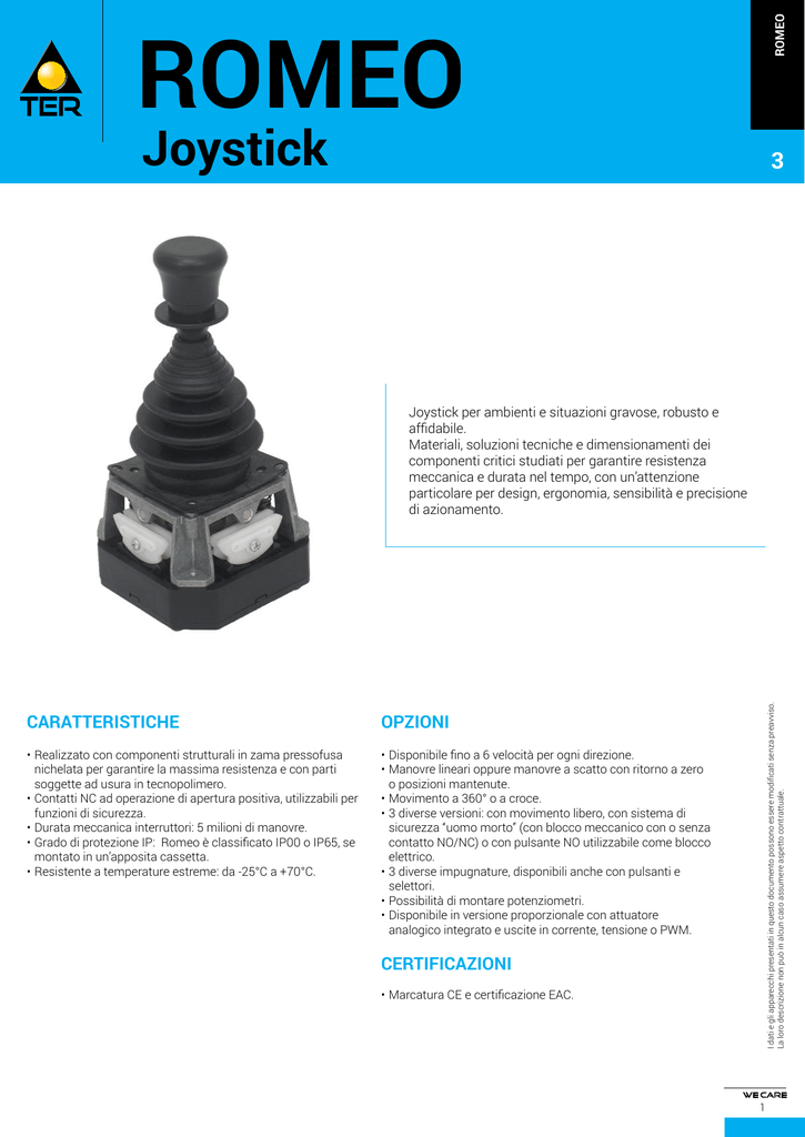 ROMEO ROMEO Joystick 3 CaRattERistiChE OpziOni •Realizzatoconcomponentistrutturaliinzamapressofusa nichelatapergarantirelamassimaresistenzaeconparti soggetteadusuraintecnopolimero. •ContattiNCadoperazionediaperturapositiva,utilizzabiliper funzionidisicurezza. •Duratameccanicainterruttori:5milionidimanovre. •GradodiprotezioneIP:RomeoèclassiicatoIP00oIP65,se montatoinun appositacassetta. •Resistenteatemperatureestreme:da-25°Ca+70°C. •Disponibileinoa6velocitàperognidirezione. •Manovrelinearioppuremanovreascattoconritornoazero oposizionimantenute. •Movimentoa360°oacroce. •3diverseversioni:conmovimentolibero,consistemadi sicurezza uomomorto (conbloccomeccanicoconosenza contattoNO/NC)oconpulsanteNOutilizzabilecomeblocco elettrico. •3diverseimpugnature,disponibiliancheconpulsantie selettori. •Possibilitàdimontarepotenziometri. •Disponibileinversioneproporzionaleconattuatore analogicointegratoeusciteincorrente,tensioneoPWM. CERtiFiCaziOni •MarcaturaCEecertiicazioneEAC. Idatiegliapparecchipresentatiinquestodocumentopossonoesseremodiicatisenzapreavviso. Lalorodescrizionenonpuòinalcuncasoassumereaspettocontrattuale. Joystickperambientiesituazionigravose,robustoe afidabile. Materiali,soluzionitecnicheedimensionamentidei componenticriticistudiatipergarantireresistenza meccanicaedurataneltempo,conun attenzione particolareperdesign,ergonomia,sensibilitàeprecisione diazionamento. 1 ROMEO CERtiFiCaziOni Conformità alle Direttive Comunitarie 2014/35/UE Direttiva bassa tensione 2006/42/CE Direttiva macchine EN 60204-1 Sicurezza del macchinario - Equipaggiamento elettrico delle macchine EN 60947-1 Apparecchiature a bassa tensione 3 Conformità alle Norme CE EN 60947-5-1 Apparecchiature a bassa tensione - Dispositivi per circuiti di comando ed elementi di manovra - Dispositivi elettromeccanici per circuiti di comando EN 61000-6-2 Compatibilità elettromagnetica - Norma generica sull’immunità - Ambiente industriale EN 61000-6-3 Compatibilità elettromagnetica - Norma generica sull’emissione - Ambienti residenziali, commerciali e dell’industria leggera Marcature e omologazioni C CaRattERistiChE tECniChE gEnERali Temperatura ambiente Immagazzinaggio -40°C/+70°C Funzionamento -25°C/+70°C Grado di protezione IP IP 00 (IP 65 max. in apposita cassetta) Categoria di isolamento Classe I Posizioni di funzionamento Tutte le posizioni CaRattERistiChE tECniChE dEi MiCROintERRUttORi Codice PRVV0804PE Categoria di impiego AC 15 Tensione nominale di impiego 48 Vac Corrente nominale di impiego 2A Altri impieghi elettrici di manovra Carico induttivo 125 Vac/1 A 250 Vac/0,5 A 30 Vdc/1 A Carico resistivo 125 Vac/3 A 250 Vac/2 A 30 Vdc/3 A Corrente nominale termica 8A Tensione nominale di isolamento 60 Vac Durata meccanica 5x106 manovre Connessioni Morsetto con vite serrailo Capacità di serraggio 0,2 mm2 - 2,5 mm2 Coppia di serraggio 0,5 Nm - 0,6 Nm Tipo interruttore Singola rottura Contatti 1NO+1NC in scambio (Tutti i contatti NC sono ad operazione di apertura positiva 2 4 Schema 1 Marcature e omologazioni 2 Cc ) ROMEO CaRattERistiChE tECniChE dEi pUlsanti Codice PRVV5019PE PRVV5020PE PRVV5080PE Colore Verde Nero Verde Carico resistivo 32 Vac/400 mA Carico resistivo 50 Vdc/100 mA Carico resistivo 125 Vac/125 mA Corrente nominale contatto Carico resistivo 28 Vdc/5 A 50 mΩ Resistenza dei contatti 6 1x10 manovre 1x10 manovre Contatti 1NO 1NO Marcature e omologazioni C C Durata meccanica 3 - 6 CaRattERistiChE tECniChE dEi pOtEnziOMEtRi Codice PRVV9020PE PRVV9025PE PRVV9035PE 10 kΩ 2,2 kΩ 4,7 kΩ Valore ohmico ±0,25% Linearità indipendente (rif. AEA -3°) Durata 3x106 rotazioni Temperatura ambiente di funzionamento -55°C/+125°C Angolo meccanico 360° continuo 355°±5° Angolo elettrico effettivo ±5% Tolleranza valore ohmico < 50 PPM/°C Deriva termica 4W Potenza dissipata CaRattERistiChE tECniChE di ROMEO pROpORziOnalE Alimentazione 12 ÷ 48 Vac/dc 2 uscite in tensione: 0 ÷ +10 Vdc Uscite proporzionali 2 uscite in corrente: 4 ÷ 20 mA 2 uscite PWM: 0 ÷100% D.C. (freq=1KHz) Risoluzione 10 bit 4 microinterruttori direzionali Carico induttivo 48 Vac/2 A 125 Vac/1 A 250 Vac/0,5 A 30 Vdc/1 A Carico resistivo 125 Vac/3 A 250 Vac/2 A 30 Vdc/3 A Connessioni Morsetto con vite serrailo Capacità di serraggio 0,2 mm2 - 2,5 mm2 Coppia di serraggio 0,5 Nm - 0,6 Nm 3 ROMEO diMEnsiOni di ingOMbRO (mm) Con pomolo Ø40 32° Ø61 per foro piastra di fissaggio 32° 79 216 222,5 137 3 100 Ø6 Ø7 1 4 100 n°4 fori Ø5,5 per fissaggio 25 100 50 25 100 50 25 n°4 fori filettati M5 per fissaggio 50 50 25 100 Targhetta (disponibile a richiesta) Con potenziometro 32° Ø61 per foro piastra di fissaggio 32° 79 216 137 Ø40 100 Ø6 1 100 50 n°4 fori Ø5,5 per fissaggio Targhetta (disponibile a richiesta) 129,3 4 50 25 129,3 Ø7 4 79,3 50 25 n°4 fori filettati M5 per fissaggio 25 50 25 ROMEO Con impugnatura 55,5 15° 3 79 257 178 Ø61 per foro piastra di fissaggio n°4 fori Ø5,5 per fissaggio 100 25 50 25 50 n°4 fori filettati M5 per fissaggio 100 50 25 50 25 Ø6 1 100 100 108 Targhetta (disponibile a richiesta) Con impugnatura ergonomica 52 15° 79 281 202 Ø61 per foro piastra di fissaggio 100 50 100 25 50 141 100 25 50 100 n°4 fori Ø5,5 per fissaggio 25 50 25 n°4 fori filettati M5 per fissaggio Ø6 1 100 Targhetta (disponibile a richiesta) 5 ROMEO disEgnO EsplOsO tECniCO 3 1 1 42 55 43 2 41 4 54 56 44 45 40 57 67 65 46 66 5 46 3 64 47 53 53 1 6 50 52 51 63 7 6 67 58 39 7 62 68 39 38 38 37 36 36 8 61 34 35 35 9 39 10 34 34 11 33 11 49 10 11 12 31 13 32 32 13 31 32 36 38 10 35 12 12 13 13 13 59 32 13 32 12 31 31 32 12 31 31 12 14 30 30 30 48 29 15 28 29 29 19 15 28 16 15 17 16 18 27 28 17 16 18 27 17 18 27 19 11 11 19 11 19 21 21 21 20 26 22 22 25 25 22 25 24 23 6 60 ROMEO JOYstiCK standaRd TuttiijoystickRomeostandardsonoconmanovreascattoconritornoazeroehannomicrointerruttoriPRVV0804PE 2 4 concontatti1NO+1NCinscambio emorsettieranonestraibile. 1 Tipo impugnatura Direzione di movimento Codice 36