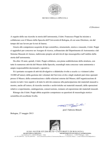 MUSEO DELLA SPECOLA il Direttore A seguito delle sue ricerche in storia dell’astronomia, il dott. Francesco Poppi ha iniziato a collaborare con il Museo della Specola dell’Università di Bologna, di cui sono Direttore, sin dal tempo del suo lavoro per la tesi di laurea. Grazie alle competenze acquisite di tipo scientifico, strumentale, storico e museale, il dott. Poppi si aggiudicò per concorso un Assegno di ricerca, cofinanziato dal Dipartimento di Astronomia e dal Sistema Museale di Ateneo, indirizzato proprio ad attività di tipo museografico nell’ambito della storia dell’astronomia. Da oltre 10 anni, quindi, il dott. Poppi collabora, con piena soddisfazione della struttura, con tutte le numerose attività del Museo della Specola, essendogli stata concessa vasta autonomia e ampie responsabilità decisionali e operative. Si è pertanto occupato di attività divulgative e didattiche rivolte a scuole e a visitatori (oltre 18.000 all’anno); della gestione dei volontari del Servizio civile e degli studenti part-time operanti presso il Museo; della comunicazione e delle relazioni esterne del Museo; dell’organizzazione di mostre in tutti i loro aspetti e di tutte le attività connesse alla partecipazione dei materiali museali a mostre, anche all’estero; di ricerche storiche e archivistiche sui materiali museali; delle operazioni relative a reperimento, catalogazione, conservazione, restauro ed esposizione dei materiali museali. Ritengo che il dott. Poppi abbia acquisito competenze su questioni di museologia storicoscientifica di eccellente livello. prof. Fabrizio Bònoli Bologna, 27 maggio 2013 ALMA MATER STUDIORUM • UNIVERSITÀ DI BOLOGNA MUSEO DELLA SPECOLA DIPARTIMENTO DI FISICA E ASTRONOMIA via Zamboni 33 – I-40126 Bologna – Italia via Ranzani 1 – I-40127 Bologna – Italia tel. 051.2095701 – fax 051.2095700 – www.astronomia.unibo.it/Astronomia/Risorse+e+strutture/Musei – e-mail: [email protected]