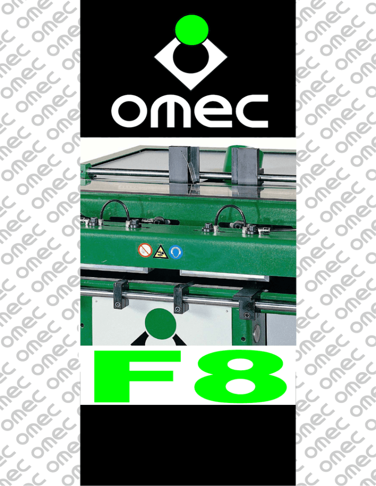 F8 FRESATRICE AUTOMATICA PER INCASTRI A CODA DI RONDINE AUTOMATIC MACHINE FOR DOVETAIL JOINTS FRAISEUSE AUTOMATIQUE POUR EMBOÎTEMENTS EN QUEUE D’ARONDE AUTOMATISCHE FRÄSMASCHINE FÜR SCHWALBENSCHWANZFÖRMIGE ÜBERBLATTUNGEN FRESADORA AUTOMÁTICA PARA ENSAMBLADURAS POR COLA DE MILANO I DESCRIZIONE DELLA MACCHINA La fresatrice multipla Omec F8 è utilizzata per la realizzazione di incastri a coda di rondine su cassetti e parti varie di mobili. La macchina è corredata di un gruppo di otto mandrini con frese uguali che permettono la realizzazione di incastri con altezze diverse. La macchina può lavorare pezzi singoli maschio, femmina, e maschio-femmina contemporaneamente in modo manuale; pezzi maschio-femmina in modo automatico. Il bloccaggio dei pezzi avviene in modo automatico ad ogni inizio ciclo; lo stesso avviene per lo sbloccaggio dei pezzi ad ogni fine ciclo. I comandi sono realizzati con un pannello di controllo a bordo macchina. Il modello F8 è comandato da un controllore programmabile (PLC) a cui è affidata la gestione del ciclo di lavorazione. GB MACHINE DESCRIPTION The multiple milling machine Omec F8 is utilised to indent dovetails for drawers and various furniture elements. The machine is equipped with a unit of eight spindles with equal mill cutters that allow the production of indents of different heights. The machine can cut single male or female workpieces, or both simultaneously in manual mode and male-female pieces automatically. The locking of the pieces takes place automatically at the beginning of each cycle. The same takes place for the release of the pieces at the end of each cycle. Controls are located on a built-in control panel. The F8 model is controlled by a programmable controller (PLC) which is entrusted with the working cycle control. L'INCASTRO A CODA DI RONDINE L'incastro a coda di rondine, peculiarità esclusiva delle nostre fresatrici, consente un accoppiamento stabile nel tempo delle varie parti di cassetti o mobili. Il vantaggio di questa lavorazione è quello di garantire un aumento del livello qualitativo al prodotto finale, che con questo tipo di lavorazione, automaticamente si valorizza, gravando marginalmente sul costo del prodotto finale. DOVETAIL JOINTS The dovetail, an exclusive feature of our routig machines, provides a lasting joint in the various component parts of boxes, drawers or other items of furniture. With this type of joinery, finer quality in the finished item is guaranteed and the final product automatically increases in value, thereby marginally influencing its cost. F DESCRIPTION DE LA MACHINE L'ENCASTREMENT EN QUEUE D'ARONDE L'encastrement en queue d'aronde, particularité exclusive de nos fraiseuses, permet d'effectuer un accouplement stable dans le temps les différentes parties des tiroirs et des meubles. L'avantage de cette réalisation est de garantir une augmentation du niveau qualitatif du produit final qui, avec ce type d'exécution, se met automatiquement en valeur, en pesant peu sur le cout du produit final. D BESCHREIBUNG DER MASCHINE DIE SCHWALBENSCHWANZVERBINDUNG Die Schwalbenschwanzverbindung, exklusives Merkmal unserer Frasmaschinen, gewahrt eine dauerhafte Verbindung der verschiedenen Schubladen - oder Mobelelemente. Der Vorteil dieser Bearbeitung besteht darin, dass durch sie der qualitative Standard des Endprodukts angehoben wird, das hierdurch automatisch eine Auf-wertung erfahrt, die sich in nur unerheblicher Weise auf den Endpreis niederschlagt. E DESCRIPCIÓN DE LA MÁQUINA ENSAMBLADURA DE COLA DE MILANO La ensambladura de cola de milano, peculiaridad exclusiva de nuestras fresadoras, garantiza un acoplamiento estable de las diferentes partes de los cajones y muebles. Este mètodo tiene la ventaja de garantizar un aumento del nivel de calidad del producto final que, con este tipo de trabajo, se revaloriza automaticamente y afecta minimamente el coste final del producto. La fraiseuse multiple Omec F8 est utilisée pour la réalisation d'emboîtements en queue d'aronde sur des tiroirs ou diverses parties de meubles. La machine est équipée d'un groupe de huit mandrins avec fraises identiques qui permettent la réalisation d'emboîtements de différentes hauteurs. La machine peut façonner individuellement des pièces mâles, femelles et de manière contemporaine mâles-femelles en manuel, des pièces mâles-femelles en automatique. Le blocage des pièces est effectué en automatique à chaque début de cycle; de même pour le déblocage des pièces à chaque fin de cycle. Les commandes s'effectuent à l'aide d'un panneau de contrôle situé sur la machine. Le modèle F8 est commandé par un contrôleur programmable (PLC) auquel la gestion du cycle de travail est confiée. Die Mehrspindel-Fräsmaschine Omec F8 ist für die Herstellung von Zinken an Schubladen und sämtlichen Möbelteilen geeignet. Die Maschine ist mit einem Satz von acht Spindeln mit gleichen Fräsern ausgestattet, die das Herstellen von Zinken in verschiedenen Höhen gewährleistet. Die Maschine kann entweder einzelne Zacken bzw. Aussparungen oder auch gleichzeitig Zacken und Aussparungen manuell bearbeiten. Die Bearbeitung von Zacken-Aussparungen kann automatisch erfolgen. Die Werkstückeinspannung erfolgt automatisch bei jedem Zyklusbeginn. Ebenfalls automatisch erfolgt das Lösen der Werkstücke bei Zyklusende. Die Steuerungen befinden sich auf der Schalttafel an der Maschine. Das Modell F8 wird über eine speicherprogrammierbare Steuerung (SPS) kontrolliert, die den Arbeitszyklus steuert. La fresadora múltiple Omec F8 es empleada para fabricar ensambladuras por cola de milano en cajones y otras partes de muebles. La máquina es entregada con un grupo de ocho mandriles con fresas iguales que consienten la fabricación de ensambladuras de diferentes tamaños. La máquina puede fabricar piezas por separado macho o hembra o bien macho y hembra a la vez de forma manual; piezas macho - hembra de forma automática. El bloqueo de las pie