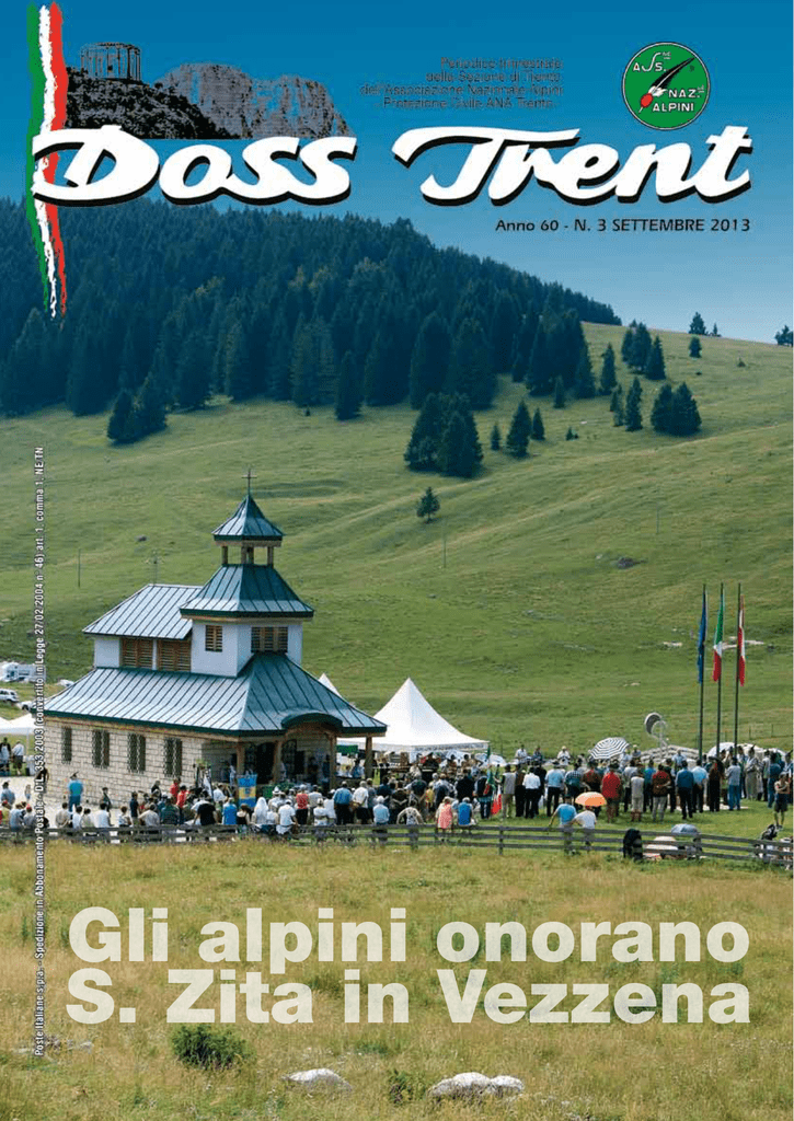 Gli alpini onorano S. Zita in Vezzena 2 n. 3 / settembre 2013 La Presidenza Informa a cura di Aurelio De Maria - All’inaugurazione della scuola materna “M.O.V.M.” Anelio Franzoni, avvenuta a Cusumaro (FE) il giorno 1° giugno, la Sezione Ana trentina è stata rappresentata dal suo Presidente Maurizio Pinamonti, dal Vice Presidente Attilio Martini, dal Consigliere Nazionale Roberto Bertuol e da Ferdinando Carretta con Vessillo. Direttore responsabile: Roberto Gerola Sezione Ana - Trento - Vicolo Benassuti, 1 Tel. 985246 - Fax 230235 - [email protected] Repertorio ROC n. 22507 In redazione: Collaboratore: Guido Vettorazzo, Componenti: Giancarlo Angelini, Lorenzo Bettega, Enrico de Aliprandini, Giorgio Debiasi, Aurelio De Maria, Ivan Giovannini, Bruno Lucchini, Renzo Merler, Alberto Penasa, Marino Sandri, Paolo Zanlucchi Stampa: Litotipografia Alcione - Lavis (TN) - Il 26 giugno, come consuetudine, la comunità cristiana trentina ha celebrato la solennità di S. Vigilio, Patrono della Diocesi della città. Presente il Cardinale Angelo Sodano. La celebrazione della Messa ha avuto luogo nel Duomo di Trento e officiata dall’Arcivescovo Luigi Bressan. La Sezione Ana è stata rappresentata dal Presidente Maurizio Pinamonti al quale è pervenuto l’invito personale. - In occasione della riccorenza della festa del 5° Reggimento Alpini a ricordo dei fatti d’arma di Monte Fior - Castelgamberto del 1916, celebrata alla Casema Menini - De Caroli il 6 giugno, la Sezione Ana è stata rappresentata dal Vice Presidente Marino Sandri e da Ferdinando Carretta con Vessillo. - Il giorno 11 giugno alla Casema Pizzolato di Trento è stata celebrata la S. Messa per il Capitano dei Bersaglieri Giuseppe La Rosa caduto in Afghanistan. La Sezione era rappresentata dal Vice Presidente Attilio Martini da Ferdinando Carretta con Vessillo e da una nutrita delegazione di alpini con il gagliardetto del Gruppo. - Le onoranze funebri al Presidente Nazionale Nardo Caprioli sono state celebrate a Bergamo giovedì 4 luglio nel Piazzale Alpini nella Chiesa di S. Maria delle Grazie. La Sezione è stata rappresentata dal Vice Presidente Attilio Martini e Ferdinando Carretta con Vessillo. - Il Comando Truppe Alpine ha organizzato, al termine dei corsi alpinistici primaverili, l’esercitazione “Falzarego”. L’esercitazione s’è svolta nello scenario storico - naturale delle Torri del Falzarego il giorno 11 luglio. La Sezione era presente con Ferdinando Carretta e il Vessillo sezionale e gli alpini Tarcisio Parolin e Stefano Carotta. - Nella Caserma Huber di Bolzano il giorno 2 agosto s’è svolta la cerimonia di cessione del Reparto Comando e Supporti Tattici della Tridentina da parte del Ten. Col. Ugo Biasiotto. Il Presidente della Sezione Ana di Trento Maurizio Pinamonti, il Vice Presidente Attilio Martini e Ferdinando Carretta con Vessillo hanno preso parte alla cerimonia. - Nel 70° anniversario del bombardamento della Portela, organizzato dal Comune di Trento, il Presidente della Sezione Ana Maurizio Pinamonti, Ferdinando Carretta con il Vessillo e i Gruppi Ana di Rovereto e Volano con i rispettivi gagliardetti hanno preso parte alla commemorazione avvenuta il 2 settembre. REGOLE PER INVIARE MATERIALE AL DOSS TRENT Per poter confezionare al meglio il nostro periodico, si chiede un po’ di collaborazione agli estensori delle cronache di eventi e in particolare da parte dei Gruppi. Questo perché troppo spesso non vengono rispettate alcune regole fondamentali. Per esempio: – Le notizie devono passare al vaglio del capogruppo (o delegato). – Corredare l’articolo possibilmente con foto (non di pranzi o convivi). – Ogni evento è utile da inserire nel settore “cronache dai gruppi”. Si raccomanda di non inviare elenchi di manifestazioni (tipo bilancio di un anno fatto durante l’assemblea), ma inviare le singole manifestazioni durante l’anno e non aspettare l’ultimo momento. In ogni numero è pubblicato il termine entro il quale si riceve il materiale. – Il materiale inviato: lo scritto e la foto vanno consegnati in Sezione (su carta o su cd, non su floppy) con telefono di recapito. Se consegnata a mano o inviata per posta la foto deve riportare sul retro la località. Le notizie possono essere inviate preferibilmente per e-mail: foto e testo separati. Tenere presente che lo scritto va inviato in “docx” e le foto in “jpg”, "tif" o “pdf” alla casella postale della sezione: [email protected] indicando nell’oggetto Doss Trent. – Occorre essere chiari specificando nome e cognome di eventuali personaggi. – In caso di manifestazioni importanti, incaricare qualcuno di fiducia per redigere l’articolo e scattare le foto, e inviare il tutto subito dopo l’evento e non attendere mesi. Le uscite del Doss Trent sono periodiche. Non si vuole pubblicare la notizia di un anno fa o dell’inverno passato. Rispettare i periodi di uscita. – Si pubblicano volentieri matrimoni, anniversari, nascite o decessi. Solo se accompagnata da offerta al Doss Trent. – Non si accettano articoli di giornale (da ricopiare) e fotocopie di foto. Non inviare le foto ricavate dalla stampante perché impubblicabili. Un minimo di collaborazione significa anche pochi minuti per scrivere la cronaca dell’evento e inviarla in Sezione. IL PROSSIMO NUMERO USCIRÀ IN DICEMBRE. LE NOTIZIE VANNO SPEDITE ENTRO IL 30 NOVEMBRE 2013 RISPETTARE LA SCADENZA!!! IN COPERTINA La cerimonia in onore si S. Zita il 4 agosto scorso in Vezzena In ultima di copertina una panoramica della cerimionia in Adamello Questo numero è stato stampato in 24.500 copie dalla Litotipografia Editrice ALCIONE n. 3 / settembre 2013 Alpini in Adamello nel 50° 3 Nel segno della pace e nel ricordo di Gianni De Giuli e di Papa Wojtyla G ianni De Giuli e Papa Giovanni Paolo II° sono le due figure più evocate in questi giorni qui sull’Adamello. Il primo è stato tra gli ideatori del Pellegrinaggio, colui al quale è stata dedicata la 50ª edizione