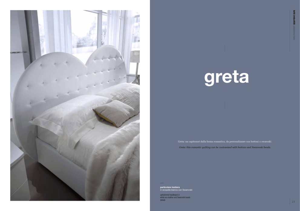 letti imbottiti upholstered beds greta Greta: un capitonné dalla forma romantica, da personalizzare con bottoni o swaroski. Greta: this romantic quilting can be customized with buttons and Swarovski beads. particolare testiera in ecopelle bianca con Swarovski upholstered headboard in white eco-leather and Swarovski beads (detail) 21 composizione 02 letto imbottito greta ecopelle bianco con Swarovski, gruppo dream bianco lucido, armadio 6 ante battente struttura e ante bianco lucido, maniglia kristal, specchiera onda make-up suggestion 02 upholstered greta bed in white eco-leather with Swarovski beads, gloss white dream chests, 6 hinged door wardrobe, gloss white carcass and doors, kristal handle, onda mirror 23 letti imbottiti upholstered beds greta particolari contenitore apribile (alto) e contenitore pratik (basso) comodino dream bianco lucido simple storage bed base detail (up) and pratik storage underbed with double lift option (down) gloss white dream bedside chest 25