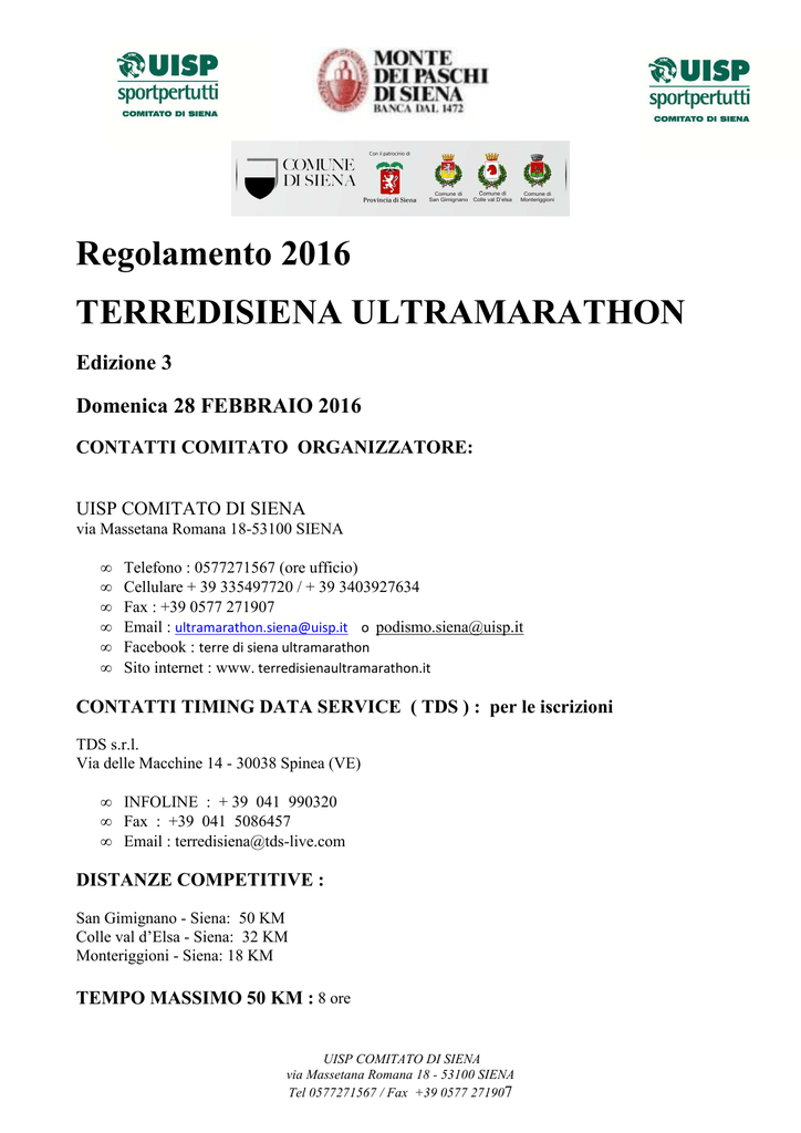 Regolamento 2016 TERREDISIENA ULTRAMARATHON Edizione 3 Domenica 28 FEBBRAIO 2016 CONTATTI COMITATO ORGANIZZATORE: UISP COMITATO DI SIENA via Massetana Romana 18-53100 SIENA • • • • • • Telefono : 0577271567 (ore ufficio) Cellulare + 39 335497720 / + 39 3403927634 Fax : +39 0577 271907 Email : [email protected] o [email protected] Facebook : terre di siena ultramarathon Sito internet : www. terredisienaultramarathon.it CONTATTI TIMING DATA SERVICE ( TDS ) : per le iscrizioni TDS s.r.l. Via delle Macchine 14 - 30038 Spinea (VE) • INFOLINE : + 39 041 990320 • Fax : +39 041 5086457 • Email : [email protected] DISTANZE COMPETITIVE : San Gimignano - Siena: 50 KM Colle val d’Elsa - Siena: 32 KM Monteriggioni - Siena: 18 KM TEMPO MASSIMO 50 KM : 8 ore UISP COMITATO DI SIENA via Massetana Romana 18 - 53100 SIENA Tel 0577271567 / Fax +39 0577 271907 DISTANZE NON COMPETITIVE : Passeggiata per le vie del centro storico di Siena : 6 KM La manifestazione si svolgerà in qualsiasi condizione atmosferica PARTENZE : SAN GIMIGNANO-SIENA (50 km) : Domenica 28 Febbraio 2016 ore 9.00 da Piazza Duomo (San Gimignano) con arrivo in Piazza Il Campo, Siena COLLE VAL D’ELSA- SIENA (32 km) : Domenica 28 Febbraio 2016 ore 9.30 da Piazza Arnolfo, Colle Val D’Elsa con arrivo in Piazza Il Campo, Siena MONTERIGGIONI -SIENA (18 km) : Domenica 28 Febbraio 2016 ore 10.00 dalla Piazza del Castello, Monteriggioni con arrivo in Piazza Il Campo, Siena PASSEGGIATA (6 km) : Domenica 28 Febbraio 2016 ore 10.00 da Piazza Il Campo, Siena, con arrivo stesso luogo. REQUISITI PER LA PARTECIPAZIONE Requisiti validi per la SAN GIMIGNANO-SIENA (50 km), COLLE VAL D’ELSA- SIENA (32 km) e MONTERIGGIONI -SIENA (18 km) : • 28 Febbraio 2016; per la 50 km. compimento del 20° anno di età al 28 Febbraio 2016 • 28 Febbraio 2016; per la 32 km e la 18 km compimento del 18° anno di età al 28 Febbraio 2016 • Tesseramento UISP in corso di validità al 28 Febbraio 2016 e certificato medico agonistico. • Per gli atleti non tesserati Italiani (residenti in Italia o all'estero), non tesserati stranieri (residenti in Italia) : certificato medico agonistico secondo le norme sanitarie vigenti in corso di validità al 28 Febbraio 2016 • I tesserati FIDAL e EPS (Enti di Promozione Sportiva) : oltre alla tessera valida, certificato medico agonistico secondo le norme sanitarie vigenti in corso di validità al 28 Febbraio 2016; in alternativa, elenco su carta intestata e timbro della società sportiva di appartenenza con dati anagrafici e numero di tessera degli atleti, a firma e responsabilità del Presidente • per gli atleti non tesserati stranieri e residenti all’estero: Health Form compilato da un medico competente del Paese di provenienza. **ATTENZIONE** NON SARANNO ACCETTATI CERTIFICATI CON LA DICITURA "PODISMO", "CORSA", "MARATONA", ecc. MA SOLO ED ESCLUSIVAMENTE "ATLETICA LEGGERA" UISP COMITATO DI SIENA via Massetana Romana 18 - 53100 SIENA Tel 0577271567 / Fax +39 0577 271907 Al ritiro del pettorale l’atleta dovrà presentare un valido documento d’identità. Invitiamo comunque tutti gli iscritti che avessero già inviato a TDS la documentazione della idoneità sportiva a portarci con sé tale documentazione qualora ci fosse bisogno di acquisirne nuovamente prova. Tutta la documentazione deve essere in corso di validità al 28 Febbraio 2016 Requisiti validi per la PASSEGGIATA PER LE VIE DI SIENA (6 km) • aperta a tutti ai sensi del decreto legge del Ministero della salute del 24/04/2013 sulla tutela sanitaria dello sport. MODALITA' D'ISCRIZIONE Valida per le distanze competitive: SAN GIMIGNANO-SIENA (50 km), COLLE VAL D’ELSASIENA (32 km) e MONTERIGGIONI -SIENA (18 km) (le iscrizioni, gestite da TDS, dovranno pervenire entro il (24/02) • via fax a TDS al n° +39 041 5086457 scaricando la scheda dal nostro sito internet o ricevuta per tramite della nostra newsletter. Obbligatorio inviare contestualmente via fax documentazione dell’avvenuto pagamento e della relativa documentazione sportiva (vedi i "Requisiti per la partecipazione ") • via internet : sul portale ENTERNOW (iscrizione online singola o multipla con pagamento con carta di credito o carta prepagata) • via posta a : TDS s.r.l. - Via delle Macchine 14 - 30038 Spinea (VE). Obbligatorio inviare contestualmente anche la documentazione dell’avvenuto pagamento e della documentazione sportiva (vedi i "Requisiti per la partecipazione ") Non sono ammesse iscrizioni di atleti non in regola con i "Requisiti per la partecipazione" e senza la ricevuta dell'avvenuto pagamento. UISP COMITATO DI SIENA via Massetana Romana 18 - 53100 SIENA Tel 0577271567 / Fax +39 0577 271907 Iscrizione per la non competitiva PASSEGGIATA PER LE VIE DI SIENA KM 6 • a Siena presso il Complesso Museale Santa Maria della Scala, piazza Duomo, Siena ( Expo della manifestazione) dalle ore 10:00 di Sabato 27 Febbraio 2016 • in alternativa il 28 Febbraio 2016 entro le ore 9:30 direttamente in P.zza Il Campo Siena (luogo di partenza) RITIRO PETTORALE, CHIP E PACCO GARA : Il pettorale, il chip ed il pacco gara dovranno essere ritirati personalmente a Siena presso il Complesso Museale Santa Maria della Scala, Piazza Duomo, ( Expo della manifestazione) dalle ore 10:00 del Sabato 27 Febbraio 2016 fino alle ore 20:00 TARIFFE Attenzione : la quota di iscrizione non è in alcun modo rimborsabile 1. SAN GIMIGNANO-SIENA (50 km) Entro il 31/01/2016 : 40,00 euro Dal 01/02/2016 e fino al 24/02/2016: 50,00 euro 2. COLLE VAL D’ELSA- SIENA (32 km) Entro il 31/01/2016: 30,00 euro Dal 01/02/2016 e fino al 24/02/2016: 40,00 euro 3. MONTERIGGIONI -SIENA (18 km) Entro il 31/01/2016: 20,00 euro Dal 01/02/2016 e fino al 24/02/2016: 30,00 euro • PASSEGGIATA PER LE VIE DI SIENA (6 km) 5,00 euro : pacco gara. Chiusura anticipata iscrizioni delle tre manifestazioni competitive al raggiungimento di 600 atleti ciascuna. Modalità di pagamento: 1. Inserire nella causale del bonifico NOME, COGNOME E L'