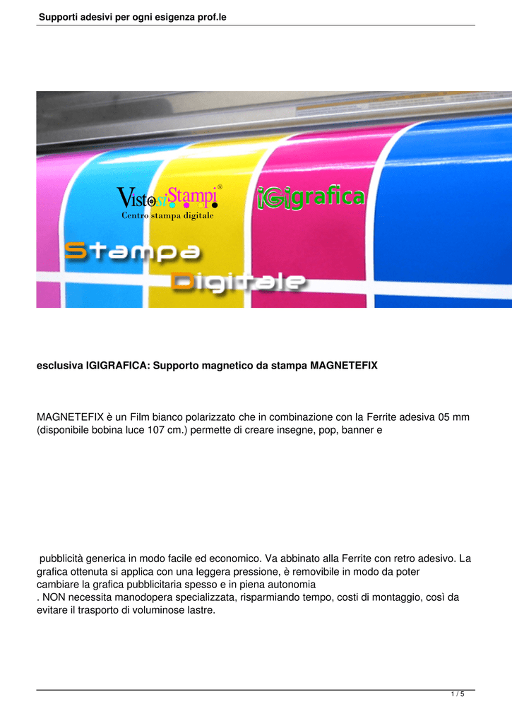 Supporti adesivi per ogni esigenza prof.le esclusiva IGIGRAFICA: Supporto magnetico da stampa MAGNETEFIX MAGNETEFIX è un Film bianco polarizzato che in combinazione con la Ferrite adesiva 05 mm (disponibile bobina luce 107 cm.) permette di creare insegne, pop, banner e pubblicità generica in modo facile ed economico. Va abbinato alla Ferrite con retro adesivo. La grafica ottenuta si applica con una leggera pressione, è removibile in modo da poter cambiare la grafica pubblicitaria spesso e in piena autonomia . NON necessita manodopera specializzata, risparmiando tempo, costi di montaggio, così da evitare il trasporto di voluminose lastre. 1/5 Supporti adesivi per ogni esigenza prof.le Pvc vinilico adesivo bianco lucido o matt Le sue interna vetrina. caratteristiche ed esterna, lo iniziare rendono dascenografie, ilunsupporto evento più duttile fino edall’arredamento per la comunicazione ditotem unoo stand, visiva negozio, segnaletica Viene per la cartellonistica, stampato interna, conad cartello inchiostri per creare stradale, EcoSolventi espositore eoutdoor ilsifondale assembla da terra di ouno ausato da pannelli spazio banco, pvc-forex fiera, targa, bacheca, lastra-piuma informativo, etc. particolari In offrendo generale una disidurata lunga tratta durata nel del tempo migliore della(oltre cromia materiale 5 anni) e laminato resistenza per è possibile decorare ai graffi applicare superfici ed aipiane una raggi calandratura oUV. leggermente Per necessità protettiva curve, PvC adesivo CAST e il CALPESTABILE antisdrucciolo 2/5 Supporti adesivi per ogni esigenza prof.le Il CAST èsuperficie, qualsiasi un supporto siamolto esso molto sottile curvo, iperconformabile rivettato o ricco utilizzato di sconnessioni, per il Total Covering come auto e si- adatta a - barca - ilgli bidone .... il pianoforte ecc. ecc. ilfurgone CALPESTABILE laminazione in EcoSolvent a che freddo è resistente conferisce anch'esso ai un ottima raggi vinile cromia. UV, bianco è anti-scivolo Viene dal collante protetto edaèda forte lavabile. specifico resistenza, pvc trasparente viene stampato con PvC trasparente per la È un adesivo visibilità. anche supporto perE'etichette utilizzato polimerico adesive perplance l'assemblaggio incolore, piccolissime consente su o creare giganti. plex perciò opalino l'applicazione realizzando su vetro insegne perluminose. lasciare intatta Ideale IGIGRAFICA dimensione, produce scontorna con plotter a quadricromia bassa per tiratura aadesivi costi dipersonalizzati produzione contenuti d'ogni sagoma e la 3/5 Supporti adesivi per ogni esigenza prof.le 4/5 Supporti adesivi per ogni esigenza prof.le Vinile polimerico "Traslucente" Utilizzato plex trasparente, per la pubblicità senza che sulavetrate e luce venga insegne annullata retro-illuminate: è traslucido e va assemblato su PvC adesione elettrostatica È particolare pellicola disponibile trasparente e bianca senza adesivo, l’elettrostaticità per essere applicata su che superfici lisce come vetro e riutilizzabile metallo. che utilizza Launa applicare di negozi caratteristica e adesivo aderisce rimuovere, principale sia non sul èlascia lato che fronte siresiduo stende dicon sul colla lato unmolto perchè panno, è riposizionabile, retro. è inesistente. E' quindi semplice su vetrine da ONE WAY per vetrate È un PvC adesivo acrilico removibile con retro nero. lunotto taxi, Viene posizionato la vetrina su superfici di negozio trasparenti, o la microforato finestra generalmente dell'ufficio. il vetro posteriore di bus, furgone, La grafica è limpidamente visibile dai passanti la commerciali strada. e non (difiltrare giorno) di vedere l’interno, mentre si controlla corporate Utile per di separare attività all’esterno permette visivamente gli permette ambienti inla fase "visuale di o vendita dall'interno" lapromozionale, luce del sole, per avendo ambienti però che una hanno necessità grafica 5/5