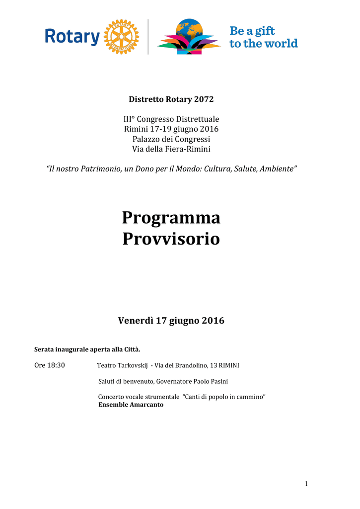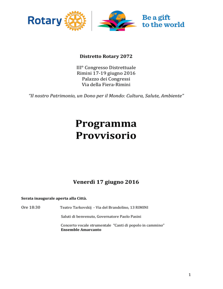 Distretto Rotary 2072 III° Congresso Distrettuale Rimini 17-19 giugno 2016 Palazzo dei Congressi Via della Fiera-Rimini “Il nostro Patrimonio, un Dono per il Mondo: Cultura, Salute, Ambiente” Programma Provvisorio Venerdì 17 giugno 2016 Serata inaugurale aperta alla Città. Ore 18:30 Teatro Tarkovskij - Via del Brandolino, 13 RIMINI Saluti di benvenuto, Governatore Paolo Pasini Concerto vocale strumentale “Canti di popolo in cammino” Ensemble Amarcanto 1 Sabato 18 giugno 2016 Ore 8:30 Apertura segreteria, registrazioni Ore 9:45 Onore alle Bandiere Saluti delle Istituzioni: Stefano Bonaccini , Presidente della Regione Emilia Romagna Peg Strano Materia, Prefetto di Rimini E’ stato invitato il Sindaco di Rimini Andrea Gnassi. Ore 10:15 Intervento introduttivo Paolo Pasini, Governatore del Distretto 2072 “Il nostro Patrimonio, un Dono per il Mondo. Cultura, Salute e Ambiente” - Ore 10:45 Sen. Elena Cattaneo, Direttore del Laboratorio di Biologia delle Cellule Staminali e Farmacologia delle Malattie Neurodegenerative Dipartimento di Bioscienze e Direttore di UniStem, Centro di Ricerche sulle Cellule Staminali dell’Università di Milano. “Le frontiere della ricerca sulle malattie genetiche: più che una speranza.” Nicoletta Previsani, coordinatrice OMS Global Eradication Polio Initiative, Ginevra. “OMS e Rotary insieme per sconfiggere la Polio” Ore 11:45 Carlo Michelotti, Rappresentante del Presidente Internazionale Ore 12:30 On.le Ilaria Borletti Buitoni, Sottosegretario di Stato, Ministero dei beni e delle attività culturali e del turismo. Intervento - Premiazione dei vincitori Concorso Rotary "Cultura e Patrimonio" On.le Ilaria Borletti Buitoni, Presidente CARIM Sido Bonfatti, DGD Paolo Bolzani Ore 13:15 Lunch- Palazzo dei Congressi Rimini Ore 14:30 I Global Grant dei nostri Club: Nigeria, Zambia e Nepal. - Leonardo de Angelis, Presidente Commissione Rotary Foundation - Alda Gemmani, Direttore medico St. Kizito Clinic, Lagos - Nigeria - Claudia Caracciolo, Direttore Chikuni Mission Hospital, Monze Zambia - Paolo Morselli progetto Nepal Ore 14:30 Programma accompagnatori. Visita e percorsi nella città di Rimini. Ore 16:00 PDG Italo Minguzzi: “Giovani e Rotary: la certezza di una speranza” - Fabrizio Pullè, Presidente sottocommissione Rotary-Rotaract - Maria Cristina Camilloni, Commissione Scambio Giovani - Davide Zanghi RD Rotaract - Distretto 2072 Ore 17:30 Conclusione dei lavori Ore 20:15 Cena di Gala, Palazzo dei Congressi, Rimini 2 Domenica 19 giugno 2016 Ore 8:00 Santa Messa, Chiesa San Girolamo, Rimini Ore 9:30 Inizio dei lavori Palazzo dei Congressi Rimini Onore alle Bandiere Ore 9:45 Saluti Autorità rotariane: DGE Franco Venturi DGN Maurizio Marcialis DGD Paolo Bolzani Ore 10:00 Introduzione del Governatore Paolo Pasini Ore 10:15 Filmato “Un anno di progetti” i Club del Distretto 2072 Ore 10:30 Bruno Modafferi presenta Lia Fabbri Presidente Nazionale ANIEP: “Dopo la Polio: coraggio e impegno” Ore 11:00 Luigi Benassi, Club Rotary Parma “Ebola dimenticato, ma non dal Rotary” Ore 11:15 Philippe Pypaert – UNESCO Fausto Giovanelli – Parco Nazionale Appennino Tosco-Emiliano Il Programma UNESCO “L’Uomo e la Biosfera” (MAB) e le Riserve della Biosfera in Emilia Romagna: Il Delta del Po e l’Appennino Tosco-Emiliano” Ore 11:40 Carlo Michelotti, Rappresentante del Presidente Internazionale Ore 12:10 Paolo Pasini, Governatore Distretto 2072: consegna premi e onorificenze., Premiazione vincitori gara di Golf. Ore 12:50 Conclusioni, Governatore Paolo Pasini Passaggio del Collare Paolo Pasini, Governatore 2015-2016 consegna il collare a Franco Venturi, Governatore 2016-2017 Ore 13:10 Termine dei lavori e chiusura del Congresso Ore 13:15 Lunch - Palazzo dei Congressi Rimini 3 DISTRETTO ROTARY 2072 Programma accompagnatori Sabato 18 giugno 2016 Ore 9,45-13 Partecipazione ai lavori - III Congresso Rotary Distretto 2072 Palazzo dei Congressi, Rimini Ore 13:00 Lunch – Palazzo dei Congressi di Rimini Ore 14:30 Visita al Centro storico di Rimini - itinerari: 1) La città romana di Ariminum 2) I Malatesta signori di Rimini Ore 17,30 Rientro in Hotel Ore 20:15 Cena di Gala, Palazzo dei Congressi di Rimini Scegli l’itinerario sulla scheda di partecipazione del Congresso 1) La città romana di Ariminum 2) I Malatesta Signori di Rimini N.B. La visita alla città di Rimini sarà effettuata a piedi. Il Palazzo dei Congressi si trova vicino il centro della città Si consiglia un abbigliamento comodo. Descrizione itinerari 1) La città romana di Ariminum Arco d’Augusto, piazza Tre Martiri, il sito della domus del chirurgo e la sezione del Museo dedicata al periodo imperiale con i reperti chirurgici e i mosaici delle domus della città. L’antica città di Ariminum è luogo da scoprire seguendo le tracce imponenti e suggestive lasciate da venti secoli di storia: si visiteranno l’Arco d’Augusto, consacrato all'imperatore dal Senato romano nel 27 a.C., l’antico foro cittadino, con ancora visibili tratti di pavimentazione romana e dove Giulio Cesare tenne il famoso discorso dopo il passaggio del Rubicone. Nel foro si intersecavano le direttrici principali, tra cui la via verso l’Appennino, marcata da una porta cittadina datata all’età di Silla, in parte conservata e ricollocata grazie all’intervento del Rotary. Lasciati gli spazi della vita pubblica, il sito archeologico denominato domus del chirurgo permette di scoprire un’abitazione datata al II secolo d.C. con ancora i mosaici pavimentali conservati e gli strumenti chirurgici dell’ultimo proprietario esposti nel vicino museo. 2) I Malatesta Signori di Rimini Visita di piazza Cavour con i palazzi medioevali, la chiesa di Sant’Agostino e il Tempio Malatestiano. La signoria malatestiana dominò la città di Rimini per circa duecento anni e lasciò importanti testimonianze del suo potere nei monumenti cittadini, iniziando dalle antiche abitazioni, poi trasformate in Castel Sismondo, a