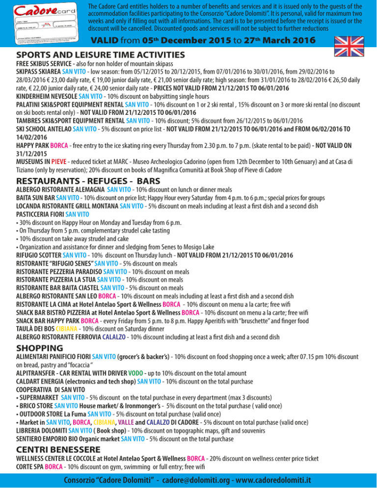 The Cadore Card entitles holders to a number of benefits and services and it is issued only to the guests of the accommodation facilities participating to the Consorzio “Cadore Dolomiti”. It is personal, valid for maximum two weeks and only if filling out with all informations. The card is to be presented before the receipt is issued or the discount will be cancelled. Discounted goods and services will not be subject to further reductions VALID from 05th December 2015 to 27th March 2016 SPORTS AND LEISURE TIME ACTIVITIES FREE SKIBUS SERVICE - also for non holder of mountain skipass SKIPASS SKIAREA SAN VITO - low season: from 05/12/2015 to 20/12/2015, from 07/01/2016 to 30/01/2016, from 29/02/2016 to 28/03/2016 € 23,00 daily rate, € 19,00 junior daily rate, € 21,00 senior daily rate; high season: from 31/01/2016 to 28/02/2016 € 26,50 daily rate, € 22,00 junior daily rate, € 24,00 senior daily rate - PRICES NOT VALID FROM 21/12/2015 TO 06/01/2016 KINDERHEIM NEVESOLE SAN VITO - 10% discount on babysitting single hours PALATINI SKI&SPORT EQUIPMENT RENTAL SAN VITO - 10% discount on 1 or 2 ski rental , 15% discount on 3 or more ski rental (no discount on ski boots rental only) - NOT VALID FROM 21/12/2015 TO 06/01/2016 TAMBRES SKI&SPORT EQUIPMENT RENTAL SAN VITO - 10% discount; 5% discount from 26/12/2015 to 06/01/2016 SKI SCHOOL ANTELAO SAN VITO - 5% discount on price list - NOT VALID FROM 21/12/2015 TO 06/01/2016 and FROM 06/02/2016 TO 14/02/2016 HAPPY PARK BORCA - free entry to the ice skating ring every Thursday from 2.30 p.m. to 7 p.m. (skate rental to be paid) - NOT VALID ON 31/12/2015 MUSEUMS IN PIEVE - reduced ticket at MARC - Museo Archeologico Cadorino (open from 12th December to 10th Genuary) and at Casa di Tiziano (only by reservation); 20% discount on books of Magnifica Comunità at Book Shop of Pieve di Cadore RESTAURANTS - REFUGES - BARS ALBERGO RISTORANTE ALEMAGNA SAN VITO - 10% discount on lunch or dinner meals BAITA SUN BAR SAN VITO - 10% discount on price list; Happy Hour every Saturday from 4 p.m. to 6 p.m.; special prices for groups LOCANDA RISTORANTE GRILL MONTANA SAN VITO - 5% discount on meals including at least a first dish and a second dish PASTICCERIA FIORI SAN VITO • 30% discount on Happy Hour on Monday and Tuesday from 6 p.m. • On Thursday from 5 p.m. complementary strudel cake tasting • 10% discount on take away strudel and cake • Organization and assistance for dinner and sledging from Senes to Mosigo Lake RIFUGIO SCOTTER SAN VITO - 10% discount on Thursday lunch - NOT VALID FROM 21/12/2015 TO 06/01/2016 RISTORANTE “RIFUGIO SENES” SAN VITO - 5% discount on meals RISTORANTE PEZZERIA PARADISO SAN VITO - 10% discount on meals RISTORANTE PIZZERIA LA STUA SAN VITO - 10% discount on meals RISTORANTE BAR BAITA CIASTEL SAN VITO - 5% discount on meals ALBERGO RISTORANTE SAN LEO BORCA - 10% discount on meals including at least a first dish and a second dish RISTORANTE LA CIMA at Hotel Antelao Sport & Wellness BORCA - 10% discount on menu a la carte; free wifi SNACK BAR BISTRÒ PIZZERIA at Hotel Antelao Sport & Wellness BORCA - 10% discount on menu a la carte; free wifi SNACK BAR HAPPY PARK BORCA - every Friday from 5 p.m. to 8 p.m. Happy Aperitifs with “bruschette” and finger food TAULÀ DEI BOS CIBIANA - 10% discount on Saturday dinner ALBERGO RISTORANTE FERROVIA CALALZO - 10% discount including at least a first dish and a second dish SHOPPING ALIMENTARI PANIFICIO FIORI SAN VITO (grocer’s & backer’s) - 10% discount on food shopping once a week; after 07.15 pm 10% discount on bread, pastry and “focaccia “ ALPITRANSFER - CAR RENTAL WITH DRIVER VODO - up to 10% discount on the total amount CALDART ENERGIA (electronics and tech shop) SAN VITO - 10% discount on the total purchase COOPERATIVA DI SAN VITO • SUPERMARKET SAN VITO - 5% discount on the total purchase in every department (max 3 discounts) • BRICO STORE SAN VITO House market/ & Ironmonger’s - 5% discount on the total purchase ( valid once) • OUTDOOR STORE La Fuma SAN VITO - 5% discount on total purchase (valid once) • Market in SAN VITO, BORCA, CIBIANA, VALLE and CALALZO DI CADORE - 5% discount on total purchase (valid once) LIBRERIA DOLOMITI SAN VITO ( Book shop) - 10% discount on topographic maps, gift and souvenirs SENTIERO EMPORIO BIO Organic market SAN VITO - 5% discount on the total purchase CENTRI BENESSERE WELLNESS CENTER LE COCCOLE at Hotel Antelao Sport & Wellness BORCA - 20% discount on wellness center price ticket CORTE SPA BORCA - 10% discount on gym, swimming or full entry; free wifi Consorzio “Cadore Dolomiti” - [email protected] - www.cadoredolomiti.it La Cadore Card è una tessera che da diritto a molte agevolazioni e viene rilasciata ESCLUSIVAMENTE agli ospiti delle strutture ricettive associate al Consorzio “Cadore Dolomiti”. E’ personale, valida per non più di due settimane e solo se compilata in ogni suo campo. La card va presentata prima del rilascio del documento fiscale, pena l'annullamento dello sconto. La merce ed i servizi già scontati o parte di un pacchetto non sono soggetti ad altri sconti. VALIDA dal 05/12/2015 al 27/03/2016 SPORT E TEMPO LIBERO SKIBUS - Servizio gratuito per i non possessori di skipass per gli impianti di risalita di San Vito e Cortina SKIPASS SKIAREA SAN VITO - bassa stagione: dal 05/12/2015 al 20/12/2015, dal 07/01/2016 al 30/01/2016, dal 29/02/2016 al 28/03/2016 € 23,00 giornaliero, € 19,00 giornaliero junior, € 21,00 giornaliero senior; alta stagione: dal 31/01/2016 al 28/02/2016 € 26,50 giornaliero, € 22,00 giornaliero junior, € 24,00 giornaliero senior - TARIFFE NON VALIDE DAL 21/12/2015 AL 06/01/2016 KINDERHEIM NEVESOLE SAN VITO - 10% di sconto sulle ore singole NOLEGGIO PALATINI SAN VITO - 10% di sconto su noleggio 1 o 2 paia di sci, 15% di sconto noleggio da 3 paia di sci in su (nessuno sconto sul noleggio dei soli scarponi) - NON VALIDO DAL 21/12/2015 AL 06/01/2016 NOLEGGIO TAMBRES SAN VI