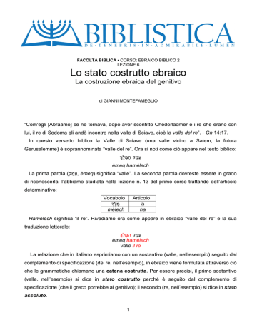 FACOLTÀ BIBLICA • CORSO: EBRAICO BIBLICO 2 LEZIONE 6 Lo stato costrutto ebraico La costruzione ebraica del genitivo di GIANNI MONTEFAMEGLIO “Com'egli [Abraamo] se ne tornava, dopo aver sconfitto Chedorlaomer e i re che erano con lui, il re di Sodoma gli andò incontro nella valle di Sciave, cioè la valle del re”. - Gn 14:17. In questo versetto biblico la Valle di Sciave (una valle vicino a Salem, la futura Gerusalemme) è soprannominata “valle del re”. Ora si noti come ciò appare nel testo biblico: �ֶעֵ מֶ ק הַ מֶּ ל èmeq hamèlech La prima parola (עֶ מַ ק, èmeq) significa “valle”. La seconda parola dovreste essere in grado di riconoscerla: l’abbiamo studiata nella lezione n. 13 del primo corso trattando dell’articolo determinativo: Vocabolo �ֶמֶּ ל mèlech Articolo ַה ha Hamèlech significa “il re”. Rivediamo ora come appare in ebraico “valle del re” e la sua traduzione letterale: �ֶעֵ מֶ ק הַ מֶּ ל èmeq hamèlech valle il re La relazione che in italiano esprimiamo con un sostantivo (valle, nell’esempio) seguito dal complemento di specificazione (del re, nell’esempio), in ebraico viene formulata attraverso ciò che le grammatiche chiamano una catena costrutta. Per essere precisi, il primo sostantivo (valle, nell’esempio) si dice in stato costrutto perché è seguito dal complemento di specificazione (che il greco porrebbe al genitivo); il secondo (re, nell’esempio) si dice in stato assoluto. 1 L’aggettivo “assoluto” deriva dal latino absolutus, formato da ab (= da) e da solutus (= sciolto), con il significato finale di “sciolto da [legami]”. Così, dicendo che un vocabolo è in stato assoluto, s’intende dire che quel vocabolo è ‘sciolto da legami’. Nel nostro esempio, la parola “re” è in stato assoluto perché la parola non è limitata da una connotazione particolare: il re è qui un re, punto e basta, non importa qui su cosa regni, come si chiami o chi sia. Il vocabolo in stato costrutto (valle, nell’esempio) non è invece ‘sciolto da legami’, perché qui non si tratta di una valle qualsiasi ma della “valle del re”. Vediamolo con un altro esempio. In Gn 3:19 Dio dice ad Adamo: “Mangerai il pane con il sudore del tuo volto”. La parola “pane” in ebraico si dice ( לֶחֶ םlèkhem). Il pane di cui si parla qui è pane generico, per cui la parola “pane” è qui in stato assoluto, è ‘sciolta da legami’, non è un pane specifico. In Es 25:30, però, il pane che vi è menzionato è specifico: “Metterai sulla tavola il pane della presentazione, che starà sempre davanti a me”. In ebraico il “pane della presentazione” è chiamato letteralmente “pane di facce”. Il termine “faccia” a volte sta nella Bibbia per “presenza” (2Re 13:23) e quindi il “pane della presentazione” stava di fronte alla faccia di Dio come offerta posta costantemente davanti a lui. Questo pane, quindi, non è un pane qualsiasi come quello che Adamo avrebbe mangiato. Questo “pane della presentazione” è vincolato dalla specificazione “della presentazione”. Ecco allora che la grammatica dice in questo caso che la parola “pane” è qui in stato costrutto, non è ‘sciolta da legami’, perché si tratta di un pane specifico. La catena costrutta è: לֶחֶ ם פָּ נִים lèkhem panìm pane facce Ora arriva la parte più difficile. Il vocabolo in stato costrutto subisce spesso trasformazioni nella parte finale e nella parte vocalica. Vediamo le più frequenti. Trasformazione di finali • I plurali in ◌ִ יםoppure in ◌ַ י ִםsi trasformano in ◌ֵ י. Un esempio lo abbiamo in Lv 23:2: “Ecco le solennità del Signore, che voi celebrerete come sante convocazioni”. La parola “solennità” traduce l’ebraico ( מוֹעֵ דmoèd), che al plurale fa normalmente ( מֹועֲ דִ יםmoadìym), e si noti la finale in ◌ִ ים. In “solennità del 2 Signore” il vocabolo ebraico moadìym si trova però in stato costrutto. La catena costrutta è quindi: ( מֹועֲ דֵ י י ְהו ָהmoadè Yhvh), in applicazione della regola. • I nomi femminini che terminano in ◌ָ ה, cambiano tale finale in ◌ַ ת. Un esempio lo troviamo in Dt 4:16: “Affinché non agiate rovinosamente e non vi facciate realmente un’immagine scolpita” (TNM). In ebraico “immagine” si dice תְּ מוּנָה (tmunàh), vocabolo di genere femminile, e notate la sua finale in ◌ָ ה. Nel passo deuteronomico ciò che TNM traduce “immagine scolpita” è letteralmente “idolo di immagine” ovvero un’immagine usata nel culto come idolo. Siamo quindi di fronte a una catena costrutta in cui la parola “immagine” ( )תְּ מוּנָהè in stato costrutto. Giacché si tratta di un vocabolo femminile terminante in ◌ָ ה, si applica la regola secondo cui la finale diventa ◌ַ ת. E, infatti, nel testo biblico troviamo: ( פֶּ סֶ ל תְּ מוּנַתpèsel tmunàt), “idolo di immagine”. • I nomi che terminano in ◌ֶ ה, mutano tale terminazione in ◌ֵ ה. In Gn 23:17 è menzionato il “campo di Efron”. In ebraico “campo” si dice ( שָׂ דֶ הsadè), che termina appunto in ◌ֶ ה. La costruzione “campo di Efron” è una catena costrutta, per cui – applicando la regola, שָׂ דֶ הmuta la sua finale in ◌ֵ ה. Così la frase diventa שְׂ דֵ ה עֶ ְפרֹון (sedèh efròn). • I vocaboli femminili duali in ◌ָ ַתי ִםtrasformano tale finale in ◌ְ תֵ י. Ad esempio, “due cavalle del re” si dice � ֶ( סוּסְ תֵ י הַ מֶּ לsustè hamèlech). • Il plurale femminile in ֹותconserva la finale invariata. Esempio: “cavalle” si dice ( סוּסֹותsusòt), e “cavalle del re” si dice �( סוּסֹות הַ מֶּ ֶלsusòt hamèlech). Trasformazioni vocaliche • Le vocali qàmetz e tzerè di sillaba non accentata diventano shevà. Esempi: STATO ASSOLUTO STATO COSTRUTTO 3 