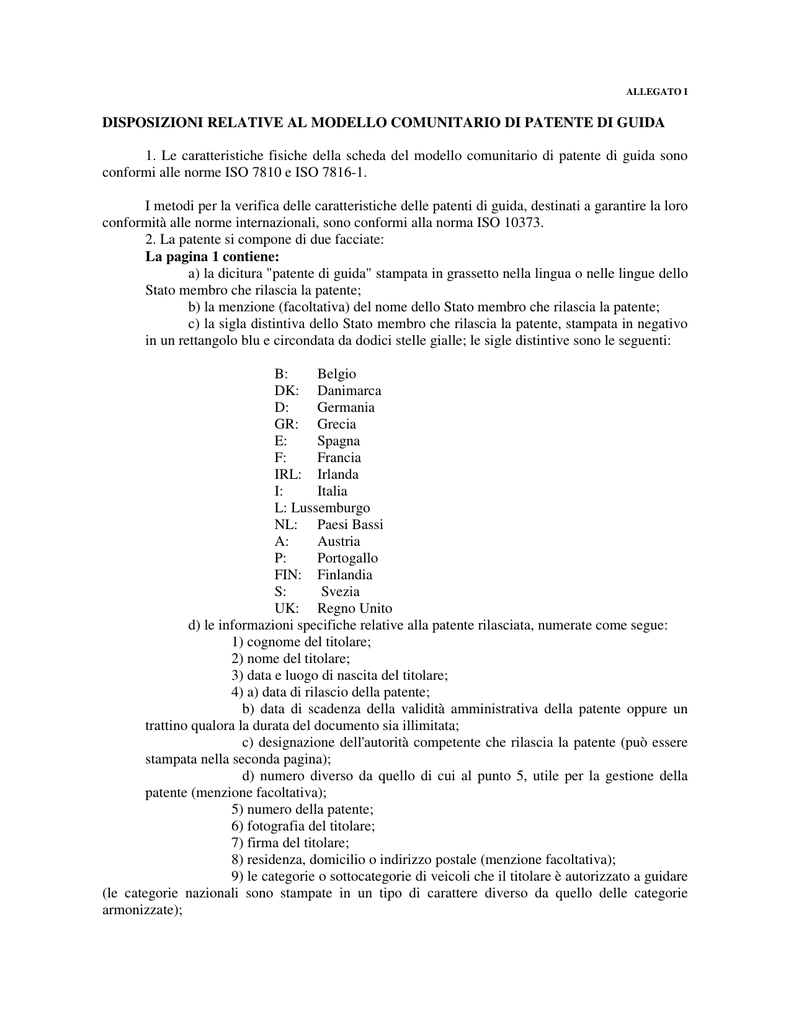 ALLEGATO I DISPOSIZIONI RELATIVE AL MODELLO COMUNITARIO DI PATENTE DI GUIDA 1. Le caratteristiche fisiche della scheda del modello comunitario di patente di guida sono conformi alle norme ISO 7810 e ISO 7816-1. I metodi per la verifica delle caratteristiche delle patenti di guida, destinati a garantire la loro conformità alle norme internazionali, sono conformi alla norma ISO 10373. 2. La patente si compone di due facciate: La pagina 1 contiene: a) la dicitura "patente di guida" stampata in grassetto nella lingua o nelle lingue dello Stato membro che rilascia la patente; b) la menzione (facoltativa) del nome dello Stato membro che rilascia la patente; c) la sigla distintiva dello Stato membro che rilascia la patente, stampata in negativo in un rettangolo blu e circondata da dodici stelle gialle; le sigle distintive sono le seguenti: B: Belgio DK: Danimarca D: Germania GR: Grecia E: Spagna F: Francia IRL: Irlanda I: Italia L: Lussemburgo NL: Paesi Bassi A: Austria P: Portogallo FIN: Finlandia S: Svezia UK: Regno Unito d) le informazioni specifiche relative alla patente rilasciata, numerate come segue: 1) cognome del titolare; 2) nome del titolare; 3) data e luogo di nascita del titolare; 4) a) data di rilascio della patente; b) data di scadenza della validità amministrativa della patente oppure un trattino qualora la durata del documento sia illimitata; c) designazione dell'autorità competente che rilascia la patente (può essere stampata nella seconda pagina); d) numero diverso da quello di cui al punto 5, utile per la gestione della patente (menzione facoltativa); 5) numero della patente; 6) fotografia del titolare; 7) firma del titolare; 8) residenza, domicilio o indirizzo postale (menzione facoltativa); 9) le categorie o sottocategorie di veicoli che il titolare è autorizzato a guidare (le categorie nazionali sono stampate in un tipo di carattere diverso da quello delle categorie armonizzate); e) la dicitura "modello delle Comunità europee" nella lingua o nelle lingue dello Stato membro che rilascia la patente e la dicitura "patente di guida" nelle altre lingue della Comunità, stampate in rosa in modo da costituire lo sfondo della patente: Permiso de Conducción Koerekort Fuehrerschein Αδεια οδηγησης Driving Licence Ajokortti Permis de conduire Ceadúnas Tiomána Patente di guida Rijbewijs Carta de Condução Koerkort; f) colori di riferimento: - blu: Pantone Reflex Blue, - giallo: Pantone Yellow. La pagina 2 contiene: a) 9) le categorie o sottocategorie di veicoli che il titolare è autorizzato a guidare; 10) la data del primo rilascio per ciascuna categoria o sottocategoria (questa data deve essere ritrascritta sulla nuova patente ad ogni ulteriore duplicato o conversione); 11) la data di scadenza della validità per ciascuna categoria o sottocategoria; 12) le eventuali indicazioni supplementari o restrittive, in forma codificata, a fronte di ciascuna categoria o sottocategoria interessata. I codici sono stabiliti nel modo seguente: "- codici da 01 a 99; codici comunitari armonizzati CONDUCENTE (motivi medici) 01.Correzione della vista e/o protezione degli occhi 01.01 Occhiali 01.02 Lenti a contatto 01.03 Occhiali protettivi 01.04 Lente opaca 01.05 Occlusore oculare 01.06 Occhiali o lenti a contatto 02.Apparecchi acustici/aiuto alla comunicazione 02.01 Apparecchi acustici monoauricolari 02.02 Apparecchi acustici biauricolari 03.Protesi per gli arti 03.01 Protesi/ortesi per gli arti superiori 03.02 Protesi/ortesi per gli arti inferiori 05. Limitazioni nella guida (il codice deve essere indicato in dettaglio, guida soggetta a limitazioni per motivi medici) 05.01 Guida in orario diurno (ad esempio; da un’ora prima dell’alba ad un’ora dopo il tramonto) 05.02 Guida entro un raggio di … km dal luogo di residenza del titolare o solo nell’ambito della città/regione …. 05.03 Guida senza passeggeri 05.04 Velocità di guida limitata a…. km/h 05.05 Guida autorizzata solo se accompagnato da titolare di patente 05.06 Guida senza rimorchio 05.07 Guida non autorizzata in autostrada 05.08 Niente alcool MODIFICHE DEL VEICOLO 10. Cambio di velocità modificato 10.01 Cambio manuale 10.02 Cambio automatico 10.03 Cambio elettronico 10.04 Leva del cambio adattata 10.05 Senza cambio marce secondario 15. Frizione modificata 15.01 Pedale della frizione adattato 15.02 Frizione manuale 10.03 Frizione automatica 15.04 Tramezzatura davanti al pedale della frizione soppresso o neutralizzabile 20. Dispositivi di frenatura modificabili 20.01 Pedale del freno modificato 20.02 Pedale del freno allargato 20.03 Pedale del freno adattato 20.04 Pedale del freno con piastra di appoggio 20.05 Pedale del freno basculante 20.06 Freno di servizio manuale (adattato) 20.07 Pressione massima sul freno di servizio rinforzato 20.08 Pressione massima sul freno di emergenza integrato nel freno di emergenza 20.09 Freno di stazionamento modificato 20.10 Freno di stazionamento a comandando elettrico 20.11 Freno di stazionamento (adattato) azionato dal piede 20.12 Tramezzatura davanti al pedale della freno soppresso o neutralizzabile 20.13 Freno azionato dal ginocchio 20.14 Freno di servizio a comando elettrico 25. Dispositivi di accelerazione modificati 25.01 Pedale dell’acceleratore adattato 25.02 Acceleratore ad asola 25.03 Pedale dell’acceleratore basculante 25.04 Acceleratore manuale 25.05 Acceleratore azionato dal ginocchio 25.06 Acceleratore assistito (elettronico, pneumatico, ecc.) 25.07 Pedale dell’acceleratore a sinistra di quello del freno 25.08 Pedale dell’acceleratore sul lato sinistro 25.09 Tramezzatura davanti al pedale dell'acceleratore soppresso o neutralizzabile 30.Dispositivi combinati di frenatura e di accelerazione 30.01 Pedali paralleli 30.02 Pedali sullo stesso livello (o quasi) 30.03 Acceleratore e freno manuale con guida di scorrimento 30.04 Acceleratore a freno a slitta per ortesi 30.05 Pedali dell’acceleratore e del freno soppressi o neutralizzati 30.06 Fondo rialzat