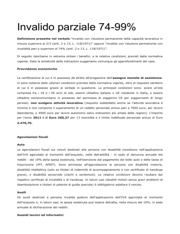 Invalido parziale 74-99% Definizione presente nel verbale:"invalido con riduzione permanente della capacità lavorativa in misura superiore ai 2/3 (artt. 2 e 13, L. 118/1971)" oppure “invalido con riduzione permanente con invalidità pari o superiore al 74% (artt. 2 e 13, L. 118/1971)”. Di seguito riportiamo in estrema sintesi i benefici, e le relative condizioni, previsti dalla normativa vigente. Data la sinteticità delle indicazioni suggeriamo comunque gli approfondimenti del caso. Provvidenze economiche La certificazione di cui è in possesso dà diritto all'erogazione dell'assegno mensile di assistenza. Vi sono tuttavia delle ulteriori condizioni previste dalla normativa vigente, oltre al requisito sanitario di cui è in possesso grazie al verbale in questione. Le principali condizioni sono: avere un'età compresa fra i 18 e i 65 anni di età; essere cittadino italiano o UE residente in Italia, o essere cittadino extracomunitario in possesso del permesso di soggiorno CE per soggiornanti di lungo periodo; non svolgere attività lavorativa (requisito soddisfatto anche se l'attività lavorativa è minima e non comporta il superamento di un reddito personale annuo pari a 7500 euro, per lavoro dipendente, o 4500 euro per lavoro autonomo salvo indicazioni più ampie delle regioni). L’importo per l’anno 2011 è di Euro 260,27 per 13 mensilità e il limite reddituale personale annuo di Euro 4.470,70. Agevolazioni fiscali Auto Le agevolazioni fiscali sui veicoli destinati alle persone con disabilità consistono nell'applicazione dell'IVA agevolata al momento dell'acquisto, nella detraibilità - in sede di denuncia annuale dei redditi - del 19% della spesa sostenuta, nell'esenzione dal pagamento del bollo auto e delle tasse di trascrizione (IPT, APIET). Sono ammesse all'agevolazione le persone con disabilità motoria, disabilità intellettiva (solo se titolari di indennità di accompagnamento e con certificato di handicap grave), o disabilità sensoriale (ciechi e sordomuti). Le relative condizioni devono risultare dai rispettivi certificati di invalidità o di handicap. In taluni casi (disabili motori senza gravi problemi di deambulazione e titolari di patente di guida speciale) è obbligatorio adattare il veicolo. Ausili Gli ausili destinati a persone invalide godono dell'applicazione dell'IVA agevolata al momento dell'acquisto e, in taluni casi, la spesa sostenuta può essere detratta, nella misura del 19%, in sede annuale di dichiarazione dei redditi. Sussidi tecnici ed informatici I sussidi tecnici ed informatici sono prodotti di comune reperibilità (es. computer, fax) che possono favorire l'autonomia delle persone con disabilità. La normativa vigente prevede che questi prodotti godano dell'applicazione dell'IVA agevolata al momento dell'acquisto e che la spesa sostenuta può essere detratta in sede annuale di dichiarazione dei redditi. È tuttavia necessario disporre di una specifica prescrizione autorizzativa, oltre che del certificato di handicap o invalidità. Spese per l'assistenza specifica La normativa vigente prevede la possibilità di dedurre dal reddito, in sede di dichiarazione annuale, le spese sostenute per l'assistenza specifica resa, da personale medico e sanitario (anche terapisti), a persone con handicap. Possono godere della deduzione i diretti interessati, i familiari che li abbiamo a loro carico fiscale, o i familiari che siano civilmente obbligati verso queste persone. Spese per l'assistenza personale e domestica La normativa vigente prevede forme articolate di agevolazione fiscale per le spese sostenute per le bandanti e le colf. Le modalità di accesso variano a seconda della disabilità di chi beneficia dell'assistenza. Alle agevolazioni fiscali si accede al momento della denuncia annuale dei redditi. Detrazioni per familiari a carico È attualmente prevista una detrazione di 800 euro (a scalare a partire da un reddito di 95.000 euro). La detrazione è aumentata a 900 euro per ciascun figlio di età inferiore a tre anni. Queste detrazioni sono aumentate di un importo pari a 220 euro per ogni figlio portatore di handicap ai sensi dell'articolo 3 della legge 5 febbraio 1992, n. 104. Non sono previste invece detrazioni forfettarie per altri familiari con handicap. Prima casa Non esistono ulteriori specifiche agevolazioni per l'acquisto di una prima casa nel caso di nuclei in cui siano presenti persone con disabilità. L'agevolazione è quindi la medesima prevista per tutti i contribuenti: la detraibilità, in sede di denuncia annuale dei redditi, degli interessi passivi su mutui eventualmente contratti per l'acquisto della prima casa. Tassa asporto rifiuti La TARSU, Tassa asporto rifiuti solidi urbani, è una tassa di stretta competenza locale. I comuni hanno facoltà di fissare, nelle specifiche delibere, agevolazioni per le persone anziane, per le persone disabili o per i cittadini in stato di bisogno, senza tuttavia che vi sia alcun obbligo specifico. Si suggerisce di rivolgersi al proprio comune per conoscere le eventuali agevolazioni. ICI L'Imposta Comunale sugli Immobili è un tributo di stretta competenza locale. I comuni hanno facoltà di fissare, nelle specifiche delibere, agevolazioni per le persone anziane, per le persone disabili o per i cittadini in stato di bisogno, senza tuttavia che vi sia alcun obbligo specifico. Si suggerisce di rivolgersi al proprio comune per conoscere le eventuali agevolazioni. Altre agevolazioni Telefonia fissa La normativa vigente prevede che agli anziani, persone disabili e utenti "con esigenze sociali speciali" venga riconosciuta una riduzione del 50% sul canone mensile di abbonamento. Vengono tuttavia previsti dei limiti reddituali per poter accedere a tale beneficio. Telefonia mobile La normativa vigente prevede che la tassa di concessione governativa non sia dovuta dagli invalidi "in seguito a perdita anatomica o funzionale di entrambi gli arti inferiori nonché a non vedenti e ai sordomuti." Il certificato di cu