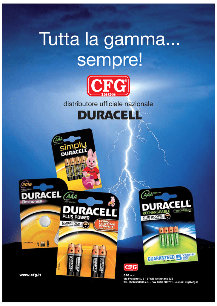 Codice Descrizione Tipo Contenuto DU030 DURACELL SIMPLY Stilo AA 1500 blister 4 pile/blister UV 20 DU031 DURACELL SIMPLY Ministilo AAA 2400 blister 4 pile/blister 10 DU032 DURACELL SIMPLY Stilo blister da 8 pile blister 8 pile/blister 12 DU033 DURACELL SIMPLY Ministilo blister da 8 pile blister 8 pile/blister 10 Codice Descrizione Tipo Contenuto DU0100 DURACELL PLUS POWER Stilo (AA) 1500 blister 4 pile/blister UV 20 DU0100E DURACELL PLUS POWER Stilo (AA) 1500 scatola expo banco blister 4 pile/blister 20 DU0200 DURACELL PLUS POWER Ministilo (AAA) 2400 blister 4 pile/blister 10 DU0200E DURACELL PLUS POWER Ministilo (AAA) 2400 scatola expo banco blister 4 pile/blister 10 DU0300 DURACELL PLUS POWER Mezzatorcia (C), blister rosso 1400 blister 2 pile/blister 10 DU0400 DURACELL PLUS POWER Torcia (D), blister viola 1300 blister 2 pile/blister 10 DU0501 DURACELL PLUS POWER Transistor (9V), blister blu 1604 blister 1 pila/blister 10 DU0600 DURACELL PLUS POWER Piatta (4,5V), blister bianco 1203 blister 1 pila/blister 10 DU007 Box Duracell (24AA+12AAA+3 Clip Strip) ClipStrip 4 pile/blister 1 DUEPB4200 EXPO PLUS POWER 140 blister AA + 60 blister AAA expo 4 pile/blister 1 DUEP130 EXPO PLUS POWER 60AA + 40AAA + 10C + 10D + 109V expo 4 pile/blister 1 DUEPB4300 EXPO PLUS POWER 140 blister AA + 90 AAA + 30 9V + 20 C + 20 D expo 4 pile/blister 1 DU0110 DURACELL PLUS POWER Stilo (AA) blister da 8 blister 8 pile/blister 12 DU0210 DURACELL PLUS POWER Ministilo (AAA) blister da 8 blister 8 pile/blister 10 DUEPB8260 EXPO PLUS POWER 180 blister da 8 AA+80 blister da 8 AAA expo 8 pile/blister 1 DU0120 DURACELL PLUS POWER Stilo (AA) blister da 12 blister 12 pile/blister 12 DU0220 DURACELL PLUS POWER Ministilo (AAA) blister da 12 12 blister 12 pile/blister DUEPB12252 EXPO PLUS POWER 168 blister da 12 AA+84 blister da 12 AAA expo 12 pile/blister 1 DU0130 DURACELL PLUS POWER Stilo (AA) blister da 16 blister 16 pile/blister 10 DU0230 DURACELL PLUS POWER Ministilo (AAA) blister da 16 blister 16 pile/blister 10 DUEPB16 EXPO PLUS POWER 130 blister da 16 AA+ 110 blister da 16 AAA expo 16 pile/blister 1 Quelli evidenziati sono nuovi articoli Codice Descrizione Tipo Contenuto DU0060B2 DURACELL ULTRA Stilo AA 1500 blister 2 pile/blister 10 DU0060 DURACELL ULTRA Stilo AA 1500 blister 4 pile/blister 20 DU0061B2 DURACELL ULTRA Ministilo AAA 2400 blister 2 pile/blister 10 DU0061 DURACELL ULTRA Ministilo AAA 2400 blister 4 pile/blister 10 DU0062 DURACELL ULTRA Mezzatorcia (C), blister rosso 1400 blister 2 pile/blister 10 DU0063 DURACELL ULTRA Torcia (D), blister viola 1300 blister 2 pile/blister 10 DU0065 DURACELL ULTRA Transistor (9V), blister blu 1604 blister 1 pila/blister 10 DUEUB4200 EXPO ULTRA 140 blister AA + 60 blister AAA expo 4 pile/blister 1 DUEUB4300 EXPO ULTRA 140 blister AA + 90 AAA + 30 9V + 20 C + 20 D expo 4 pile/blister 1 DU0066 DURACELL ULTRA Stilo (AA) blister da 8 blister 8 pile/blister 12 DU0067 DURACELL ULTRA Ministilo (AAA) blister da 8 blister 8 pile/blister 10 DUEUB8134 EXPO ULTRA 84 blister da 8 AA + 50 blister da 8 AAA expo 8 pile/blister 1 DUEUB8260 EXPO ULTRA 180 blister da 8 AA + 80 blister da 8 AAA expo 8 pile/blister 1 DU0070 DURACELL ULTRA Stilo (AA) blister da 12 blister 12 pile/blister 12 DU0071 DURACELL ULTRA Ministilo (AAA) blister da 12 blister 12 pile/blister 12 DUEUB12 EXPO ULTRA 168 blister da 12 AA + 84 blister da 12 AAA expo 12 pile/blister 1 Quelli evidenziati sono nuovi articoli UV Codice Descrizione Tipo Contenuto DU74 DURACELL PRECARICATA Stilo, B2, 2400 mAh, 5 anni blister 2 pile/blister UV 10 DU75 DURACELL PRECARICATA Stilo, B4, 2400 mAh, 5 anni blister 4 pile/blister 10 DU76 DURACELL PRECARICATA Ministilo, B2, 800 mAh, 5 anni blister 2 pile/blister 10 DU77 DURACELL PRECARICATA Ministilo, B4, 800 mAh, 5 anni blister 4 pile/blister 10 DU69 DURACELL VALUE Stilo 1300mAh, HR06, 3 anni blister 2 pile/blister 10 DU69B4 DURACELL VALUE Stilo 1300mAh, HR06, 3 anni blister 4 pile/blister 10 DU70 DURACELL VALUE Ministilo 750 mAh, HR03, 3 anni blister 2 pile/blister 10 DU70B4 DURACELL VALUE Ministilo 750 mAh, HR03, 3 anni blister 4 pile/blister 10 DU13 DURACELL VALUE Mezzatorcia (C), 2200 mAh, HR14 blister 2 pile/blister 10 DU14 DURACELL VALUE Torcia (D), 2200 mAh, HR20 blister 2 pile/blister 10 DU15 DURACELL VALUE Transistor (9V), 170 mAh, HR9V blister 1 pila/blister 10 DUE90 EXPO Ricaricabili: 24 CEF14+40 Value Stilo+30 Value Ministilo expo - 1 Quelli evidenziati sono nuovi articoli Codice Descrizione Tipo Contenuto DU97 DURACELL CHARGER CEF 14 (4 ore) con 2AA VALUE blister blister UV 3 DU72 DURACELL CHARGER CEF 15 (15 minuti)+4AA 1300mAh blister blister 3 DU11 DURACELL CHARGER CEF 22 (3 ore) MULTI blister blister 4 DU73 DURACELL FAST CHARGER CEF 27 (45 min)+2AA+2AAA blister blister 3 Codice Descrizione Tipo Contenuto DU78 DURACELL EASY TAB 10 GIALLO ACUSTICA blister 6 pila /blister 10 DU79 DURACELL EASY TAB 312 MARRONE ACUSTICA blister 6 pila /blister 10 DU80 DURACELL EASY TAB 13 ARANCIO ACUSTICA blister 6 pila /blister 10 DU81 DURACELL EASY TAB 675 BLU ACUSTICA blister 6 pila /blister 10 Codice Descrizione Tipo Contenuto DU30 DURACELL 1220 blister 1 pila /blister 10 DU48 DURACELL 1616 blister 1 pila /blister 10 DU27 DURACELL 1620 blister 1 pila /blister 10 DU20 DURACELL 2016 blister 1 pila /blister 10 DU20B2 DURACELL 2016 blister 2 pile /blister 10 DU21 DURACELL 2025 blister 1 pila/blister 10 DU21B2 DURACELL 2025 blister 2 pile /blister 10 DU22 DURACELL 2032 blister 1 pila/blister 10 DU22B2 DURACELL 2032 blister 2 pile /blister 10 DU49 DURACELL 2430 blister 1 pila /blister 10 DU31 DURACELL 2450 blister 1 pila /blister 10 DU50 DURACELL LR43 blister 2 pile/blister 10 DU23 DURACELL LR44 1,5 Volt blister 2 pile/blister 10 DU24 DURACELL LR54 blister 2 pile/blister 10 Quelli evidenziati sono nuovi articoli UV UV Codice Descrizione Tipo Contenuto DU26 DURACELL N (MN9100) 1,5 Volt apri cancello / macchina blister 2 pila/blister UV 10 DU57 DURACELL MN2500 AAAA blister 2 pila/blister 10 DU59 DURACE