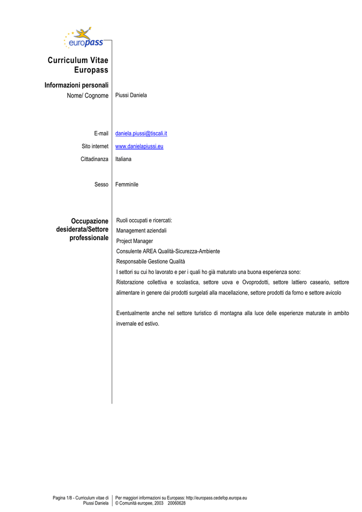 Curriculum Vitae Europass Informazioni personali Nome/ Cognome E-mail Piussi Daniela [email protected] Sito internet www.danielapiussi.eu Cittadinanza Italiana Sesso Occupazione desiderata/Settore professionale Femminile Ruoli occupati e ricercati: Management aziendali Project Manager Consulente AREA Qualità-Sicurezza-Ambiente Responsabile Gestione Qualità I settori su cui ho lavorato e per i quali ho già maturato una buona esperienza sono: Ristorazione collettiva e scolastica, settore uova e Ovoprodotti, settore lattiero caseario, settore alimentare in genere dai prodotti surgelati alla macellazione, settore prodotti da forno e settore avicolo Eventualmente anche nel settore turistico di montagna alla luce delle esperienze maturate in ambito invernale ed estivo. Pagina 1/8 - Curriculum vitae di Piussi Daniela Per maggiori informazioni su Europass: http://europass.cedefop.europa.eu © Comunità europee, 2003 20060628 Esperienza professionale Attualmente svolgo la libera professione come consulente nel settore alimentare e nello specifico mi sto occupando di: - attività di formazione per corsi obbligatori rivolti a tutti gli operatori del settore alimentare in base alle linee guida pubblicate dalla Regione Friuli Venezia Giulia Protocollo Nr. 9916/SPS-VETAL; - attività di formazione per la formazione degli operatori che operano nel settore alimentare sopprimendo l’obbligo del cd. “libretto di idoneità sanitaria” e disponendo la formazione degli addetti alla manipolazione dei prodotti alimentari e dei responsabili dei sistemi H.A.C.C.P delle imprese in tutta Italia; - sviluppo di manuali di corretta prassi operativa (manuali di Autocontrollo secondo la metodologia H.A.C.C.P.); - sviluppo della documentazione per le certificazioni basate sugli standard BRC e IFS; - Auditor per Sistemi Qualità UNI EN ISO 9001:2008, standard BRC e IFS, UNI EN ISO 22000:2005; - servizio di assistenza per predisporre un protocollo per l’individuazione della data di scadenza o del termine minimo di conservazione (provvedimento del 13 gennaio 2005 al punto 3.7.5); - servizio di assistenza relativo al Regolamento CE “Pacchetto Igiene” e Sicurezza alimentare; - attività che svolgo saltuariamente nel periodo estivo in quanto d’inverno in qualità di maestro di sci svolgo l’attività di maestro di sci di fondo e accompagnatore con le racchette da neve (cjaspole) nei periodi invernali e di istruttore di Nordik Wolking nel periodo estivo Attuali impegni professionali - Da novembre 2007 ad oggi svolgo attività di Project Manager per la società di diritto belga UNIJOLLY s.a. per gestire l’attività di ristorazione presso il Consiglio dei Ministri della Unione Europea - Da giugno 2010 ho in essere rapporto di collaborazione con la società ANDROMEDA, azienda alimentare del settore delle acque minerali a marchio “Pradis”, con il ruolo di Direttore Sanitario che terminerà a dicembre 2011. - Collaboro da maggio 2009 con la latteria Cooperativa Allevatori Valcanale (latteria di Ugovizza – Comune di Malborghetto-Valbruna) di Ugovizza con la qualifica di Consigliere in ambito gestionale e consulente per quanto di mia diretta competenza. - Da maggio 2005 a ottobre 2008 ho svolgo attività di presidente e direttore della Scuola Sci Fondo Valcanale Società Cooperativa. In questo ambito mi occupavo ed ancora oggi mi occupo come società individuale del contratto in subappalto della gestione di battitura e manutenzione delle piste da fondo del Tarvisiano (Consorzio di Promozione Turistica e PROMOTUR). - Da gennaio 2009 ad oggi svolgo l'attività di direttore dell'Associazione maestri Scuola Sci Fondo Valcanale all'interno della quale pratico la professione di maestro di sci Pagina 2/8 - Curriculum vitae di Piussi Daniela Per maggiori informazioni su Europass: http://europass.cedefop.europa.eu © Comunità europee, 2003 20060628 Istruzione e formazione Diplomata nell'anno 88/89 presso il Liceo Scientifico "Luigi Magrini" di Tarvisio Laureata in Scienze e Tecnologie Alimentari il 28/03/95 presso la facoltà di Agraria di Udine con valutazione 102/110. Tesi : Influenza delle modalità di confezionamento sulla qualità microbiologica e sulla shelf-life di formaggi a breve maturazione" a seguito della tesi pubblicazione sul "Journal of Food Protection" vol. 59, n° 5.1996, "The Behavior of Yeast Population in Stracchino Cheese Packaged under Various Conditions" (Relatore Dott.ssa Mara Lucia Stecchini). Anno 1995 corso di assaggiatore di olio di oliva extravergine con successivo tirocinio di due anni per abilitare tale professione (riconoscimento MIPAF). Anno 1996 corso di assaggiatore di formaggi (corso base) Attualmente sono un componente per la costituzione di un panel interprofessionale di degustatori oli d’oliva – Reg. (CEE) n. 2568/91 e modifica con reg. (CE) 796/02 in attesa di prossimo accreditamento da parte del Ministero delle Politiche Agricole e Forestali Master in EUROPROGETTAZIONE (Trieste 22_26 novembre 2011) Pagina 3/8 - Curriculum vitae di Piussi Daniela Per maggiori informazioni su Europass: http://europass.cedefop.europa.eu © Comunità europee, 2003 20060628 Titolo della qualifica rilasciata ALCUNE ESPERIENZE FORMATIVE VII European Symposium on the Quality of Eggs and Egg Products (Poznan, 21-26 settembre 1997 Polonia) International Symposium on Food-Borne salmonella in Poultry (Baltimora, 25-26 luglio 1998 Maryland) VIII European Symposium on the Quality of Eggs and Egg Products (Bologna, 19-23 settembre 1999) IX European Symposium on the Quality of Eggs and Egg Products (Kusadasi, 09-19 settembre 2001 Turchia) Convegno nazionale: “I rischi microbiologici del 2000 nel settore alimentare- autocontrollo ed HACCP nella produzione di alimenti” (Unipath Bologna 04 maggio 1995). Convegno nazionale: “I rischi microbiologici del 2000 nel settore alimentare. La garanzia della qualità operativa nel laboratorio di analisi microbiologica degli alimenti” (Unipath Bologna 02 maggio 1