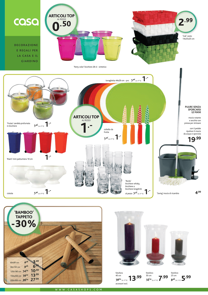 ARTICOLI TOP 2 .99 AL PEZZO 0 .50 ‘Cali’ cesto 14x25x25 cm DECORAZIONE E REGALI PER LA CASA E IL GIARDINO ‘Party color’ bicchiere 28 cl - sintetico tovaglietta 44x29 cm - pvc 1.49 (sc. 0 .49 €) 1.- PULIRE SENZA SPORCARSI LE MANI ARTICOLI TOP ‘Frutas’ candela profumata in bicchiere 1.69 (sc. 0 .69 €) 1.- mocio rotante e secchio con pressa per strizzare AL PEZZO 1 .- coltello da frutta 1.29 (sc. 0 .29 1.- 19.99 1.- ‘Riant’ mini pattumiera 10 cm 1.99 (sc. 0 ciotola €) con il pedale ripulisce il mocio da acqua e sporcizia .99 €) ‘Rocks’ bicchiere whisky, bicchiere o bicchiere longdrink 1.- al pezzo 1.25 (sc. 0 .25 €) 1.- 4.99 ‘Swing’ mocio di ricambio ‘BAMBOO’ TAPPETO -30% 60x90 cm 90x150 cm 120x180 cm 150x200 cm 200x300 cm 4.99 9.99 14.99 19.99 39.99 3.49 6.99 10.49 13.99 27.99 fotoforo 40 cm 19.95 (sc. 5 .96 €) accessori escl. W W W . C A S A S H O P S . C O M 13.99 fotoforo 30 cm 12.50 (sc. 4 .51 €) 7.99 fotoforo 25 cm 8.99 (sc. 3 €) .- 5.99 ‘Photo’ borsa shopping 42x33x11 cm nero o bianco CORNICI -50% 8.99 scatola box per foto 15x10x10 cm 4.99 ‘Wire’ portacd per 67 cd 113x23x17 cm cornici da 10x15 cm 1.20 a 50x70 cm 9.95 ‘Smiley’ lampada da lettura con lampadine led - batterie incl. 14.99 0.60 4.97 ‘Mesh’ set per scrivania da 3 pezzi: portalettere 8x12x17 cm, supporto per bloc-notes 9x28x10 cm e portapenne 9 cm 5 .99 ‘Loft’ portaritratti per 21 foto 122x50 cm 27.99 (sc. 8 €) .- 19 .99 ‘Loft’ portaritratti per 32 foto 115x60 cm 29.99 (sc. 5 €) .- 24 .99 2.99 supporto per laptop con lampada led 7x48x37 cm batterie escl. 12.95 set 3 cubi 48x70x10 cm bianco o nero 19.99 ‘Leave’ specchio 48x48 cm bianco o nero 19.99 ‘Luna’ sedia 85x52x43 cm 29.95 (sc. 9 .96 €) 19.99 ‘Office’ lampada da scrivania 65 cm - max. 40W lampada escl. bianco, nero o rosso 2 19 .99 ‘Tibo’ lampada da tavolo 29 cm - max. 25W lampada escl. - bianco o nero 17 .99 W W W . C A S A S H O P S . C O M ‘Pinguïn’ lampada led batterie escl. 3.99 ‘Wire’ portacd per 32 cd 59x23x20 cm 7.99 set 3 cesti: Ø 10 cm, Ø 15 cm e Ø 19 cm bianco, grigio o nero 9.99 (sc. 2 €) .- ‘Home’ zerbino 25x75 cm 6 .99 ‘Mesh’ cesto pensile per armadi e scaffali 16x30x26 cm - bianco, nero o grigio 7.99 5.99 set 4 cesti: 11x14x11 cm, 13x16x13 cm, 15x18x14 cm e 15x20x17 cm - bianco, grigio o blu scatola 18x8x16 cm 2.99 ‘Riant’ pattumiera 64x42x48 cm 50 l - rosso, rosa o viola ‘Ladybug o dog’ zerbino 40x70 cm scatola 21x15x15 cm 7.99 14 .99 9.99 3l 5l 12 l 30 l 27.99 .- 3.99 ‘Rvs’ secchio con pedale ‘Tree’ appendiabiti 160x45x45 cm 9.99 (sc. 2 €) 9.99 13.99 19.99 39.99 ‘Mini tree’ appendiabiti 120x40x40 cm 19.99 ‘Recycle’ set 4 pattumiere 30x25x45 cm 69.- (sc. 20 €) .- 49.- 2 .99 scalino pieghevole 31x26x22 cm 5.99 ‘Animal’ scalino 12x18 cm PIEGHEVOLE scalino pieghevole 39x33x39 cm 9.99 4 .99 ‘Albi’ sgabello pieghevole 45 cm 5.99 (sc. 1 €) REGISTRATI ORA PER RICEVERE LA NOSTRA NEWSLETTER SU W W W . C A S A S H O P S . C O M .- 3 scatola per sistemare 32x32x32 cm - lino, bianco o nero 3.99 (sc. 1 €) .- 2.99 ‘Solea’ cesto 3.99 4.99 5.99 26x17x11 cm 32x20x13 cm 38x24x15 cm (sc. 1.- €) (sc. 1.- €) (sc. 1.- €) 2.99 3.99 4.99 ‘Colores’ borsa per lo shopping 24x40x19 cm blu, verde o rosso 5.99 portariviste 26x12x30 cm 7.99 (sc. 3 €) .- ‘New cottage’ cesto 31x19x12 cm 4.99 cesto 36x24x14 cm ‘Ink’ scatola 24x16x18 cm 28x19x18 cm 31x22x20 cm 35x25x21 cm 38x28x22 cm 3.99 5.99 3.99 9.99 cesto 28x18x19 cm cesto 46x33x20 cm ‘Florence’ 3 4.99 5.99 6.99 7.99 .99 mobile con 4 cassetti 112x28x25 cm mobile con 3 cassetti 87x28x25 cm mobile con 2 cassetti 61x28x25 cm ‘Grass’ portaombrelli 46 cm 59.49.35.- portaombrelli 51 cm 14 .99 17.99 (sc. 5 €) .- 12.99 ‘Green’ cesta 24x37x29 cm 29x41x33 cm 33x45x38 cm 9.99 14.99 19.99 ‘Oko’ cesta per la biancheria 50x42x22 cm 29.99 DOPO PRIMA mobile per scarpe 165x49x34 cm 34.99 (sc. 5 .99 €) 29.- ‘Indian stripe’ scatola in cartoncino ‘Woody’ mobile con 16 cassetti 119x35x24 cm 4 90.- (sc. 31 €) .- 59.- da 30x20x13 cm a 42x30x16 cm 2.99 7.99 (sc. 1.- €) (sc. 1.- €) 1.99 6.99 W W W . C A S A S H O P S . C O M ‘Lara’ armadio con cesta interna 168x125x45 cm 75.- (sc. 16 €) .- 59.- ‘Wood’ orologio batterie escl. Ø 23 cm ‘LINNEN’ TENDA 11.99 3.99 Ø 45 cm ‘Zen’ candela in bicchiere 6 cm 2 8.99 (sc. 4 €) 4 .- 40 lumini profumati in scatola ‘Color’ lumini escl. 4 portalumini Ø 7 cm 2.50 4.99 (sc. 2 €) .- 1 Ø 58 cm .99 .50 (sc. 1.- €) 9.99 14.99 ‘Fido’ cuscino per il cane 12x80x60 cm .99 4 portalumini Ø 6 cm 24.95 (sc. 5 .95 3.50 (sc. 1 .51 €) 19.- ‘Samba’ scaffaliera da parete 118x20x17 cm bianco o grigio 1 .99 €) 15.- ‘Linnen’ tenda 110x250 cm 14.99 (sc. 3 €) .- 11.99 specchio 120x30 cm con 2 ganci per appenderlo alla porta - bianco o nero 14.99 ‘Jules o Julie’ appendiabiti 1 m 9.99 (sc. 2 .49 €) 7.50 ‘Tom o Tine’ appendiabiti Tom 161 cm Tine 148 cm 19.- (sc. 4 €) .- ‘Nice’ 15 .- appendiabiti doppio 110/170x83x42 cm 17.99 (sc. 3 €) .- 14.99 ‘Samba’ appendiabiti 176x98x43 cm 39.- (sc. 4 €) .- 35.- cesto 12x31x27 cm 7.99 (sc. 2 €) .- 5.99 mobile ad angolo con 2 ripiani 77x53x32 cm 29.- mobile con 3 cassetti con cuscino 45x96x35 cm 79 .- mobile allungabile con 3 cesti 71x43/82x34 cm 89 .- mobile con 4 ripiani e 2 cesti 114x40x35 cm 75 .- REGISTRATI ORA PER RICEVERE LA NOSTRA NEWSLETTER SU W W W . C A S A S H O P S . C O M mobile ad angolo con 4 ripiani 147x53x32 cm 59.5 9 18 bicchierini apero 12 .50 (sc. 2.51 €) .99 4 .99 bicchiere con trombetta 12 cm cartoccio per patatine con supporto e con 3 ciotoline 26 cm 9.99 7 .99 (sc. 2.- €) ‘Café’ 4 tazzine con supporto 5 .99 ciotola impilabile Ø 13 cm Ø 19 cm 1.29 2.99 orologio Ø 33 cm batterie escl. ‘NAGOYA’ A PARTIRE DA 9.99 (sc. 2.- €) 7.99 ‘Tube’ cesta per la frutta 35 cm orologio Ø 38 cm batterie es