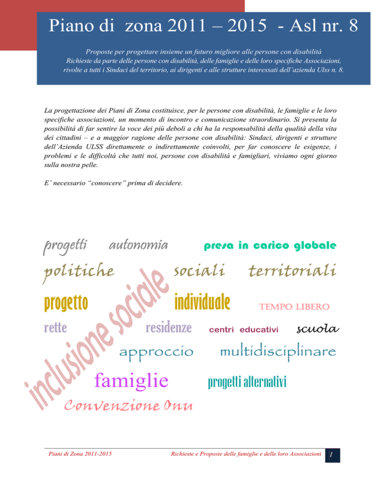 Piano di zona 2011 – 2015 - Asl nr. 8 Proposte per progettare insieme un futuro migliore alle persone con disabilità Richieste da parte delle persone con disabilità, delle famiglie e delle loro specifiche Associazioni, rivolte a tutti i Sindaci del territorio, ai dirigenti e alle strutture interessati dell’azienda Ulss n. 8. La progettazione dei Piani di Zona costituisce, per le persone con disabilità, le famiglie e le loro specifiche associazioni, un momento di incontro e comunicazione straordinario. Si presenta la possibilità di far sentire la voce dei più deboli a chi ha la responsabilità della qualità della vita dei cittadini – e a maggior ragione delle persone con disabilità: Sindaci, dirigenti e strutture dell’Azienda ULSS direttamente o indirettamente coinvolti, per far conoscere le esigenze, i problemi e le difficoltà che tutti noi, persone con disabilità e famigliari, viviamo ogni giorno sulla nostra pelle. E’ necessario “conoscere” prima di decidere. progetti autonomia presa in carico globale politiche sociali progetto individuale rette residenze approccio famiglie territoriali TEMPO LIBERO centri educativi scuola multidisciplinare progetti alternativi Convenzione Onu Piani di Zona 2011-2015 Richieste e Proposte delle famiglie e delle loro Associazioni 1 SOMMARIO 1. 2. 3. 4. 5. 6. 7. 8. 9. Richieste e Criticità pervenute dalle famiglie Convenzione ONU per i diritti delle persone con disabilità Presa in carico Progetto Individuale L.328/2000 Progetti autonomia Politiche per il “tempo libero” e l’integrazione sociale Centri educativi: - centro specializzato dps; - centro specializzato post scolastico - progetti sperimentali - contenimento del numero degli ospiti. - coinvolgimento delle famiglie Centro riabilitativo polifunzionale Rette strutture residenziali Piani di Zona 2011-2015 Richieste e Proposte delle famiglie e delle loro Associazioni 2 1. RICHESTE e CRITICITA’ PERVENUTE DALLE FAMIGLIE Le discussioni tra persone con disabilità, i famigliari e le loro Associazioni più rappresentative hanno fatto emergere criticità, richieste e proposte. In breve le elenchiamo di seguito e illustrate ed approfondite nelle pagine successive. Politiche locali. Nuove politiche (anche locali) rivolte alle persone con disabilità con riferimento alla legge n. 18, approvata in via definitiva dal parlamento nazionale il 3 marzo 2009: “Ratifica ed esecuzione della Convenzione delle Nazioni Unite sui diritti delle persone con disabilità”. La legge evidenzia il concetto d’inclusione sociale e quello conseguente d’immersione sociale. Prea in carico. Maggior coinvolgimento attivo delle persone con disabilità o delle loro famiglie nella Presa in Carico elaborando in reciproca collaborazione in conformità a competenze e ruoli Progetti di vita individualizzati e duttili nel tempo, tendenti: • a variegati approcci metodologici e terapeutici in relazione alle singole situazioni; • a percorsi di massima autonomia possibile; • ad obiettivi d’immersione sociale come riferimento costante delle relazione sociali; • a precisi, e possibilmente singoli, riferimenti come supporto, verifica ed evoluzione nel tempo del Progetto vita, in stretta collaborazione con la persona con disabilità e la sua famiglia. In relazione al punto precedente si evidenzia la necessità di proporre la realizzazione, in stretta collaborazione tra strutture ULSS, persone con disabilità, famiglie e loro associazioni specifiche, di alcune strutture e progetti di supporto alla presa in carico: • Progetto Individuale - L. 328/2000: carenza dei Comuni nelle ”politiche attive” sul tema della disabilità, avendo delegato in toto questa importante funzione alle Asl; scarsità d’iniziative per una vera inclusione della persona con disabilità sul territorio di residenza; maggior coinvolgimento dei Comuni sulle politiche sociali nel territorio; • Progetti autonomia: progettazione di percorsi per acquisire maggiore autonomia personale e sociale, nell’ottica della piena inclusione nella società; • Tempo libero e inclusione sociale: carenza di progettualità territoriali per una gestione attiva del tempo libero, dentro un progetto d’inclusione sociale; Attualmente è a completo carico delle famiglie e delle loro associazioni; • Centri diurni: chiediamo una maggior specializzazione dei centri. Riteniamo necessaria la presenza di: a. disturbi pervasivi dello sviluppo: un centro diurno/riabilitativo specializzato per la presa in carico dei soggetti inquadrati in questa gravissima patologia. b. un centro post scolastico “per giovani disabili” per consentire ai soggetti che terminano le scuole di continuare i loro programmi educativi di apprendimento e di autonomia; Nella realizzazione e gestione di tali strutture si auspica l’effettivo, e reale, coinvolgimento delle persone disabili e delle famiglie e, qualora richiesto, dalle loro associazioni specifiche. Piani di Zona 2011-2015 Richieste e Proposte delle famiglie e delle loro Associazioni 3 Scuola.. a. Rileviamo uno scarso collegamento tra scuola e servizi, il servizio “ponte” tra scuola e famiglia con l’istituzione dello psicologo di collegamento è, di fatto, vissuto negativamente dalla famiglie e dalla scuola stessa. b. Assistenza e autonomia a scuola: riduzione delle ore di addette all'assistenza, educazione e comunicazione che costringono a volte le famiglie a tenere a casa i figli per alcune ore settimanali La presa in carica della persona con disabilità nell’età adulta dovrebbe essere parte integrante del suo “Progetto vita” e proponiamo, oltre ai centri diurni di vario livello, anche la possibilità d’iniziative d’inclusione sociale lavorativa, sfruttando gli strumenti del Tirocinio, Borsa lavoro, … Sui Centri diurni, nei loro diversi livelli, rileviamo alcune linee importanti per un loro maggior efficienza, efficacia ed utilità: • Contenimento del numero degli ospiti nei centri diurni: il c