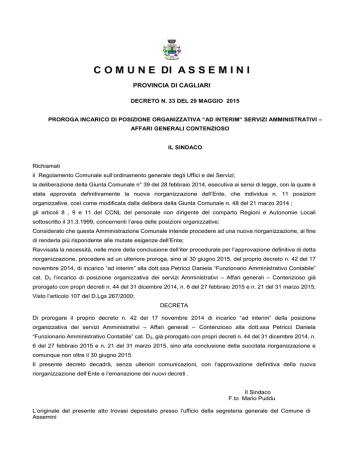 C O M U N E DI A S S E M I N I PROVINCIA DI CAGLIARI DECRETO N. 33 DEL 29 MAGGIO 2015 PROROGA INCARICO DI POSIZIONE ORGANIZZATIVA “AD INTERIM” SERVIZI AMMINISTRATIVI – AFFARI GENERALI CONTENZIOSO IL SINDACO Richiamati il Regolamento Comunale sull’ordinamento generale degli Uffici e dei Servizi; la deliberazione della Giunta Comunale n° 39 del 28 febbraio 2014, esecutiva ai sensi di legge, con la quale è stata approvata definitivamente la nuova riorganizzazione dell’Ente, che individua n. 11 posizioni organizzative, così come modificata dalla delibera della Giunta Comunale n. 48 del 21 marzo 2014 ; gli articoli 8 , 9 e 11 del CCNL del personale non dirigente del comparto Regioni e Autonomie Locali sottoscritto il 31.3.1999, concernenti l’area delle posizioni organizzative; Considerato che questa Amministrazione Comunale intende procedere ad una nuova riorganizzazione, al fine di renderla più rispondente alle mutate esigenze dell’Ente; Ravvisata la necessità, nelle more della conclusione dell’iter procedurale per l’approvazione definitiva di detta riorganizzazione, procedere ad un ulteriore proroga, sino al 30 giugno 2015, del proprio decreto n. 42 del 17 novembre 2014, di incarico “ad interim” alla dott.ssa Petricci Daniela “Funzionario Amministrativo Contabile” cat. D3 l’incarico di posizione organizzativa dei servizi Amministrativi – Affari generali – Contenzioso già prorogato con propri decreti n. 44 del 31 dicembre 2014, n. 6 del 27 febbraio 2015 e n. 21 del 31 marzo 2015; Visto l’articolo 107 del D.Lgs 267/2000; DECRETA Di prorogare il proprio decreto n. 42 del 17 novembre 2014 di incarico “ad interim” della posizione organizzativa dei servizi Amministrativi – Affari generali – Contenzioso alla dott.ssa Petricci Daniela “Funzionario Amministrativo Contabile” cat. D3, già prorogato con propri decreti n. 44 del 31 dicembre 2014, n. 6 del 27 febbraio 2015 e n. 21 del 31 marzo 2015, sino alla conclusione della succitata riorganizzazione e comunque non oltre il 30 giugno 2015. Il presente decreto decadrà, senza ulteriori comunicazioni, con l’approvazione definitiva della nuova riorganizzazione dell’Ente e l’emanazione dei nuovi decreti . Il Sindaco F.to Mario Puddu L’originale del presente atto trovasi depositato presso l’ufficio della segreteria generale del Comune di Assemini