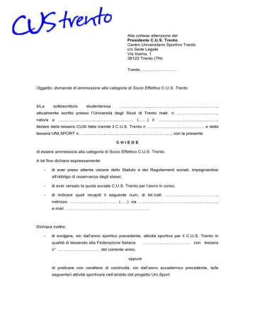 Alla cortese attenzione del Presidente C.U.S. Trento Centro Universitario Sportivo Trento c/o Sede Legale Via Inama, 1 38122 Trento (TN) Trento, …………………… Oggetto: domanda di ammissione alla categoria di Socio Effettivo C.U.S. Trento Il/La sottoscritto/a studente/ssa ………………...…………………………………………, attualmente iscritto presso l’Università degli Studi di Trento matr. n. ……………….………, nato/a a ………………………………….…………. (……) il ………...…………………………, titolare della tessera CUSI fatta tramite il C.U.S. Trento n. …….…..………………………. e della tessera UNI.SPORT n. ……………………………....………………………, con la presente CHIEDE di essere ammesso/a alla categoria di Socio Effettivo C.U.S. Trento. A tal fine dichiara espressamente: - di aver preso attenta visione dello Statuto e dei Regolamenti sociali, impegnandosi all'obbligo di osservanza degli stessi; - di aver versato la quota sociale C.U.S. Trento per l’anno in corso; - di indicare quali recapiti il seguente num. di tel./cell. ………...……………………., indirizzo …………………………… (…..) via ……………………………..………………..., e-mail ………………………………………….……….. Dichiara inoltre: - di svolgere, sin dall’anno sportivo precedente, attività sportiva per il C.U.S. Trento in qualità di tesserato alla Federazione Italiana …………………..……….. con tessera n° ………………………… del corrente anno, oppure di praticare con carattere di continuità, sin dall’anno accademico precedente, la/le seguente/i attività sportiva/e nell’ambito del progetto Uni.Sport: □ ginnastica □ calcio □ vela □ tennis □ basket □ dragon boat □ alpinismo □ ciclismo □ golf □ rugby □ palestra □ free climbing □ pattinaggio □ atletica □ sci □ footing □ hockey □ arti marziali □ triathlon □ canottaggio □ yoga □ danza □ baseball □ sport subacquei □ snowboard □ windsurf □ nuoto □ volley □……..….. □…….…………. Breve descrizione che attesti il carattere di continuità dell’attività sportiva indicata: …………………………………………………………………………………………………… ……………………………………………………………………….…………………………… ……………………………………………………………………..……………………………… ………………………………………………………………………………..…………………… …………………………………………………………………………………..………………… …………………………………………………………………………………………………… Con osservanza, Firma _____________________________________________ Informativa ai sensi del D.L. n.196/2003 (Codice in materia di protezione dei dati personali) Ai sensi del D.Lgs. 196/03 (codice in materia di protezione dei dati personali), La informiamo che: a. i Suoi dati personali verranno trattati dalla nostra Associazione per inviarLe gli avvisi di convocazione delle Assemblee dei Soci, per la gestione amministrativo-contabile prevista nello Statuto nonché per la realizzazione di iniziative sportive e culturali correlate con gli scopi e l’attività dell’Associazione incluse newsletter ed altri bollettini illustrativi della nostra attività; b. il trattamento dei dati avverrà con elaborazioni automatizzate e non automatizzate; c. il conferimento dei Suoi dati è obbligatorio per quanto attiene alla gestione dei rapporti con gli Associati prevista nello Statuto; in caso di suo rifiuto non potremo accogliere la Sua richiesta. Per le altre finalità di cui alla precedente lettera a), il citato conferimento è facoltativo ed un Suo rifiuto ci impedirà il futuro trattamento dei Suoi dati limitatamente alle suddette finalità; d. non è prevista la comunicazione né la diffusione dei Suoi dati, salvo per quanto attiene la realizzazione di iniziative sportiveo culturali e sempre che Ella acconsenta. In tal caso i dati potranno essere comunicati e diffusi ai terzi; e. in ogni momento Ella potrà esercitare i diritti previsti dall’art.8 del menzionato D.Lgs 196/2003 rivolgendosi all’Associazione CUS Trento. Il/La sottoscritto/a 1) [ ] acconsento [ ] non acconsento al trattamento dei propri dati personali da parte dell’Associazione CUS Trento, limitatamente a quanto necessario per la gestione amministrativo-contabile prevista nello Statuto (dati obbligatori) 2) [ ] acconsento [ ] non acconsento al trattamento dei miei dati personali –compresa la loro comunicazione e diffusione ai terzi- da parte dell’Associazione CUS Trento, in relazione ad iniziative sportive e culturali correlate con gli scopi e l’attività dell’Associazione CUS Trento. Data __________________________ Firma ___________________________________ ------------------------------------------------------------------------------------------------------------------------------Il Consiglio Direttivo del C.U.S. Trento nella seduta del ……………………. ha accolto la domanda di ammissione alla categoria di Socio Effettivo C.U.S. Trento. Firma del Presidente __________________________