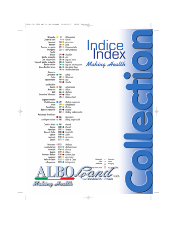 Albo Cat 2011 rel 06 da corregg 10-04-2012 18:01 Pagina 1 Ortopedia ■ 2 Orthopaedics 4 ● Corsets Corsetti e busti 13 ● Accessories Accessori 16 ● Belts Pancere 22 ● Pregnancy belts Pancere pre-parto 23 ● Post- pregnancy Post parto Spalla 24 ● Shoulder Braccio 26 ● Arm Gamba e caviglia 28 ● Leg and ankle Cinti e sospensori 30 ● Supports Supporti gamba e caviglia 34 ● Leg and ankle supports Bende adesive 36 ● Kinesiology tapes Linea Mueller Green 38 ● Mueller Green Line Sicurezza Carrozzina ■ 40 Safety 42 ● Wheelchair Letto 49 ● Bed Trasferimento 53 ● Transfer Antidecubito Cuscini ■ 58 Antidecubitus 60 ● Pillows Materassi 66 ● Mattress Velli 69 ● Vellum Gomitiere Talloniere 70 ● Helbows Heels Dispositivi medici Riabilitazione ■ 72 Medical Equipments 74 ● Rehabilitation Gessi 77 ● Plasters Ospedaliero 80 ● Hospital Bastoni Stampelle 82 ● Walking sticks Crutches Assistenza domiciliare ■ 86 Home Care Ausili per anziani ■ 88 Elderly people's aids Camici e divise ■ 98 Camici 100 Pantaloni 107 Berretti Cuffie 108 Calzini 109 Accessori 110 Zoccoli 111 ● ● ● ● ● ● Overalls Overalls Trousers Caps Cuffs Socks Accessories Clogs Benessere ■112 Coprimaterassi 114 Cervicale 116 Cuscini 119 Lombare Sedute 120 Accessori 121 Calza la Calza 122 Ledragomma 124 ● ● ● ● ● ● ● Wellness Mattress-covers Cervical Pillows Lumbar Seats Accessories Calza la Calza Ledragomma Dimensioni Colori Confezione Pagina/riga listino prezzi Dimensions Colours Packaging Price list page/line Albo Cat 2011 rel 06 da corregg 10-04-2012 18:02 Pagina 2 Albo Cat 2011 rel 06 da corregg 10-04-2012 18:02 Pagina 3 Albo Cat 2011 rel 06 da corregg 10-04-2012 18:02 Pagina 4 cod. 707 pag 2 riga 1 WORKSPORT Brevetto / Patent n. BO99U-000055 Bustino lombare preventivo - Ideale da indossare sopra gli indumenti prima di esercitare uno sforzo (legge 626). Indicato nello sport e nel lavoro. - Tessuto antibatterico. Chiusura adesiva con 2 tiranti regolabili. - Aiuta la muscolatura lombare negli sforzi fisici e nei movimenti della colonna vertebrale. Previene l’artrosi. - Indicato per la prevenzione antinfortunistica (legge 626). Preventive lumbar corset - Ideal to wear on the clothes before an effort. Recommended for sport and work. - Hygienically antibacterial tissue. Adhesive fastener with two adjustable strings. - Helps lumbar muscle structure during physical efforts and in the vertebral column movements. Prevents arthritis. Altezza anteriore / Front height : cm 14 Altezza posteriore / Rear height: cm 27 Nero / black In scatola / in a box da cm a cm / from cm to cm: misure / measures : ● 70/80 S ● 80/95 M ● E-WORK 95/110 L ● 110/125 115/135 XL XXL ● ●● cod. 608 pag 2 riga 2 ● CORSETTI Bustino lombare preventivo - Ideale da indossare sopra gli indumenti prima di esercitare uno sforzo (legge 626). Indicato nello sport e nel lavoro. - Tessuto antibatterico. Chiusura adesiva con 2 tiranti regolabili. - Aiuta la muscolatura lombare negli sforzi fisici e nei movimenti della colonna vertebrale. Previene l’artrosi. - Indicato per la prevenzione antinfortunistica (legge 626). CORSETS Preventive lumbar corset - Ideal to wear on the clothes before an effort. Recommended for sport and work. - Hygienically antibacterial tissue. Adhesive fastener with two adjustable strings. - Helps lumbar muscle structure during physical efforts and in the vertebral column movements. - Prevents arthritis. Altezza anteriore / Front height : cm 14 Altezza posteriore / Rear height: cm 24 Nero / black In scatola / in a box da cm a cm / from cm to cm: misure / measures : ● 70/80 S ● 80/95 95/110 110/125 115/135 M L XL XXL ● ● ● ●● ARTROSPORT cod. 352 pag 2 riga 3 Contenzione sul punto vita - Ideale per il lavoro, l’auto, lo sport e la moda. - Fresco elastico di cotone traforato millerighe. Chiusura a velcro regolabile. Waist contention - Ideal for work, car, sport and fashion. - Drilled striped elastic cotton. Velcro adjustable fastener. Altezza anteriore / Front height : cm 16 Altezza posteriore / Rear height : cm 21 Crema / cream In sacchetto / in a plastic bag 4 cm: 45 50 55 60 65 70 75 80 85 90 95 100 105 110 115 120 S M L XL XXL ● ● ● ● ● ● ● ● ● ● ● misure / measures : Albo Cat 2011 rel 06 da corregg 10-04-2012 18:02 Pagina 5 cod. 304 pag 2 riga 4 ARTROUNIVERSAL Decorsi postoperatori, sintomatologie artrosiche. - Idoneo nella prevenzione di strappi muscolari e sciatalgie. - Elastico di cotone pesante, incrociato posteriormente. - Automodellante, invisibile sul corpo, non disperde la temperatura corporea. - Resta a posto in qualsiasi atteggiamento corporeo. - Buona contenzione lombare. Post-operation courses, arthritis symptoms. - Recommended for preventing muscular tears and sciatic. - Heavy elastic cotton, crossed at the back. - Auto modelling, invisible on the body, keeps constant body temperature. - Stays firm in any corporal movement. Good lumbar contention. Altezza anteriore / Front height : cm 19 Altezza posteriore / Rear height : cm 28 Crema / cream In scatola / in scatola cm: 45 50 55 60 65 70 75 80 85 90 95 100 105 110 115 120 S M L XL XXL ● ● ● ● ●● ● ● ● ● misure / measures : ARTROUNIVERSAL C cod. 304/C pag 2 riga 5 Decorsi postoperatori della colonna vertebrale, artrosi acute. - Fresco elastico di cotone traforato mille righe. - Versione estiva del modello Artrouniversal. - Automodellante, incrociato posteriormente, invisibile sul corpo. Post operation courses of the spinal column, acute arthritis. - Striped drilled elastic cotton. - Summer version of the model Artrouniversal. - Auto modelling, crossed at the back, invisible on the body. Altezza anteriore / Front height : cm 19 Altezza posteriore / Rear height : cm 28 Crema / cream In scatola / in scatola 45 50 55 60 65 70 75 80 85 90 95 100 105 110 115 120 misure / measures : S M L XL XXL ● ● ● ● ●● ● ● ● ● cm: ARTROGRIP cod. 303 