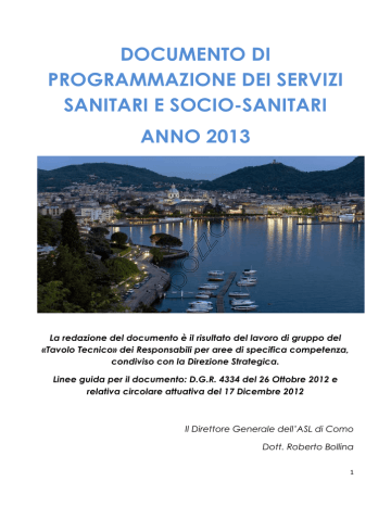 DOCUMENTO DI PROGRAMMAZIONE DEI SERVIZI SANITARI E SOCIO-SANITARI ANNO 2013 La redazione del documento è il risultato del lavoro di gruppo del «Tavolo Tecnico» dei Responsabili per aree di specifica competenza, condiviso con la Direzione Strategica. Linee guida per il documento: D.G.R. 4334 del 26 Ottobre 2012 e relativa circolare attuativa del 17 Dicembre 2012 Il Direttore Generale dell’ASL di Como Dott. Roberto Bollina 1 INDICE L’ASL DELLA PROVINCIA DI COMO CONTESTO TERRITORIALE CONTESTO EPIDEMIOLOGICO STILI DI VITA E ABITUDINI MALATTIE INFETTIVE NELLA PROVINCIA DI COMO ADESIONE ALLE ATTIVITÀ DI VACCINAZIONE NEOPLASIE (ATTIVITÀ REGISTRO TUMORI) ADESIONE ALLE ATTIVITÀ DI SCREENING INDICATORI DI DOMANDA E DI OFFERTA - AREA SANITARIA - AREA SOCIO-SANITARIA PROGRAMMAZIONE 2013 “IL CITTADINO AL CENTRO DEL SISTEMA SANITARIO E SOCIOSANITARIO” LE RISORSE DEL SISTEMA - ORGANIZZAZIONE E GESTIONE DEL SISTEMA ASL - L’ORIENTAMENTO DEL CITTADINO ALLA RELAZIONE CON I SERVIZI Informazione, Comunicazione e Fruibilità dei servizi - LA PREVENZIONE E TUTELA DELLA SALUTE La promozionedella salute La prevenzione per l’uomo La prevenzione negli ambienti di vita e lavoro La prevenzione veterinaria - LA PRESA IN CARICO DELL’ASSISTITO La rete dei servizi sanitari Il Governo della rete dei servizi sanitari territoriali La rete dei servizi socio-sanitari Il Governo della rete dei servizi socio-sanitari territoriali 2 L’ASL DELLA PROVINCIA DI COMO Con DGR del 19/12/2012 la Regione Lombardia ha approvato il Piano di Organizzazione 2012-2014 adottato dall’ASL di Como. Il Piano di Organizzazione Aziendale è lo strumento strategico che definendo l’organizzazione guida le azioni volte al miglioramento dell’efficienza e dell’efficacia per il perseguimento degli obiettivi di mandato e di sviluppo definiti dalla Regione Lombardia. In tale ottica le principali finalità sottese alle modifiche introdotte sono: riequilibrare il modello a matrice con una più attenta riconduzione della responsabilità gestionale ai livelli tecnici programmatori dipartimentali; valorizzare la dimensione territoriale, attraverso una migliore definizione delle responsabilità del Distretto Socio-Sanitario, quale portavoce organizzativo sul territorio della direzione aziendale e dei dipartimenti e garante del coordinamento logistico organizzativo nell’ambito territoriale di riferimento; sviluppare una maggiore flessibilità nell’utilizzo delle risorse professionali orientata al raggiungimento dei risultati; L’organigramma macro-organizzativo è di seguito rappresentato. Figura 1 – Organigramma macro-organizzativo – P.O.A. 2012-2014 L’azienda sanitaria è articolata nei seguenti dipartimenti: Dipartimento Programmazione Acquisto Controllo Sanitario Dipartimento delle Cure Primarie e Continuità Assistenziale Dipartimento di Prevenzione Medico Dipartimento di Prevenzione Veterinario Dipartimento Attività Socio-Sanitarie Integrate Dipartimento Dipendenze Dipartimento Amministrativo 3 L’assetto territoriale è organizzato in quattro Distretti socio-sanitari - Brianza (con le aree territoriali di Cantù, Erba e Mariano Comense), Como, Medio Alto Lario (con le aree territoriali di Menaggio e Dongo) e Sud-Ovest (con le aree territoriali di Olgiate Comasco e Lomazzo - Fino Mornasco) – e un distretto speciale - Campione d’Italia – oltre a quattro Distretti veterinari, territorialmente coincidenti con i Distretti socio-sanitari. Completano l’organizzazione aziendale le Unità di Staff che supportano la Direzione Strategica nelle funzioni di programmazione e di governance dell’azienda. La Mission e gli obiettivi aziendali L’ASL, all’interno dell’attuale sistema sanitario regionale, si pone come soggetto interprete della domanda di salute dei cittadini e di coordinamento nella programmazione della rete dei servizi sanitari e socio-sanitari a livello provinciale. L’ASL è garante, nei confronti del cittadino, dei livelli di qualità delle prestazioni sanitarie e socio-sanitarie acquistate dagli Erogatori pubblici e privati accreditati o direttamente erogate. L’ASL svolge, quindi, il ruolo di punto di contatto tra la rete sanitaria e il cittadino. Il suo assetto organizzativo gestionale, che copre l’intera provincia, assicura il compito di coordinare la rete dei medici di medicina generale e dei pediatri di famiglia, controllare e garantire la qualità e l’efficienza di ospedali, ambulatori e studi medici, svolgere direttamente interventi di igiene e prevenzione, compresa l’educazione sanitaria, svolgere interventi di medicina veterinaria ed effettuare alcune prestazioni di assistenza sanitaria. L’ASL nello svolgere e realizzare la propria mission ha scelto di dare priorità e valore alle seguenti azioni: Prevenire ed educare il cittadino alla salute; Garantire i Livelli Essenziali di Assistenza; Garantire efficacia ed efficienza nella gestione e valorizzare le risorse professionali aziendali. Acquisire i servizi dagli erogatori pubblici e privati accreditati migliorando la capacità organizzativa ed il monitoraggio della qualità delle prestazioni e delle prescrizioni mediche e farmaceutiche; Ampliare gli spazi e le occasioni di condivisione e programmazione a livello provinciale con gli Enti Locali, i Soggetti Erogatori ed il Terzo Settore; Le funzioni istituzionali che la ASL assicura sono riconducibili a quattro macro-aree: TUTELA Strumenti di indirizzo sulle attività erogate dal sistema sanitario e socio-sanitario CONTROLLO Attività direttamente svolte per il controllo degli erogatori con cui è attivo un contratto. PROCESSI ASSISTENZIALI Attività a carattere sanitario e socio-sanitario direttamente erogate MEDICINA TERRITORIALE CONVENZIONATA Attività sviluppate per la gestione dei rapporti convenzionali con MMG e PDF e CA Principi ispiratori della programmazione ASL 2013 Si assume quale elemento di attenzione prioritaria il principio “il cittadino al centro del sistema sanit