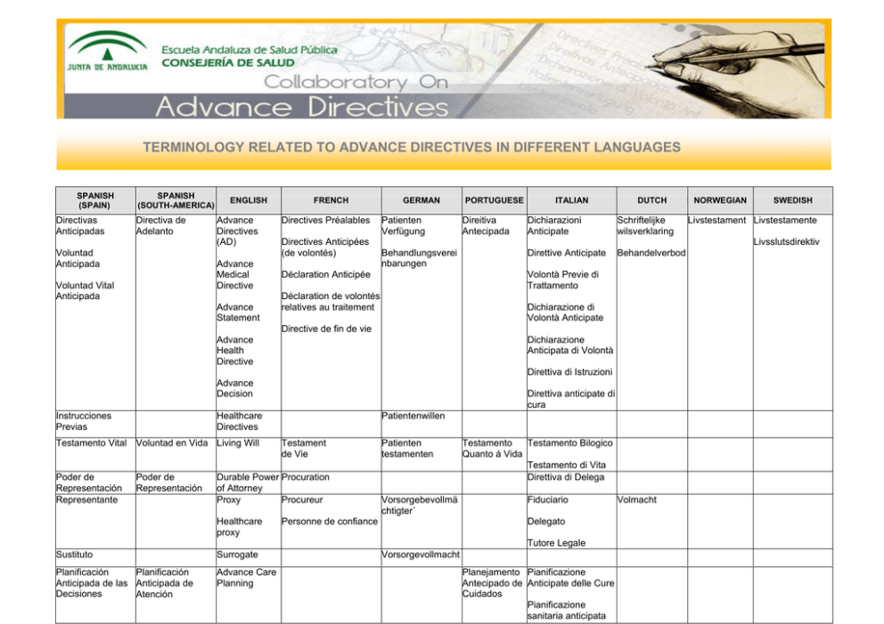 TERMINOLOGY RELATED TO ADVANCE DIRECTIVES IN DIFFERENT LANGUAGES SPANISH (SPAIN) Directivas Anticipadas SPANISH (SOUTH-AMERICA) Directiva de Adelanto Voluntad Anticipada ENGLISH Advance Directives (AD) Advance Medical Directive Voluntad Vital Anticipada Advance Statement FRENCH Directives Préalables Directives Anticipées (de volontés) GERMAN Patienten Verfügung PORTUGUESE Direitiva Antecipada ITALIAN DUTCH Dichiarazioni Anticipate Schriftelijke wilsverklaring Direttive Anticipate Behandelverbod Déclaration Anticipée Volontà Previe di Trattamento Déclaration de volontés relatives au traitement Dichiarazione di Volontà Anticipate Directive de fin de vie Dichiarazione Anticipata di Volontà Direttiva di Istruzioni Advance Decision Testamento Vital Voluntad en Vida Living Will Poder de Representación Representante Direttiva anticipate di cura Healthcare Directives Poder de Representación Patientenwillen Testament de Vie Durable Power Procuration of Attorney Proxy Procureur Healthcare proxy Patienten testamenten Vorsorgebevollmä chtigter´ Personne de confiance Testamento Testamento Bilogico Quanto á Vida Testamento di Vita Direttiva di Delega Fiduciario Delegato Tutore Legale Sustituto Surrogate Planificación Planificación Anticipada de las Anticipada de Decisiones Atención Advance Care Planning SWEDISH Livstestament Livstestamente Livsslutsdirektiv Behandlungsverei nbarungen Advance Health Directive Instrucciones Previas NORWEGIAN Vorsorgevollmacht Planejamento Pianificazione Antecipado de Anticipate delle Cure Cuidados Pianificazione sanitaria anticipata Volmacht TERMINOLOGY RELATED TO ADVANCE DIRECTIVES IN DIFFERENT LANGUAGES ENGLISH Advance Directives (AD) CHINESE (Hong Kong) SERBIAN o pristanku ili 預設醫療指示 Nalog nepristanku na TURKISH Yaşayan dilek Hoitotahto medicinski tretman Predhodno data izjava Advance Statement Predhodno dati nalog koji Hasta vasiyeti se tiče zdravlja Advance Health Directive Predhodna odluka Предварителни Progenesteres указания за Odigies лечение – ПУЛ Предварително пълномощно за здравни грижи Living Will Hoitotahto Durable Power of Attorney Proxy Trajno ovlašćenje za zastupanje Zastupnik uskottu henkilö Healthcare proxy Zakonski Zastupnik Advance Care Planning GREEK Предварително решение Nalozi koji se tiču ličnog prava na odlučivanje o zdravlju Pacijentov testament Surrogate BULGARIAN Yaşayan irade Advance Medical Directive Advance Decision Healthcare Directives FINNISH Zastupnik u vršenju ličnog prava na odlučivanje o zdravlju Zamenik Predhodno planirana nega Diathikes Zois