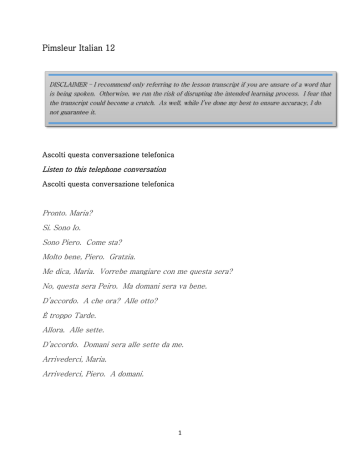 Pimsleur Italian 12 DISCLAIMER – I recommend only referring to the lesson transcript if you are unsure of a word that is being spoken. Otherwise, we run the risk of disrupting the intended learning process. I fear that the transcript could become a crutch. As well, while I’ve done my best to ensure accuracy, I do not guarantee it. Ascolti questa conversazione telefonica Listen to this telephone conversation Ascolti questa conversazione telefonica Pronto. Maria? Si. Sono Io. Sono Piero. Come sta? Molto bene, Piero. Gratzia. Me dica, Maria. Vorrebe mangiare con me questa sera? No, questa sera Peiro. Ma domani sera va bene. D’accordo. A che ora? Alle otto? È troppo Tarde. Allora. Alle sette. D’accordo. Domani sera alle sette da me. Arrivederci, Maria. Arrivederci, Piero. A domani. 1 Hello (when answering the phone) Pronto It’s me. It’s Peter. Sono Io. Sono Piero. Ascolti ancora. Listen again. Pronto. Maria? Si. Sono Io. Sono Piero. Come sta? Molto bene, Piero. Gratzia. Me dica, Maria. Vorrebe mangiare con me questa sera? No, questa sera Peiro. Ma domani sera va bene. D’accordo. A che ora? Alle otto? È troppo Tarde. Allora. Alle sette. D’accordo. Domani sera alle sette da me. Arrivederci, Maria. Arrivederci, Piero. A domani. This evening Questa sera Tomorrow evening Domani sera 2 At 6:00 Alle sei. Not later? Non piu tardi? At 8:00 Alle otto Oh, yes. I know. Oh, si. Lo so. What time is it now? Che ora è adesso? It’s 3:00. Sono le tres. It’s 2:00. Sono le due. Are you going to have lunch now? Pranza adesso? 3 No, I’m going to have lunch later. No, pranzo piu tardi. At 3:00. Alle tre. It’s 10:00 now. Sono le dieci adesso. No, it’s 4:00. No, sono le quattro. 5:00. Le cinque At 5:00, I’m going to have dinner. Alle cinque, ceno. Ceno le cinque. (Dinner at 5:00) Tell me. Are you going to eat? Mi dica. Mangia? Yes, with you. Si, con lei. 4 I’m going to eat with you. Mango con lei. I’m going to have dinner with you. Ceno con lei. Do you want to have dinner with me? Voule cenare con me? I too. Anchio. Yes, I, too, would like to eat. Si, Anchio vorre mangiare. I’m going to have dinner. Ceno. Would you like to drink some wine? Vorrebbe bere del vino No, I’m going to drink some beer. No, bevo della birra. Today Oggi 5 I’m not going to drink today. Non bevo oggi. Do you want to have dinner with me? Voule cenare con me? No, I don’t want to eat this evening. No, non voglio mangiare questa sera. Today, I am going to eat at 3:00. Oggi mangio alle tre. Or at 2:00. O alle due. Ok D’accordo How much? Quanto? How much do I owe you? Quanto lei devo? I owe you. (To you, I owe.) Lei devo. 6 How much do I owe you? Quanto lei devo? I don’t know. Non lo so. One euro. Un euro. How much do I owe you? Quanto lei devo? One euro. Un euro. Two euros. Due euro. Three euros. Tre euro. How much do I owe you today? Quanto lei devo oggi? 7 Eight euros. Otto euro. Eleven euros. Undici euro. Eleven. Undici How much? Quanto? How much do I owe you? Quanto lei devo? Twelve euros Dodici euro Eleven or twelve Undici o dodici Thirteen Tredici Thirteen euros Tredici euro 8 How much do I owe? Quanto lei devo? Twelve euros Dodici euro Thirteen euros Tredici euro Eleven euros Undici euro Ten euros Dieci euro Nine euros Nove euro Six euros Sei euro How much? Quanto? I don’t know Non lo so 9 Six Sei. Sei euro Do I owe you five euros? Lei devo cinque euro? No, ma’am. Four euros. No, signora. Quattro euro. And also seven euros. È anche sette euro. I owe you thirteen euros. Lei devo tredici euro. No, not thirteen. No, non tredici. Do I owe you twelve euros? Lei devo dodici euro? No, eleven euros. No, undici euro. Do you understand? Capisce? 10 Yes, I understand now. Si, capisco adesso. One euro Un euro Ascolti adesso. Listen now. Adesso ascolti e risponde. Now listen and respond. Buon giorno. Come sta oggi? Bene? No, non molto bene. Non sto molto bene. Vorrebbe mangiare qual cosa? No, gratzia. No, gratzia. Vorre bere qual cosa. Vorrebbe bere qual cosa? Del vino? No. Non vorre bere del vino. Vorre bere della birra. Della birra, per favore. Bene. Quando? Oggi? No, non oggi. Domani. Non questa sera? No, non questa sera. Domani sera. A che ora? Alle cinque? No, non alle cinque. Alle sei. No, allora alle sette. No, non alle sette. Alle otto. Ma no, alle dieci, per favore. 11 No, non alle dieci. Alle undici. D’accordo. Domani sera alle undici. Arrivederci. Quanto lei devo, signora? Tredici euro. Ma no, signora. Lei devo dodici euro. No, undici euro. No, lei devo dieci euro. No, no lei devo undici euro. Lei devo dieci euro. No, non dieci euro. Ma nove euro. No, signora. No nove, ma otto. Bene. Molto bene. Allora otto euro. Arrivederci. The End 12