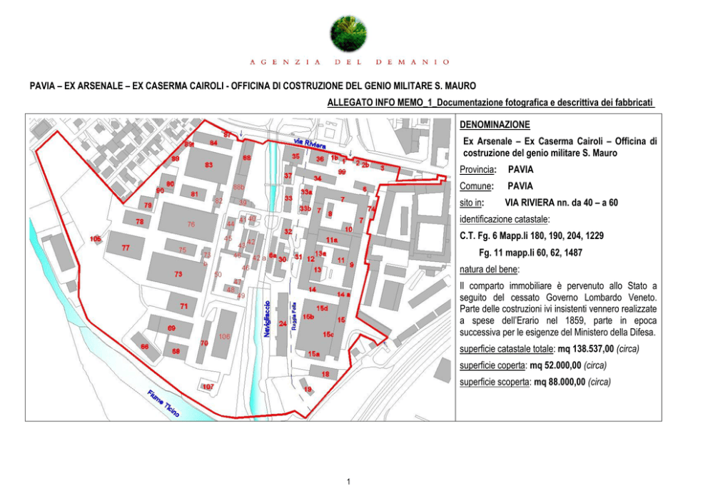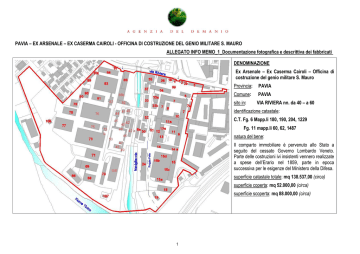 PAVIA – EX ARSENALE – EX CASERMA CAIROLI - OFFICINA DI COSTRUZIONE DEL GENIO MILITARE S. MAURO ALLEGATO INFO MEMO_1_Documentazione fotografica e descrittiva dei fabbricati DENOMINAZIONE Ex Arsenale – Ex Caserma Cairoli – Officina di costruzione del genio militare S. Mauro Provincia: PAVIA Comune: PAVIA sito in: VIA RIVIERA nn. da 40 – a 60 identificazione catastale: C.T. Fg. 6 Mapp.li 180, 190, 204, 1229 Fg. 11 mapp.li 60, 62, 1487 natura del bene: Il comparto immobiliare è pervenuto allo Stato a seguito del cessato Governo Lombardo Veneto. Parte delle costruzioni ivi insistenti vennero realizzate a spese dell’Erario nel 1859, parte in epoca successiva per le esigenze del Ministero della Difesa. superficie catastale totale: mq 138.537,00 (circa) superficie coperta: mq 52.000,00 (circa) superficie scoperta: mq 88.000,00 (circa) 1 INQUADRAMENTO TERRITORIALE 1) Ubicazione Il comparto edilizio “Ex Arsenale di Pavia”, si colloca in prossimità della zona centrale del centro pavese con estensione lungo l’asse viabilistico Pavia Ovest. Ha accessi principali carrabili e pedonali posti su via Riviera, civici da n. 40 a n.60 oltre accesso secondario da strada sterrata posta sul lato Sud-Est. Confina a Sud con il Fiume Ticino, salendo in senso antiorario, il lato Est con la linea ferroviaria, il comparto Ex Caserma Rossani, la Chiesa di San Mauro ed i suoi chiostri, e restante parte con la proprietà privata interclusa (rif. mapp.le 1432), che beneficia di servitù di passaggio carrabile dall’ingresso civ. 40. Il perimetro si chiude sul lato Nord, con recinzione in muratura affacciante sulla Via Riviera, poi frastagliata sul lato Ovest a confine con altre proprietà private, fino a chiudersi sul lato Sud Ovest con la proprietà privata individuata al mapp.le 53. Il compendio demaniale si presenta diviso principalmente in due importanti porzioni. L’asse divisorio è rappresentato dall’alveo del torrente Navigliaccio che si inserisce a Nord da via Riviera e si immette a Sud nel fiume Ticino. Un tratto di alveo interrato costituisce la via di unione e comunicazione delle due porzioni, oltre ad essere interessato da soprastante edificazione. Le due aree si caratterizzano come segue: porzione storica costituita da aree e corpi di fabbrica realizzati intorno alla metà dell‘800 e prima metà del ‘900, poi intensificata con l’inserimento di alcuni capannoni intorno gli anni ’80, con destinazione mista alloggi, uffici e depositi. L’area è interessata dall’attraversamento della “roggia Folla” tombinata, oltre ad avere perimetro Ovest posto sulla sponda del Navigliaccio. Su un tratto di alveo sorgono a lato due corpi di fabbrica (porzioni da definire). Questa porzione di maggior interesse storico artistica è individuata al C.T. di Pavia al Fg. 11 Mapp.le 60 – 62 ed ha accesso principale da Via Riviera n. 42. (situazione catastale non aggiornata) porzione interessata da edificazioni realizzate in epoche successive: si 2 / 24 IDENTIFICAZIONE CATASTO TERRENI Fg. Mapp.le Qualità/Classe 180 Semin Arb. 6/B 190 Bosco Misto / U 204 Semin Irriguo / 5 6/B 1229 EU 11/B 60 EU 11/B 62 EU 11/B 1487 EU Superficie Catastale Totale mq: Superficie mq 1.200 490 8.300 79.278,00 14.934,00 33.820,00 515,00 138.537,00 suppone dalla prima metà degli anni ’50 fino alla fine degli anni ’80. Trattasi di corpi di fabbrica ad uso prevalente a magazzini / depositi. Detta porzione è individuata al C.T. di Pavia al Fg. 6 Mapp.li 1229 – 180 – 190 – 204 ed ha accesso principale da Via Riviera n. 60. (situazione catastale non aggiornata) La giacitura del comparto demaniale è leggermente declive verso Sud. La pavimentazione è principalmente asfaltata con restante area a verde (prato incolto) con piantumazioni sia di tipo spontaneo che con essenze arboree ad alto fusto. Lungo il percorso sono presenti alberature ad alto fusto cadute a terra. L’intera area di interesse è recintata principalmente con struttura muraria e restante parte in rete metallica (quest’ultima prevalentemente lungo il perimetro Ovest e Sud). Lungo il perimetro posto su Via Riviera (lato Nord), sono presenti una cabina Enel (area adiacente al mapp.le 1432) ed altre n. 2 cabine incassate all’interno della recinzione muraria sempre a servizio Enel, poste in corrispondenza del civico n. 60. Su tutto il perimetro esterno è presente la linea di illuminazione costituita da pali con luce aggettante in parte sul perimetro esterno ed in parte sul perimetro interno. L’illuminazione interna è presente con elementi posti in corrispondenza delle facciate dei corpi di fabbrica. Sull’intera area insistono numerosi corpi di fabbrica (n. 65), prevalentemente ad uso magazzini, depositi ed officine, ed una residua parte ad uso terziario ed alloggi (porzioni storiche), oltre tettoie e strutture ove alloggiano impianti. Le coperture risultano essere costituite da elementi in lastre di fibrocemento (eternit) per una superficie stimata dall’AD in circa mq 14.000 (cfr. all. A), le restanti con rivestimento in coppi. 3 / 24 Fabbricati utilizzati a portineria, n. 2 alloggi, n.1 foresteria – Presunta edificazione: anno 1900-1920 Edificio nn. 1 e 1b ed edificio nn. 2 e 2b 1 2 Edificio n. 1 - Vista ingresso da civ. 40 di Via Riviera Trattasi di due corpi di fabbrica, posti in adiacenza tra loro e disposti in linea in corrispondenza dell’ingresso principale di Via Riviera al civ. 40. Costituiti da un unico piano fuori terra, hanno pianta rettangolare sfalsata tra loro, copertura a padiglione con rivestimento in coppi. La struttura portante è in muratura e le bucature sono arricchite da arco superiore a sesto ribassato non raccordato in mattoni a vista. Le finestre sono in legno e vetro semplice protette da ringhiera in ferro esterna. Simmetricamente si dispone analoga struttura (edificio 2 e 2b), sempre a cornice dell’ingresso. I corpi in corrispondenza dell’accesso carrabile e pedonale, erano utilizzati a portineria, men