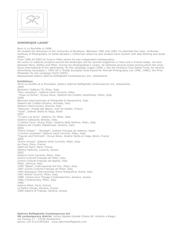 DOMINIQUE LAUGE’ Born in La Rochelle in 1958. He studied the literature to the University of Bordeaux. Between 1982 and 1984, he attended the class of Brooks Institute of Photography to Santa Barbara ( California) where he also studied Zone System with Bob Werling and Ansel Adam. From 1986 till 2005 he lived in Milan where he was independent photographer. He works on editorial projects around the landscape and for several magazines in Italy and in France today. He lives between Paris, Gaillac and Milan. During his photographer's career, he obtained several prizes among which the prize Epica International of the advertising, for the campaign Ciappi (1990 ); the Art Directors Club Italian Prize, for several advertising campaigns ( 1991-93 ); Kodak European Gold Award for Portrait Photography (on 1995, 1996); the Prize Mediastar for the campaign IULM (2005). Represented Gallery Sabrina Raffaghello Contemporary Art,, Alessandria Exhibitions 2010 Le Souffle et la Poussière, Gallery Sabrina Raffaghello Contemporary Art, Alessandria 2009 Bestiaire”,Galleria 70, Milan, Italy “Muri necessari“, Galleria Venti Correnti, Milan “Dopo La Sicilia”, Group Show, Galleria Del Credito Valtellinese, Milan, Italy 2008 Biennale Internazionale di Fotografia di Alessandria, Italy Gallerie del Credito Sicliano, Acireale, Italy Notturni Dannunziani, Brescia, Italy “Silences”, Musée des Beaux Arts de Gaillac, France “Suds“, Galerie Stella et Vega, Brest 2007 “Il cielo e la terra” Galleria 70, Milan, Italy Galleria Cidacarte, Brescia, Italy “L’ultima Cena” Group Show. Galleria delle Stelline, Milan, Italy Galleria del Credito Valtellinese, Sondrio, Italy 2006 “Entre-Temps” - “Sénégal”, Institut Français de Valence, Spain “L’occhio incantato” Galleria Venti Correnti, Milan, Italy “Figures and Portraits”. Group Show. Galerie Stella et Vega, Brest, France 2005 “Entre-Temps”, Galleria Venti Correnti, Milan, Italy Art Paris, Paris, France 2004 Art Paris, Paris, France 2003La fabbrica, Locarno, Suisse 2002 Galleria Venti Correnti, Milan, Italy Centre Culturel Français de Milan, Italy Centre Culturel Français de Naples, Italy FNAC, Genova, Italy 1999 “Babel”, Internazional Art Fair, Milan, Italy 1997 Centre Culturel Français de Milan, Italy 1993 Rassegna internazionale d’arte fotografica, Rome, Italy 1991 British Council, Milan, Italy 1988 Centre pour l’Image Contemporaine, Genève, Suisse 1986 Il Diaframma, Milan, Italy 1985 Galerie Éthel, Paris, France Le Ballon Rouge, Genève, Suisse 1984 Galerie le Trépied, Genève, Suisse Sabrina Raffaghello Contemporary Art SR contemporary district Antico Spedal Grande Chiesa SS. Antonio e Biagio via Treviso 17 - 15100 Alessandria phone +39 01311953264 www.sabrinaraffaghello.com