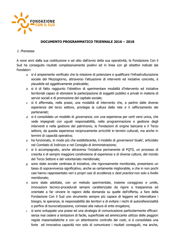 DOCUMENTO PROGRAMMATICO TRIENNALE 2016 – 2018 1. Premessa A nove anni dalla sua costituzione e ad otto dall’avvio della sua operatività, la Fondazione Con il Sud ha conseguito risultati complessivamente positivi ed in linea con gli obiettivi indicati dai Fondatori: a. si è ampiamente verificato che la missione di potenziare e qualificare l’infrastrutturazione sociale del Mezzogiorno, attraverso l’attuazione di interventi ed iniziative concrete, è plausibile ed oggettivamente praticabile; b. si è di fatto raggiunto l’obiettivo di sperimentare modalità d’intervento ed iniziative territoriali capaci di stimolare la partecipazione di soggetti pubblici e privati in materia di servizi sociali e di promozione del capitale sociale; c. si è affermata, nella prassi, una modalità di intervento che, a partire dalle diverse esperienze del terzo settore, privilegia la cultura della rete e il rafforzamento dei partenariati; d. si è consolidato un modello di governance, con una esperienza per certi versi unica, che vede impegnati con uguali responsabilità, nella programmazione e gestione degli interventi e nella gestione del patrimonio, le Fondazioni di origine bancaria e il Terzo settore, da questa esperienza reciprocamente arricchiti in termini culturali, ma anche in termini di capacità operativa; e. ha funzionato, in modo più che soddisfacente, il modello di governance ‘duale’, articolato nel Comitato di Indirizzo e nel Consiglio di Amministrazione; f. si è accompagnato, anche attraverso l’iniziativa permanente di FQTS, un processo di crescita e di sempre maggiore condivisione di esperienze e di diverse culture, del mondo del Terzo Settore e del volontariato meridionale; g. sono state avviate centinaia di iniziative, che rigorosamente monitorate, presentano un tasso di sopravvivenza significativo, anche se certamente migliorabile, e che in non pochi casi hanno rappresentato veri e propri casi di eccellenza e best practice non solo a livello meridionale; h. sono state adottate, con un metodo sperimentale, insieme coraggioso e umile, innovazioni tecnico-procedurali sempre caratterizzate da rigore e trasparenza ed orientate a far vincere le ragioni della domanda su quelle dell’offerta, a fare della Fondazione Con il Sud uno strumento sempre più capace di leggere ed intercettare i bisogni, le speranze, le responsabilità dei territori e di evitare i rischi di autoreferenzialità e perfino di burocratizzazione, connessi alla natura di ente erogatore; i. si sono sviluppate una prassi ed una strategia di comunicazione particolarmente efficaci: senza mai cedere a tentazioni di facile, superficiale ed ammiccante utilizzo delle peggiori regole massmediatiche e con un attentissimo controllo dei costi, si è consolidata una forte ed innovativa capacità non solo di comunicare i risultati conseguiti, ma anche, Documento programmatico triennale 2016-2018 facendo leva su di essi, di promuovere la missione e la “cultura” della Fondazione Con il Sud soprattutto tra i giovani e sui territori; j. in modo prudente e riflessivo, si è arricchito il dibattito sulla annosa ed apparentemente irrisolvibile “questione meridionale”, ancora ferma, in prevalenza, ad uno schema esclusivamente quantitativo, con una preoccupante sottovalutazione della centralità del capitale sociale nei processi di sviluppo. Va peraltro sottolineato che il contributo di esperienza e di riflessione della Fondazione Con il Sud, come era ampiamente prevedibile, raccoglie crescenti e significativi consensi nei territori, mentre fatica a farsi strada nel dibattito scientifico, politico ed istituzionale su questi temi; k. si è, in sintesi, dimostrato che si può intervenire con successo per una riattivazione del processo di sviluppo sociale e culturale delle regioni meridionali. E’ opportuno richiamare anche il dato relativo alla gestione del patrimonio: le scelte iniziali dei Fondatori, in termini di criteri di gestione e di asset allocation, insieme ad una gestione trasparente e professionale, hanno consentito di ottenere un rendimento medio annuo, al netto della tassazione, pari al 4,3%1. Un risultato più che soddisfacente, in quanto ottenuto in un periodo a lungo dominato dalla crisi finanziaria, manifestatasi nel 2008 e continuata per lunghi anni, nonché dal sensibile incremento della pressione fiscale sulle rendite finanziarie. E vale la pena di ricordare che la massima attenzione ai risultati della gestione patrimoniale, ovviamente doverosa per qualunque Fondazione di erogazione, è per la Fondazione Con il Sud, il cui patrimonio è stato costituito dal volontario conferimento di risorse da parte dei soci fondatori, un impegno, se possibile, ancora più vincolante. Il richiamo ai risultati raggiunti nei primi anni di attività della Fondazione Con il Sud non ha lo scopo di determinare un atteggiamento di autocompiacimento, anche perché è del tutto evidente che vi sono ampi margini di miglioramento. Esso vuole, piuttosto, sostenere la scelta fondamentale che ispira questo documento programmatico, che è quella della continuità con le strategie, i criteri ed i modelli di gestione sinora adottati. Tale scelta di continuità, arricchita da percorsi di innovazione e di sperimentazione suggeriti dall’esperienza, proposti dai soggetti ed imposti dalla crisi del welfare che si manifesta anche in una forte espansione delle povertà, ispira le diverse articolazioni di questo documento, che è frutto di un lavoro, avviato all’inizio del 2015, che ha determinato confronti collegiali ed anche riflessioni individuali negli organi e nel mondo di riferimento. 2. Linee guida di intervento 2.1 Ambito territoriale Viene confermato che la Fondazione Con il Sud opera con i suoi interventi nei territori di Campania, Puglia, Basilicata, Calabria, Sicilia e Sardegna. La Fondazione potrà sostenere, nella regione Molise, con i meccanismi già collaudati, l’eventuale nascita di una Fondazione di Comunità. 1 Tale rend