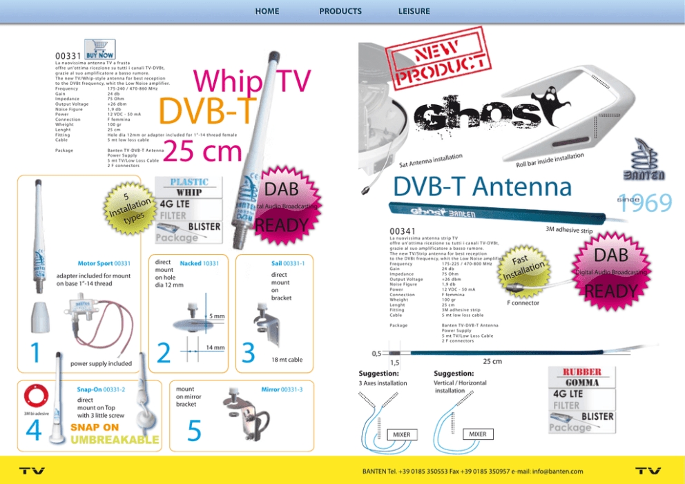 HOME LEISURE PRODUCTS 00331 La nuovissima antenna T V a frusta offre un'ottima r icezione su tutti i c anali T V-D VBt, gra zie al suo amplific atore a basso ru more. The new T V/Whip-st yle antenna for b est recep tion to the D VBt frequenc y, w hit the Low Noise amp lifier. Frequenc y 175-240 / 470-860 M Hz G ain 24 db Im p edance 75 O hm Output Voltage +26 dbm Noise Figu re 1,9 db Power 12 V DC - 50 mA Connec t ion F femmina Wheight 100 gr Lenght 25 cm Fitting H ole dia 12mm or adap ter inc luded for 1”-14 th read female Ca ble 5 mt low loss c able Whip TV DVB-T Pa ck age 25 cm B anten T V-D V B-T Anten n a Power Supply 5 mt T V /Low Loss Cab le 2 F connec tors Motor Sport 00331 adapter included for mount on base 1”-14 thread READY direct Nacked 10331 mount on hole dia 12 mm La n u ov issima a nten n a st r ip T V of f re u n 'ot t ima r icez ion e su t u t t i i c a n a li T V -D V Bt, g ra z ie a l su o a mp lif ic atore a b a sso ru more. Th e n ew T V /St r ip a nten n a for b est recep t ion to t h e D V Bt f requ en c y, wh it t h e Low Noise a mp lif ier. Frequ en c y 1 7 5 -2 2 5 / 4 7 0 -8 0 0 M Hz G a in 2 4 db I mp eda n ce 75 Ohm O u t p u t Volt a g e +2 6 db m Noise Fig u re 1 , 9 db Power 1 2 V DC - 5 0 mA Con n ec t ion F femmin a Wh eig ht 100 gr Len g ht 2 5 cm Fit t in g 3 M a dh esive st r ip Ca b le 5 mt low loss c a b le Sail 00331-1 direct mount on bracket 14 mm 18 mt cable power supply included Snap-On 00331-2 4 direct mount on Top with 3 little screw UMBREAKABLE mount on mirror bracket 5 Mirror 00331-3 3M adhesive strip 00341 Pa ck a g e SNAP ON ion installat Digital Audio Broadcasting 5 mm 3M bi-adesive inside Roll bar DVB-T Antenna DAB 5 tion a l l a Inst ypes t n stallatio nna in Sat Ante B a nten T V -D V B-T Anten n a Power Su p p ly 5 mt T V /Low Loss Ca b le 2 F con n ec tor s 0,5 1,5 Suggestion: 3 Axes installation MIXER 25 cm Suggestion: Vertical / Horizontal installation MIXER Fast ion llat a t s In F connector DAB Digital Audio Broadcasting READY