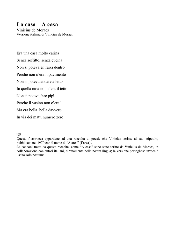 La casa – A casa Vinicius de Moraes Versione italiana di Vinicius de Moraes Era una casa molto carina Senza soffitto, senza cucina Non si poteva entrarci dentro Perché non c’era il pavimento Non si poteva andare a letto In quella casa non c’era il tetto Non si poteva fare pipì Perché il vasino non c’era lì Ma era bella, bella davvero In via dei matti numero zero NB Questa filastrocca appartiene ad una raccolta di poesie che Vinicius scrisse ai suoi nipotini, pubblicata nel 1970 con il nome di “A arca” (l’arca) . Le canzoni tratte da questa raccolta, come “A casa” sono state scritte da Vinicius de Moraes, in collaborazione con autori italiani, direttamente nella nostra lingua; la versione portoghese invece è uscita solo postuma.