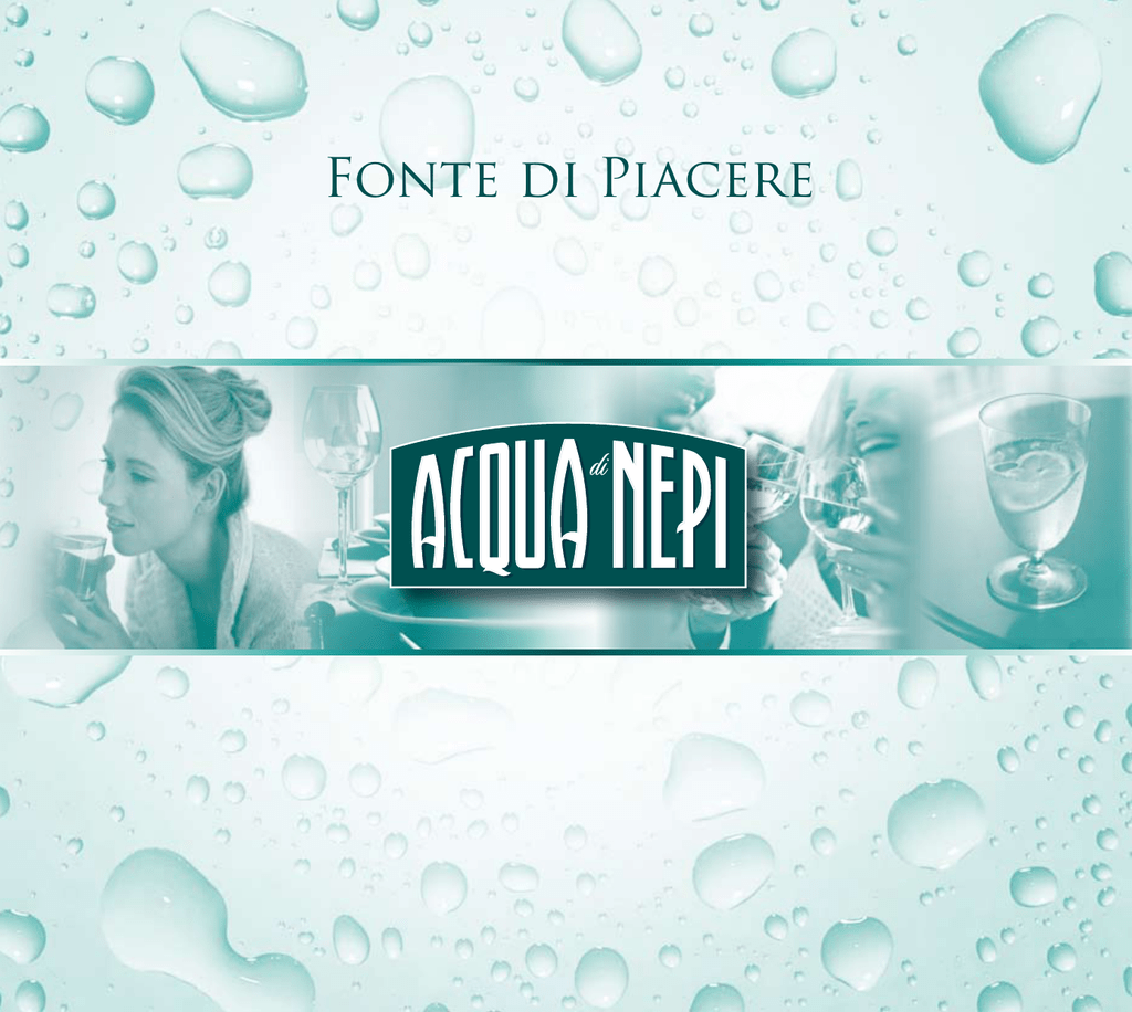 Fonte di Piacere Da Sempre è Fonte di Piacere L’Acqua di Nepi, “Fonte di Piacere”, sgorga dalle sorgenti dei monti Cimini nei pressi del paese che le ha dato il nome, un luogo dalla natura protetta e incontaminata. Già nota come Terme dei Gracchi, per l’importante centro termale creato dalla famosa famiglia romana, è oggi l’acqua preferita dai grandi chef italiani, per la sua effervescenza delicata, conferita dall’origine vulcanica, e per la leggerezza del suo gusto inconfondibile. La Qualità del Piacere è Garantita Le sue preziose qualità la rendono perfetta in ogni situazione grazie all’equilibrio di elementi come il magnesio, il calcio, il potassio che uniti ad un basso tenore di sodio le conferiscono una leggerezza unica e una delicata effervescenza naturale. Un’armonia che ne esalta il gusto e la rende l’acqua ideale per tutti coloro che ricercano il vero piacere della tavola. L’Acqua di Nepi ha inoltre caratteristiche uniche nei confronti delle altre effervescenti naturali, come il suo basso residuo fisso, solo 571 mg/litro. La sua qualità è garantita dai severi controlli effettuati alle sorgenti 24 ore su 24 e dalla genuinità con cui viene imbottigliata. L’acqua, infatti, è imbottigliata come sgorga dalla sorgente e non entra mai in contatto con l’aria: è una cura che preserva tutti i suoi principi e la purezza, dalla fonte fino alla tavola. basso residuo fisso equilibrio perfetto di minerali ideale per una dieta povera di sodio Il Piacere è Effervescente • Nel mercato con i più importanti consumi, la richiesta di acqua effervescente naturale è in crescita. • La notorietà della marca Acqua di Nepi è in costante crescita anche tra chi non la consuma abitualmente. • Acqua di Nepi è in linea con i nuovi stili di vita che valorizzano l’aspetto sensoriale e la ricerca del piacere. • I grafici dimostrano il valore aggiunto del segmento Effervescente Naturale. Peso a Volume delle Vendite effervescente naturale Peso a Valore delle Vendite frizzante leggermente frizzante Investiamo nel Piacere Obiettivo: Far crescere e affermare a livello nazionale la marca Acqua di Nepi Pianificazione media su: 3 canali RAI principali network radiofonici del Centro Italia campagna stampa su Il Messaggero e La Repubblica Testimonial d’eccezione: Fabio Campoli, il grande chef noto per la sua abilità di bilanciare gusto e piacere senza tralasciare l’aspetto salutistico. 1 Lt 0,75 Lt Acqua Minerale Effervescente Naturale Quantità Prodotto 0,75 Lt VAR 1 Lt VAR 0,75 Lt VAP cartone Codice Prodotto 3571 3517 3581 Codice EAN bott. 8032909570096 bott. 8032909570058 bott. 8032909570096 Pezzi x confezione 12 12 12 Strati x pallet 5 5 5 Confezione x pallet 40 40 70 Peso lordo 675 852 1040 Altezza pallet mm 1785 mm 1785 1540 Il Piacere è Servito È ormai diffusa la tendenza anche nei ristoranti a esprimere la propria preferenza dell’acqua da abbinare alle specialità con una forte crescita di quelle delicate e naturalmente effervescenti. Acqua di Nepi con la sua sottile effervescenza ed il suo equilibrio è perfetta per valorizzare la degustazione e per essere l’accompagnamento ideale a tavola. 1 Lt 0,75 Lt Acqua Minerale Rinforzata con il Gas della Sorgente Quantità Prodotto 0,75 Lt VAR 1 Lt VAR 0,75 Lt VAP cartone Codice Prodotto 3572 3518 3582 Codice EAN bott. 8032909570102 bott. 8032909570065 bott. 8032909570102 Pezzi x confezione 12 12 12 Strati x pallet 5 5 5 Confezione x pallet 40 40 70 Peso lordo 675 852 1040 Altezza pallet mm 1785 mm 1785 1540 Effervescente Naturale 1 Lt 0,75 Lt Rinforzata con il Gas della Sorgente 1 Lt 0,75 Lt Il Piacere Prende Forma Nella ristorazione le bottiglie in vetro da 1 lt e 0,75 lt si presentano con un design moderno ed innovativo legato ad un packaging elegante in grado di enfatizzare le radici storiche delle sorgenti. Il gusto delicato e unico dell’Acqua di Nepi diventa un piacere anche estetico, che conferisce al ristorante quel tocco di classe in più e un’immagine di luogo capace di offrire grande qualità ed eleganza. Anche i dettagli sono molto raffinati come il tappo talog in alluminio, un accessorio fondamentale che garantisce l’integrità del prodotto e la sua conservazione anche dopo l’apertura. L’acqua di Nepi è proposta sia nella versione Naturale, imbottigliata come sgorga dalla sorgente e riconoscibile dall’etichetta verde, sia Frizzante, con l’aggiunta delle bollicine naturali della sorgente e con l’etichetta rossa. 2 Lt Acqua Minerale Effervescente Naturale 0,5 Lt Quantità Prodotto 0,46 Lt VAR 2 Lt VAR Codice Prodotto 3551 3521 Codice EAN bott. 8032909570072 bott. 8032909570010 Pezzi x confezione 20 8 Strati x pallet 6 4 Confezione x pallet 54 36 Peso lordo 980 862 Altezza pallet mm 1750 mm 1650 Il Piacere della Tradizione Acqua di Nepi, da sempre sensibile al contesto ecologico, ha posto particolare attenzione a tutti i formati in vetro, dedicati sia alla ristorazione che al consumo in casa, i quali consentono un recupero e riutilizzo delle bottiglie generando così un risparmio energetico importante ed una maggiore pulizia e praticità. 2 Lt Acqua Minerale Rinforzata con il Gas della Sorgente 0,5 Lt Quantità Prodotto 0,46 Lt VAR 2 Lt VAR Codice Prodotto 3552 3522 Codice EAN bott. 8032909570089 bott. 8032909570027 Pezzi x confezione 20 8 Strati x pallet 6 4 Confezione x pallet 54 36 Peso lordo 980 862 Altezza pallet mm 1750 mm 1650 Effervescente Naturale 2 Lt Rinforzata con il Gas della Sorgente Acqua di Nepi nel vuoto a rendere è proposta sia nel tradizionale bottiglione da 2 lt, per continuare una antica tradizione della nostra regione, che nella versione da 0,5 lt, nella storica bottiglia Vichy. La naturalità è sempre garantita, sia nella versione naturale che in quella rinforzata con gas alla sorgente. 2 Lt 0,5 Lt Piccola o Grande, è Sempre un Piacere 0,5 Lt 1,5 Lt Tutto il Piacere della Praticità Il formato in PET è diventato il più importante per il segmento del consumo i