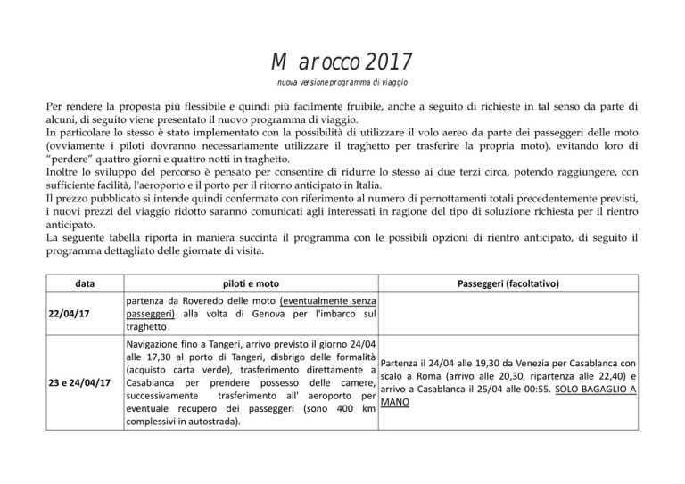Marocco 2017 nuova versione programma di viaggio Per rendere la proposta più flessibile e quindi più facilmente fruibile, anche a seguito di richieste in tal senso da parte di alcuni, di seguito viene presentato il nuovo programma di viaggio. In particolare lo stesso è stato implementato con la possibilità di utilizzare il volo aereo da parte dei passeggeri delle moto (ovviamente i piloti dovranno necessariamente utilizzare il traghetto per trasferire la propria moto), evitando loro di “perdere” quattro giorni e quattro notti in traghetto. Inoltre lo sviluppo del percorso è pensato per consentire di ridurre lo stesso ai due terzi circa, potendo raggiungere, con sufficiente facilità, l'aeroporto e il porto per il ritorno anticipato in Italia. Il prezzo pubblicato si intende quindi confermato con riferimento al numero di pernottamenti totali precedentemente previsti, i nuovi prezzi del viaggio ridotto saranno comunicati agli interessati in ragione del tipo di soluzione richiesta per il rientro anticipato. La seguente tabella riporta in maniera succinta il programma con le possibili opzioni di rientro anticipato, di seguito il programma dettagliato delle giornate di visita. data piloti e moto 22/04/17 partenza da Roveredo delle moto (eventualmente senza passeggeri) alla volta di Genova per l'imbarco sul traghetto 23 e 24/04/17 Navigazione fino a Tangeri, arrivo previsto il giorno 24/04 alle 17,30 al porto di Tangeri, disbrigo delle formalità (acquisto carta verde), trasferimento direttamente a Casablanca per prendere possesso delle camere, successivamente trasferimento all' aeroporto per eventuale recupero dei passeggeri (sono 400 km complessivi in autostrada). Passeggeri (facoltativo) Partenza il 24/04 alle 19,30 da Venezia per Casablanca con scalo a Roma (arrivo alle 20,30, ripartenza alle 22,40) e arrivo a Casablanca il 25/04 alle 00:55. SOLO BAGAGLIO A MANO 25/04/17 Ore 1,00 circa: Dall'aeroporto di Casablanca a Casablanca in hotel 25/04/17 Dopo il meritato riposo, il pomeriggio sarà dedicato alla visita della città e della moschea di Hassan II, la più grande al mondo dopo la Mecca e con il minareto più alto al mondo (mt 210). Pernottamento a Casablanca. 26/04/17 Trasferimento a Marrakech (km 240 in autostrada), nel pomeriggio visita guidata della città. 27/04/17 Visita guidata di Marrakech 28/04/17 Trasferimento ad Ait Ben Haddou attraverso il passo Tizi n'Tichka a 2260 mt, con visita intermedia alla kasbah di Telouet 29/04/17 Trasferimento a Tinghir, con deviazione a nord fino al villaggio di Bou-Thrarar, attraversando un territorio di una trentina di km ininterrotti di coltivazioni di rose. Si proseguirà poi fino a Boumalne Dades, da cui si farà un'altra deviazione verso nord per visitare le famose Gorges du Dades. 30/04/17 Trasferimento a Merzouga, un tempo punto di sosta lungo le piste che attraversavano il deserto. Prima di prendere la strada per Merzouga, è praticamente obbligatoria una deviazione a nord di Tinghir per visitare le gole del Todra, uno dei canyon più spettacolari del mondo. Volendo si può proseguire sino al villaggio berbero di Tamtattouchte. 01/05/17 La giornata sarà dedicata alle escursioni sul deserto, magari semplicemente camminando a piedi nudi nella sottile sabbia delle dune. Non si mancherà l'escursione a cavallo di dromedario per vedere il tramonto nel deserto. Nelle ore più calde nulla vieta di passare alcune ore di relax in hotel, anche per recuperare le energie consumate nei giorni precedenti. 02/05/17 Trasferimento a Beni Mellal via Midelt (km 480) sulla strada per Casablanca Prima possibilità di rientro anticipato data piloti e moto Passeggeri (facoltativo) 03/05/17 Eventuale trasferimento all'aeroporto di Casablanca per Imbarco all'aeroporto di Casablanca, con partenza alle ore volo del passeggero, poi al porto di Tangeri per imbarco 16:15 con Alitalia con scalo a Roma (arrivo 20,20, alle ore 23:00 (km 564) o a Azrou per proseguire il viaggio ripartenza alle 21,30). Arrivo a Venezia alle 22:35 (Km 519) 04 e 05/05/17 Navigazione da Tangeri a Genova. Arrivo a Genova il 06/05 alle ore 00:30 Prosecuzione viaggio del gruppo restante 03/05/17 Trasferimento alle cascate d'Ouzoud e poi trasferimento ad Azrou attraverso la Foresta dei cedri e le bertucce (Km 380) 04/05/17 Trasferimento a Fes via Ifrane (km 90) e prima parte della visita di Fes 05/05/17 Fes per visita della città 06/05/17 Trasferimento a Meknes per la visita della città e di Volubilis 07/05/17 Visita di Meknes Seconda possibilità di rientro anticipato data piloti e moto Passeggeri (facoltativo) 08/05/17 Eventuale trasferimento a Rabat (aeroporto per volo Imbarco per volo aereo CON 1 SCALO IN AEROPORTO passeggero) e poi Tangeri per imbarco verso Genova alle INTERNAZIONALE verso Venezia ore 23,00 - Km 380 09/05/17 Navigazione 10/05/17 Navigazione, arrivo a Genova il 11/5 alle ore 00,30 Prosecuzione viaggio del gruppo restante 08/05/17 Meknes e/o Volubilis 09/05/17 Trasferimento a Rabat 10/05/17 Rabat per la visita della città 11/05/17 Trasferimento a Chefchaouen 12/05/17 Visita di Chefchaouen 13/05/17 Trasferimento a Tangeri per l'imbarco verso Genova alle ore 16,00. Visita delle grotte d'Ercole durante il trasferimento Km 262 14/05/07 Navigazione 15/07/07 Navigazione, arrivo a Genova alle ore 17:30 Marocco 2017 dal 22 Aprile a 15 Maggio Lo scrittore marocchino Tahar ben Jelloun scriveva del Marocco: “Il Marocco è un susseguirsi di porte che si spalancano a mano a mano che si avanza. E non si può avanzare se non visitandolo assiduamente, e conservando in sé il desiderio dello stupore, la curiosità di conoscere e di assimilare". Davide Biga, Responsabile Grandi Viaggi della Commissione Turistica FMI, scrive sulla rivista della Federazione motociclistica Italiana: “Il Marocco è per moltissimi viaggiatori di lunga esperienza (me compreso) uno dei luoghi più belli e affascinanti da visitare, soprattutto in sella alla propria moto...” Affascinante e suggestivo,