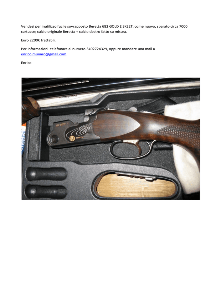 Vendesi per inutilizzo fucile sovrapposto Beretta 682 GOLD E SKEET, come nuovo, sparato circa 7000 cartucce; calcio originale Beretta + calcio destro fatto su misura. Euro 2200€ trattabili. Per informazioni telefonare al numero 3402724329, oppure mandare una mail a [email protected] Enrico