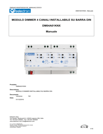DM04A01KNXFI00030100_MANUALE.DOCX DM01D01KNX– Manuale MODULO DIMMER 4 CANALI INSTALLABILE SU BARRA DIN DM04A01KNX Manuale Prodotto: DM04A01KNX Descrizione: MODULO DIMMER INSTALLABILE SU BARRA DIN Documento Versione: Data: 01/12/2016 1.0 Eelectron Spa Via Claudio Monteverdi 6, I-20025 Legnano (MI), Italia Tel +39 0331.500802 - Fax +39 0331.564826 www.eelectron.com [email protected] C.F. e P.IVA 11666760159 Capitale sociale: 800.000,00€ interamente versato Tribunale di Milano 359157-8760-07 CCIAA Milano 1486549 1/15 DM04A01KNXFI00030100_MANUALE.DOCX DM01D01KNX– Manuale INDICE 1. 2. 3. 4. 5. 6. 7. 8. 9. 10. 11. 12. 13. 13.1. 14. 15. 16. 17. Introduzione Generale .................................................................................................................................. 3 Descrizione Prodotto ..................................................................................................................................... 3 Configurazione Parametri Generali ............................................................................................................... 3 Canale <X> Generale ................................................................................................................................... 4 Canale <X> Configurazione .......................................................................................................................... 6 Funzioni temporizzate ................................................................................................................................... 7 Funzione ON/OFF con ritardo ....................................................................................................................... 7 Funzione ON ritardo attivazione / off temporizzato ....................................................................................... 8 ON/OFF vs Funzioni di Temporizzazione ................................................................................................... 10 Funzioni Ausiliarie ....................................................................................................................................... 10 Funzione Logica.......................................................................................................................................... 10 Funzione Blocco ......................................................................................................................................... 11 Funzione Scenari ........................................................................................................................................ 12 Funzione Scenari Dinamici .................................................................................................................... 12 Funzione Allarme ........................................................................................................................................ 13 Tabella per le priorità del canale ................................................................................................................. 14 Comportamento del canale d'uscita su calo di tensione, ripristino e messa in servizio............................... 14 Oggetti di comunicazione ............................................................................................................................ 15 Tutte le informazioni all'interno di questo manuale possono essere modificate senza preavviso. Questo manuale si può scaricare liberamente dal sito: www.eelectron.com Esclusione di responsabilità: Nonostante la correttezza dei dati contenuti all’interno questo documento sia stata verificata, non è possibile escludere la presenza di errori o refusi; Eelectron pertanto non si assume alcuna responsabilità a riguardo. Eventuali correzioni che si renderanno necessarie saranno inserite negli aggiornamenti di questo manuale Simbolo per informazione rilevante Simbolo di sicurezza Eelectron Spa Via Claudio Monteverdi 6, I-20025 Legnano (MI), Italia Tel +39 0331.500802 - Fax +39 0331.564826 www.eelectron.com [email protected] C.F. e P.IVA 11666760159 Capitale sociale: 800.000,00€ interamente versato Tribunale di Milano 359157-8760-07 CCIAA Milano 1486549 2/15 DM04A01KNXFI00030100_MANUALE.DOCX DM01D01KNX– Manuale 1. Introduzione Generale Questo manuale è utilizzato dagli installatori e descrive le funzioni e i parametri del modulo DM04A01KNX e come modificare le impostazioni e le configurazioni utilizzando lo strumento software ETS. 2. Descrizione Prodotto Il modulo DM04A01KNX è un modulo designato per essere installato in case ed edifici (es. uffici, hotel, case private, ecc...). Trasformatori elettronici con avvolgimento secondario chiuso su carico resistivo (Lampade alogene 12/24V) 200 VA, 230V~ 50/60Hz, Lampade LED regolabili 230V~ max. 60W Lampade compatte fluorescenti (ESL/CFL) 230V~ max. 60W Per le lampade a LED o ESL, il corretto funzionamento dipende strettamente dalla lampada utilizzata, quindi non c'è alcuna garanzia in anticipo riguardo al corretto funzionamento di questo tipo di lampade, anche se sono dichiarate come dimmerabili. 3. Configurazione Parametri Generali PARAMETRI KNX Ritardo invio telegramma all'accensione I quattro canali funzionano con una sola fase. Il prodotto è progettato per essere installato su barra DIN in cassetta di distribuzione. Carichi permessi TIPO DI CARICO MASSIMA POTENZA/TENSIONE Incandescenza o 300 W, 230V~ 50/60Hz, lampade alogene Trasformatori ferromagnetici adatti alla regolazione con avvolgimento secondario chiuso su carico resistivo (Lampade alogene 12/24V) 300 VA, 230V~ 50/60Hz, IMPOSTAZIONI 5 ÷ 15 secondi Attraverso questo parametro è possibile impostare il ritardo di trasmissione dei telegrammi dopo l'accensione. In impianti di grandi dimensioni dopo una mancanza di corrente o uno spegnimento, questo ritardo consente di evitare di generare traffico eccessivo sul bus, provocando un rallentamento delle prestazioni o un blocco di trasmi