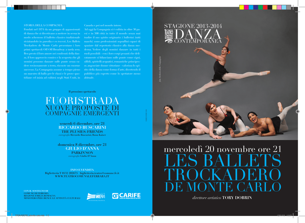 STAGIONE 2013-2014 Canada e poi nel mondo intero. Ad oggi la Compagnia si è esibita in oltre 30 paesi e in 500 città in tutto il mondo senza mai tradire il suo spirito originario: i ballerini (tutti maschi) sono professionisti sopraffini capaci di spaziare dal repertorio classico alla danza moderna. Vedere degli uomini danzare in tutti i ruoli possibili - con i loro corpi pesanti che delicatamente si bilanciano sulle punte come cigni, silfidi, spiritelli acquatici, romantiche principesse, angosciate donne vittoriane - valorizza lo spirito della danza come forma d’arte, divertendo il pubblico più esperto come lo spettatore meno abituale. DANzA CONTEMPORANEA foto Archivio della Compagnia STORIA DELLA COMPAGNIA Fondati nel 1974 da un gruppo di appassionati di danza che si divertivano a mettere in scena in modo scherzoso il balletto classico tradizionale rivisitandolo in parodia e en travesti, Les Ballets Trockadero de Monte Carlo presentano i loro primi spettacoli Off-Off-Broadway a tarda sera. Ben presto il loro amore nei confronti della danza, il loro approccio comico e la scoperta che gli uomini possono danzare sulle punte senza cadere rovinosamente a terra, riscuote un enorme successo. La Compagnia assume a tempo pieno un maestro di ballo per le classi e le prove quotidiane ed inizia ad esibirsi negli Stati Uniti, in Il prossimo spettacolo FUORISTRADA COMPAGNIE EMERGENTI venerdì 6 dicembre, ore 21 we associates NUOVE PROPOSTE DI RICCARDO BUSCARINI The plusies: friends coreografia Riccardo Buscarini, Runa Kaiser domenica 8 dicembre, ore 21 GIULIO D’ANNA Parkin’son coreografia Giulio D’Anna INFO E VENDITA Biglietteria T 0532 202675 [email protected] www.teatrocomunaleferrara.it LES BALLETS TROCKADERO DE MONTE CARLO con il sostegno di Comune di Ferrara Regione Emilia Romagna Ministero per i Beni e le Attività Culturali SPONSOR DEL FESTIVAL TROKADERO_Libretto sala.indd 1-2 mercoledì 20 novembre ore 21 direttore artistico TORY DOBRIN 12/11/13 10:07 stagione 2013-2014 danza LES BALLETS TROCKADERO DE MONTE CARLO il LAGO DEI CIGNI (Atto II) coreografia da Lev Ivanovich Ivanov musica Pëtr Il’ič Čajkovskij luci Kip Marsh scene Jason Courson costumi Mike Gonzales personaggi e interpreti Benno Andrei Leftov Principe Siegfried Vyacheslav Legupski Odette Lariska Dumbchenko Von Rothbart Yuri Smirnov Cigni Nadia Doumiafeyva, Helen Highwaters, Nina Immobilashvili, Natalie Kleptopovska, Maria Paranova, Moussia Shebarkarova, Alla Snizova, Gerd Tord intervallo PAS DE DEUX A SORPRESA GO FOR BAROCCO coreografia Johan Sebastian Bach musica Pëtr Il’ič Čajkovskij luci Kip Marsh costumi Mike Gonzales danza Primo movimento Moderato Maya Thickenthighya e Giuseppina Zambellini con Nadia Doumiafeyva, Natalie Kleptopovska, Helen Highwaters, Eugenia Repelskii Secondo movimento Adagio Maya Thickenthighya e Giuseppina Zambellini Terzo movimento Allegro Tutta la compagnia TROKADERO_Libretto sala.indd 3-4 intervallo RAYMONDA’S WEDDING coreografia da Marius Petipa musica Alexander Glazunov luci Kip Marsh scene Chas B. Slackman costumi Mike Gonzales e Ken Busbin personaggi e interpreti La Dama Bianca Ida Nevasayneva Le Damigelle: Henriette Giuseppina Zambellini, Clemence Alla Snizova, Hortense Lariska Dumbchenko, Stefanie Olga Supphozova Amici dello sposo: Anaïs e François Helen Highwaters e Vladimir Legupski, Fifi e Bernard Sonia Leftova e Andrei Leftov, Zsa Zsa e Laslo Nadia Doumiafeyva e Kravilji Snepek, Magda e Beranger Nina Immobilashvili e Stanislas Kokitch Raymonda Yakatarina Verbosovich Conte Jean de Brienne Mikhail Mypansarov durata dello spettacolo 110 minuti compresi due intervalli Tournée organizzata da Ater – Associazione Teatrale Emilia Romagna LA COMPAGNIA I danzatori Bernd Burgmaier Gerd Tord e Pavel Tord Robert Carter Olga Supphozova e Yuri Smirnov Paolo Cervellera Moussia Shebarkarova e Vyacheslav Legupski Loic Consalvo Natalie Kleptopovska e Nicholas Khachafallenjar Boysie Dikobe Sonia Leftova e Andrei Leftov Paul Ghiselin Ida Nevasayneva e Velour Pilleaux foto Archivio della Compagnia contemporanea Giovanni Goffredo Varvara Bratchikova e Sergey Legupski Duane Gosa Helen Highwaters e Vladimir Legupski Carlos Hopuy Alla Snizova e Innokenti Smoktumuchsky Chase Johnsey Yakatarina Verbosovich e Roland Deaulin Davide Marongiu Giuseppina Zambellini e Ivan Legupski Philip Martin-Nielson Nadia Doumiafeyva e Kravlji Snepek Carlos Miller Maya Thickenthighya e Mikhail Mypansarov Raffaele Morra Lariska Dumbchenko e Pepe Dufka Lawrence Neuhauser Eugenia Repelskii e Jacques d’Aniels Alberto Pretto Nina Immobilashvili e Stanislas Kokitch Carlos Renedo Maria Paranova e Boris Nowitsky Lo Staff Eugene McDougle direttore generale Tory Dobrin direttore artistico Isabel Martinez Rivera direttore associato / direttore di produzione Paul Ghiselin maître de ballet Raffaele Morra maître de ballet associato Emily McGillicuddy responsabile luci Ryan Hanson responsabile costumi Barbara Domue direttore di produzione associato Emily Rybinski-Benish progetti speciali Kenneth Busbin costumista Mike Gonzales costumista (emerito) Anne Dore Davids archivista (emerito) VIVA I TROCKS “Prima che si alzasse il sipario, uno speaker, di regola, annunciava: «Madame Tat’jana è di buon umore questa sera, ma non scattate fotografie: le nostre ballerine potrebbero scambiare i flash per colpi d’arma!». Negli anni Ottanta, la Rivoluzione d’Ottobre stava alla compagnia en travesti Les Ballets Trockadero de Monte Carlo come l’aglio ai vampiri. Finte esuli, emigrate in America, queste bellezze fragili ma ben villose, emulavano le dive del balletto classico e romantico ammiccando e rivaleggiando per strapparsi l’applauso finale. Erano nate nelle soffitte newyorkesi, nel 1974, e non sarebbero diventate una pionieristica istituzione statunitense se non avessero subito individuato il segreto della longevità nel dominio delle coreografie originali e della tecnica “da punta” non certo facile per uomini dall