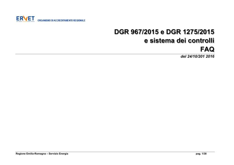 DGR 967/2015 e DGR 1275/2015 e sistema dei controlli FAQ del 24/10/201 2016 Regione Emilia-Romagna – Servizio Energia pag. 1/38 DGR 967/2015 DGR Num. 1. 957/2015 Art.4 c.4 2. 967/2015 Art.3 DOMANDA La DGR 967/2015 all’art. 4 Esclusioni punto 4, risultano esclusi gli interventi di ripristino dell’involucro edilizio che coinvolgano unicamente strati di finitura interni o esterni ininfluenti dal punto di vista termico. Si chiede se i seguenti interventi siano esclusi dall’applicazione dei requisiti energetici minimi previsti dalla Deliberazione Giunta Regionale 967/2015: 1. Restauro facciate (manutenzione ordinaria) con il metodo rete-rasatura eseguiti su tutte le facciate dell’edificio con rifacimento di intonaci inferiore al 25% delle superfici; 2. Restauro coperti o Lastrici (manutenzione ordinaria) con la sola sostituzione dell’impermeabilizzazione; 3. Restauro di superfici in cemento armato a vista mediante ricostruzione della sezione originale dei paramenti murari. La DGR 967/2015 è una normativa vera e propria o si tratta di un mero atto d’indirizzo di applicazione facoltativa da parte dei singoli enti locali? Regione Emilia-Romagna – Servizio Energia RISPOSTA Risultano ascrivibili ai casi di esclusione di cui all’art 4 punto 4 della DGR 967/2015 le seguenti tipologie di intervento, indipendentemente dalla superficie coinvolta, interventi quali: 1. l'applicazione di strati di ripristino e finitura (rasature, intonachini e malte colorate in pasta, con o senza rete di supporto) su intonaco preesistente, che si considerano analoghi alla tinteggiatura; 2. sostituzione dell’impermeabilizzazione su tetti piani e lastrici solari; 3. restauro di superfici in cemento armato a vista mediante ricostruzione della sezione originale dei paramenti murari. L'intervento di rifacimento dell’intonaco (applicazione in uno o più strati di malta sulla superficie muraria riportata a vista) è soggetto ad obbligo di rispetto di specifici requisiti minimi di prestazione energetica in funzione della dimensione della superficie interessata rispetto alla superficie complessiva dell’involucro edilizio: - inferiore al 10%: intervento escluso - tra il 10% e il 25%: intervento di riqualificazione energetica (requisiti di cui alla sezione D dell'Allegato 2 della DGR 967/2015) - oltre il 25%: intervento di ristrutturazione importante di 2° livello (requisiti di cui alla sezione C dell'Allegato 2 della DGR 967/2015) - oltre il 50%, e solo se associato ad interventi di ristrutturazione dell'impianto termico: intervento di ristrutturazione importante di 1° livello (requisiti di cui alla sezione B dell'Allegato 2 della DGR 967/2015) Il fatto che al rifacimento dell'intonaco venga associato un intervento di finitura di cui al precedente punto 1, anche esteso all'intero involucro dell'edificio, non comporta alcuna conseguenza rispetto alla tipologia di requisiti di cui è richiesto il rispetto. La dal DGR 967/2015 è un atto di indirizzo e coordinamento che prevede l’adeguamento obbligatorio da parte dei comuni dei propri strumenti di regolamentazione territoriale (rue). Qualora il comune non provveda, i requisiti entrano pag. 2/38 automaticamente in vigore (e divengono quindi cogenti) in base a quanto previsto dall’art. 3 dell’Allegato della DGR 967/2015. Conseguentemente, dal 1° ottobre 2015 e nei casi e con i limiti previsti all’art. 3 sopra citato, il rispetto dei requisiti minimi di Prestazione Energetica degli edifici riportati dalla delibera DGR 967/2015 è obbligatorio, anche nel caso in cui il comune non abbia ancora provveduto a modificare il proprio regolamento edilizio. 3. 967/2015 Art.8 In quali casi è obbligatorio predisporre l’Attestato di Qualificazione Energetica? 4. 967/2015 All. 5 Quali sono i contenuti dell’Attestato di Qualificazione Energetica? 5. 967/2015 Art.8 c.9 Chi può redigere l’Attestato di Qualificazione Energetica? Quali sono i costi? Regione Emilia-Romagna – Servizio Energia Come riportato nell’art. 8, comma 9 dell’Allegato della DGR 967/2015, al termine dei lavori, nel caso di edifici di nuova costruzione di cui all’art. 3 comma 2 lett. a), di edifici esistenti soggetti a ristrutturazioni importanti di primo livello di cui all’art. 3 comma 2 lett. b) punto i, e di ampliamenti di cui all’art. 3 comma 3 punto i, deve essere predisposto e asseverato da un professionista abilitato, non necessariamente estraneo alla proprietà, alla progettazione o alla realizzazione dell'edificio, l’Attestato di Qualificazione Energetica, senza alcun onere aggiuntivo per il committente. Si precisa che la redazione degli AQE è: - per tutti quegli interventi il cui titolo abilitativo è stato presentato prima dell’entrata in vigore della DGR 967/15 e per i quali non è stata presentata variante, seguono la legislazione della DAL RER 156/08 e smi. - facoltativo per tutti gli interventi non ricadenti nel comma precedente. L’Attestato di Qualificazione Energetica, redatto in conformità allo schema di cui all’Allegato 5 della DGR 967/2015, attesta il rispetto dei requisiti minimi di Prestazione Energetica previsti e riporta i fabbisogni di energia primaria di calcolo, la classe di appartenenza dell'edificio, o dell'unità immobiliare, in relazione al sistema di certificazione Energetica in vigore, ed i corrispondenti valori massimi ammissibili fissati dalla normativa in vigore per il caso specifico o, ove non siano fissati tali limiti, per un identico edificio di nuova costruzione. L’Attestato di Qualificazione Energetica attesta la conformità delle opere realizzate al progetto e alle norme di riferimento vigenti. L’attesto di Qualificazione Energetica è redatto da un tecnico abilitato, non necessariamente estraneo alla progettazione ed alla realizzazione dell’intervento. Ai sensi della DGR 967/2015 Articolo 8 comma 9, la predisposizione pag. 3/38 6. 967/2015 Art.3 7. 967/2015 Per il rispetto dei limiti di trasmittanza termica deve tener conto