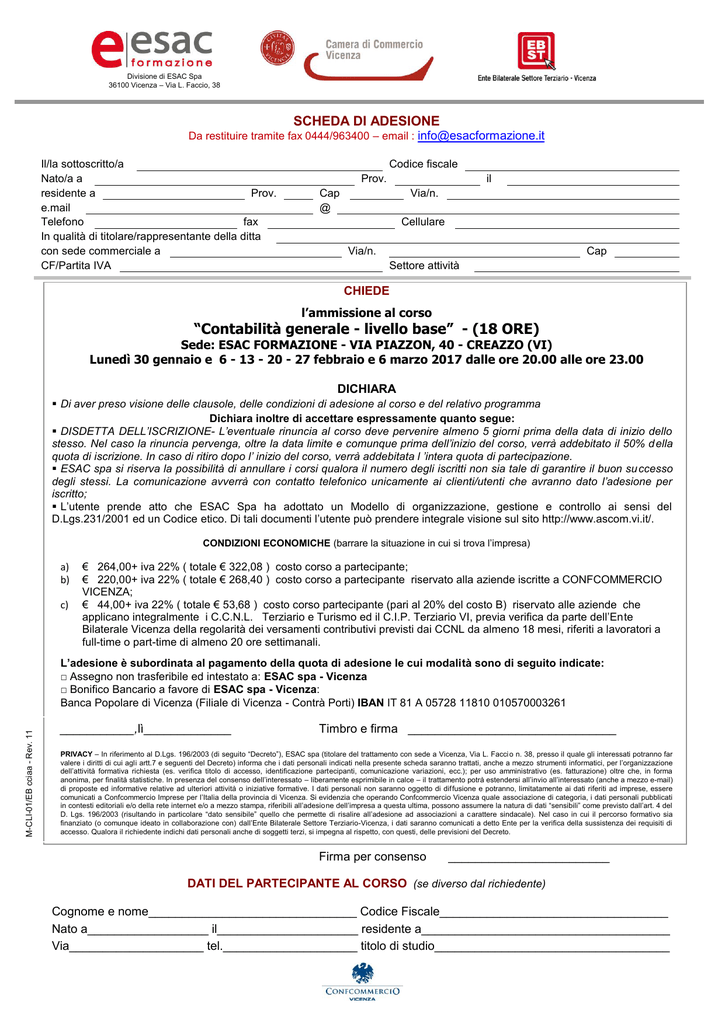 Divisione di ESAC Spa 36100 Vicenza – Via L. Faccio, 38 SCHEDA DI ADESIONE Da restituire tramite fax 0444/963400 – email : [email protected] Il/la sottoscritto/a Nato/a a residente a Prov. e.mail Telefono fax In qualità di titolare/rappresentante della ditta con sede commerciale a CF/Partita IVA Codice fiscale Prov. il Cap @ Via/n. Cellulare Via/n. Cap Settore attività CHIEDE l’ammissione al corso “Contabilità generale - livello base” - (18 ORE) Sede: ESAC FORMAZIONE - VIA PIAZZON, 40 - CREAZZO (VI) Lunedì 30 gennaio e 6 - 13 - 20 - 27 febbraio e 6 marzo 2017 dalle ore 20.00 alle ore 23.00 DICHIARA Di aver preso visione delle clausole, delle condizioni di adesione al corso e del relativo programma Dichiara inoltre di accettare espressamente quanto segue: DISDETTA DELL’ISCRIZIONE- L’eventuale rinuncia al corso deve pervenire almeno 5 giorni prima della data di inizio dello stesso. Nel caso la rinuncia pervenga, oltre la data limite e comunque prima dell’inizio del corso, verrà addebitato il 50% d ella quota di iscrizione. In caso di ritiro dopo l’ inizio del corso, verrà addebitata l ’intera quota di partecipazione. ESAC spa si riserva la possibilità di annullare i corsi qualora il numero degli iscritti non sia tale di garantire il buon su ccesso degli stessi. La comunicazione avverrà con contatto telefonico unicamente ai clienti/utenti che avranno dato l’adesione per iscritto; L’utente prende atto che ESAC Spa ha adottato un Modello di organizzazione, gestione e controllo ai sensi del D.Lgs.231/2001 ed un Codice etico. Di tali documenti l’utente può prendere integrale visione sul sito http://www.ascom.vi.it/. CONDIZIONI ECONOMICHE (barrare la situazione in cui si trova l’impresa) a) b) c) € 264,00+ iva 22% ( totale € 322,08 ) costo corso a partecipante; € 220,00+ iva 22% ( totale € 268,40 ) costo corso a partecipante riservato alla aziende iscritte a CONFCOMMERCIO VICENZA; € 44,00+ iva 22% ( totale € 53,68 ) costo corso partecipante (pari al 20% del costo B) riservato alle aziende che applicano integralmente i C.C.N.L. Terziario e Turismo ed il C.I.P. Terziario VI, previa verifica da parte dell’Ente Bilaterale Vicenza della regolarità dei versamenti contributivi previsti dai CCNL da almeno 18 mesi, riferiti a lavoratori a full-time o part-time di almeno 20 ore settimanali. M-CLI-01/EB cciaa - Rev. 11 L’adesione è subordinata al pagamento della quota di adesione le cui modalità sono di seguito indicate: □ Assegno non trasferibile ed intestato a: ESAC spa - Vicenza □ Bonifico Bancario a favore di ESAC spa - Vicenza: Banca Popolare di Vicenza (Filiale di Vicenza - Contrà Porti) IBAN IT 81 A 05728 11810 010570003261 ___________,lì_____________ Timbro e firma _______________________________ PRIVACY – In riferimento al D.Lgs. 196/2003 (di seguito “Decreto”), ESAC spa (titolare del trattamento con sede a Vicenza, Via L. Facci o n. 38, presso il quale gli interessati potranno far valere i diritti di cui agli artt.7 e seguenti del Decreto) informa che i dati personali indicati nella presente scheda saranno trattati, anche a mezzo strumenti informatici, per l’organizzazione dell’attività formativa richiesta (es. verifica titolo di accesso, identificazione partecipanti, comunicazione variazioni, ecc.); per uso amministrativo (es. fatturazione) oltre che, in forma anonima, per finalità statistiche. In presenza del consenso dell’interessato – liberamente esprimibile in calce – il trattamento potrà estendersi all’invio all’interessato (anche a mezzo e-mail) di proposte ed informative relative ad ulteriori attività o iniziative formative. I dati personali non saranno oggetto di dif fusione e potranno, limitatamente ai dati riferiti ad imprese, essere comunicati a Confcommercio Imprese per l’Italia della provincia di Vicenza. Si evidenzia che operando Confcommercio Vicenza quale associazione di categoria, i dati personali pubblicati in contesti editoriali e/o della rete internet e/o a mezzo stampa, riferibili all’adesione dell’impresa a questa ultima, possono assumere la natura di dati “sensibili” come previsto dall’art. 4 del D. Lgs. 196/2003 (risultando in particolare “dato sensibile” quello che permette di risalire all’adesione ad associazioni a c arattere sindacale). Nel caso in cui il percorso formativo sia finanziato (o comunque ideato in collaborazione con) dall’Ente Bilaterale Settore Terziario-Vicenza, i dati saranno comunicati a detto Ente per la verifica della sussistenza dei requisiti di accesso. Qualora il richiedente indichi dati personali anche di soggetti terzi, si impegna al rispetto, con questi, delle previsioni del Decreto. Firma per consenso ________________________ DATI DEL PARTECIPANTE AL CORSO (se diverso dal richiedente) Cognome e nome_______________________________ Codice Fiscale__________________________________ Nato a__________________ il_____________________ residente a_____________________________________ Via____________________ tel.____________________ titolo di studio___________________________________ SCHEDA ACCETTAZIONE TRATTAMENTO DATI PERSONALI Il/la sottoscritto/a ________________________________, viene di seguito informato/a, ad integrazione delle eventuali informazioni già ricevute anche oralmente in tema di riservatezza, in base alle previsioni di cui al D.Lgs. 196/2003 in mater ia di tutela della privacy (di seguito anche “Decreto”), in relazione al trattamento dei propri dati personali. ESAC SPA è il titolare del trattamento con sede legale a Vicenza, Via L. Faccio n.38, al quale gli interessati potranno far valere i diritti di cui agli articoli 7 e seguenti del Decreto. I dati personali del partecipante alle iniziative formative saranno trattati, anche a mezzo strumenti informatici, al fine di consentire l’organizzazione delle stesse (es. identificazione dei partecipanti, comunicazione di even tuali variazioni, ecc.) per uso amministrativo oltre che 