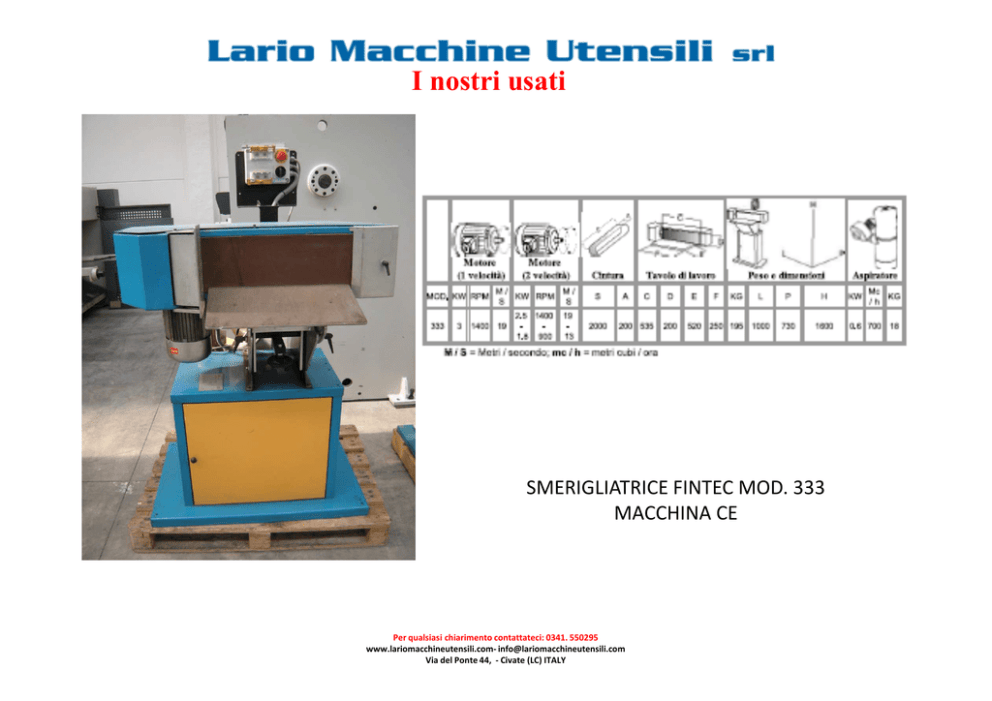 I nostri usati SMERIGLIATRICE FINTEC MOD. 333 MACCHINA CE Per qualsiasi chiarimento contattateci: 0341. 550295 www.lariomacchineutensili.com- [email protected] Via del Ponte 44, - Civate (LC) ITALY