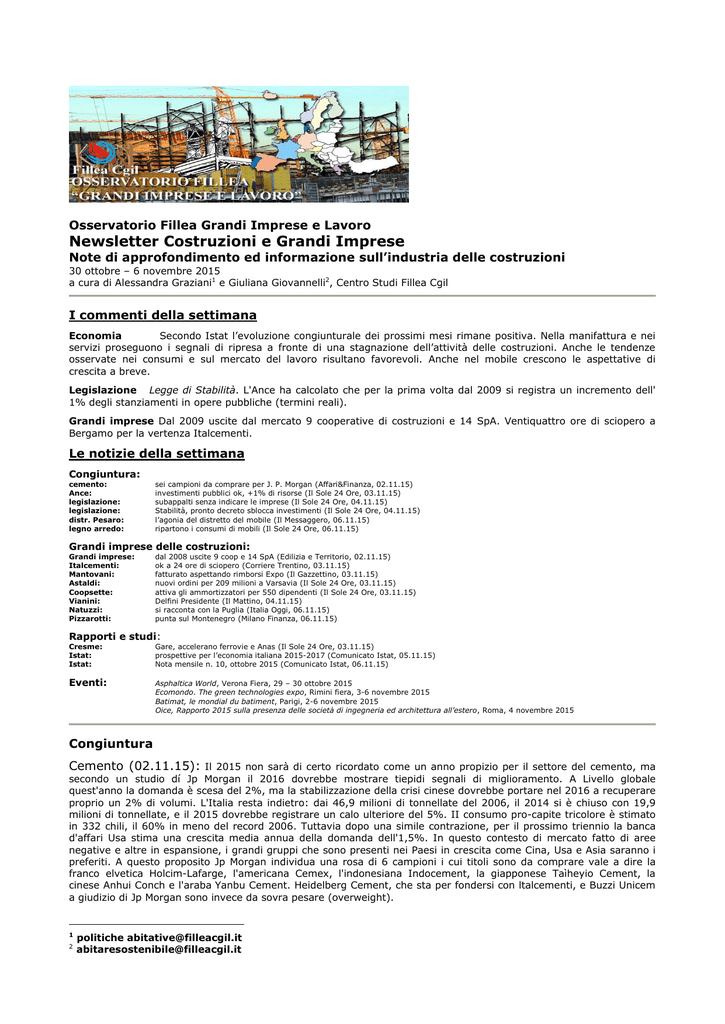 Osservatorio Fillea Grandi Imprese e Lavoro Newsletter Costruzioni e Grandi Imprese Note di approfondimento ed informazione sull’industria delle costruzioni 30 ottobre – 6 novembre 2015 a cura di Alessandra Graziani1 e Giuliana Giovannelli2, Centro Studi Fillea Cgil I commenti della settimana Economia Secondo Istat l’evoluzione congiunturale dei prossimi mesi rimane positiva. Nella manifattura e nei servizi proseguono i segnali di ripresa a fronte di una stagnazione dell’attività delle costruzioni. Anche le tendenze osservate nei consumi e sul mercato del lavoro risultano favorevoli. Anche nel mobile crescono le aspettative di crescita a breve. Legislazione Legge di Stabilità. L'Ance ha calcolato che per la prima volta dal 2009 si registra un incremento dell' 1% degli stanziamenti in opere pubbliche (termini reali). Grandi imprese Dal 2009 uscite dal mercato 9 cooperative di costruzioni e 14 SpA. Ventiquattro ore di sciopero a Bergamo per la vertenza Italcementi. Le notizie della settimana Congiuntura: cemento: Ance: legislazione: legislazione: distr. Pesaro: legno arredo: sei campioni da comprare per J. P. Morgan (Affari&Finanza, 02.11.15) investimenti pubblici ok, +1% di risorse (Il Sole 24 Ore, 03.11.15) subappalti senza indicare le imprese (Il Sole 24 Ore, 04.11.15) Stabilità, pronto decreto sblocca investimenti (Il Sole 24 Ore, 04.11.15) l’agonia del distretto del mobile (Il Messaggero, 06.11.15) ripartono i consumi di mobili (Il Sole 24 Ore, 06.11.15) Grandi imprese delle costruzioni: Grandi imprese: Italcementi: Mantovani: Astaldi: Coopsette: Vianini: Natuzzi: Pizzarotti: dal 2008 uscite 9 coop e 14 SpA (Edilizia e Territorio, 02.11.15) ok a 24 ore di sciopero (Corriere Trentino, 03.11.15) fatturato aspettando rimborsi Expo (Il Gazzettino, 03.11.15) nuovi ordini per 209 milioni a Varsavia (Il Sole 24 Ore, 03.11.15) attiva gli ammortizzatori per 550 dipendenti (Il Sole 24 Ore, 03.11.15) Delfini Presidente (Il Mattino, 04.11.15) si racconta con la Puglia (Italia Oggi, 06.11.15) punta sul Montenegro (Milano Finanza, 06.11.15) Rapporti e studi: Cresme: Istat: Istat: Gare, accelerano ferrovie e Anas (Il Sole 24 Ore, 03.11.15) prospettive per l’economia italiana 2015-2017 (Comunicato Istat, 05.11.15) Nota mensile n. 10, ottobre 2015 (Comunicato Istat, 06.11.15) Eventi: Asphaltica World, Verona Fiera, 29 – 30 ottobre 2015 Ecomondo. The green technologies expo, Rimini fiera, 3-6 novembre 2015 Batimat, le mondial du batiment, Parigi, 2-6 novembre 2015 Oice, Rapporto 2015 sulla presenza delle società di ingegneria ed architettura all’estero, Roma, 4 novembre 2015 Congiuntura Cemento (02.11.15): Il 2015 non sarà di certo ricordato come un anno propizio per il settore del cemento, ma secondo un studio dí Jp Morgan il 2016 dovrebbe mostrare tiepidi segnali di miglioramento. A Livello globale quest'anno la domanda è scesa del 2%, ma la stabilizzazione della crisi cinese dovrebbe portare nel 2016 a recuperare proprio un 2% di volumi. L'Italia resta indietro: dai 46,9 milioni di tonnellate del 2006, il 2014 si è chiuso con 19,9 milioni di tonnellate, e il 2015 dovrebbe registrare un calo ulteriore del 5%. II consumo pro-capite tricolore è stimato in 332 chili, il 60% in meno del record 2006. Tuttavia dopo una simile contrazione, per il prossimo triennio la banca d'affari Usa stima una crescita media annua della domanda dell'1,5%. In questo contesto di mercato fatto di aree negative e altre in espansione, i grandi gruppi che sono presenti nei Paesi in crescita come Cina, Usa e Asia saranno i preferiti. A questo proposito Jp Morgan individua una rosa di 6 campioni i cui titoli sono da comprare vale a dire la franco elvetica Holcim-Lafarge, l'americana Cemex, l'indonesiana Indocement, la giapponese Taìheyio Cement, la cinese Anhui Conch e l'araba Yanbu Cement. Heidelberg Cement, che sta per fondersi con ltalcementi, e Buzzi Unicem a giudizio di Jp Morgan sono invece da sovra pesare (overweight). 1 2 politiche [email protected] [email protected] Ance (03.11.15): Non ci sono solo la cancellazione del patto di stabilità interno e l'accelerazione della spesa 2016 per effetto della clausola di flessibilità Ue a spingere gli investimenti pubblici. L'Ance ha calcolato che per la prima volta dal 2009 si interrompe la serie di tagli sistematici alle risorse e si registra invece un incremento dell' 1% degli stanziamenti in termini reali. Le opere pubbliche è uno dei tre pilastri della manovra che portano l'associazione dei costruttori, ascoltata ieri in audizione dalle commissioni Bilancio di Camera e Senato, a esprimere una valutazione positiva sull'intera legge di stabilità. Gli altri due pilastri positivi della manovra - l'eliminazione dell'imposizione patrimoniale sulla prima casa e la conferma delle agevolazioni fiscali per ristrutturazioni edilizie ed efficientamento energetico degli edifici - hanno visto da subito l'entusiastica adesione dei costruttori che in questi anni hanno sempre lamentato l'eccesso di pressione fiscale sul settore immobiliare e sulla casa in particolare. Questo giudizio positivo non significa, ovviamente, che manchino misure con cuì si dovrebbe completare l'azione del governo. «Le misure adottate dice il documento consegnato ieri dall'Ance alle commissioni Bilancio di Camera e Senato - non possono ritenersi ancora sufficienti per garantire un effettivo rilancio del mercato immobiliare, né tanto meno per superare le attuali distorsioni del sistema impositivo locale. Per questa ragione l'Ance, insieme a Confindustria, ha elaborato un pacchetto di proposte che mira a incentivare il mercato, indirizzando la domanda verso prodotti più efficienti e sostenibili». L'Ance propone l'introduzione di una detrazione pari al 50% dell'Iva pagata sugli acquisti di abitazioni nuove in classe energetica elevata (classe A e B), effettuati fino a1 2018. La proposta prevede per l'acquirente di immobili non adibiti ad abitazione principale anche l'esenzione triennale