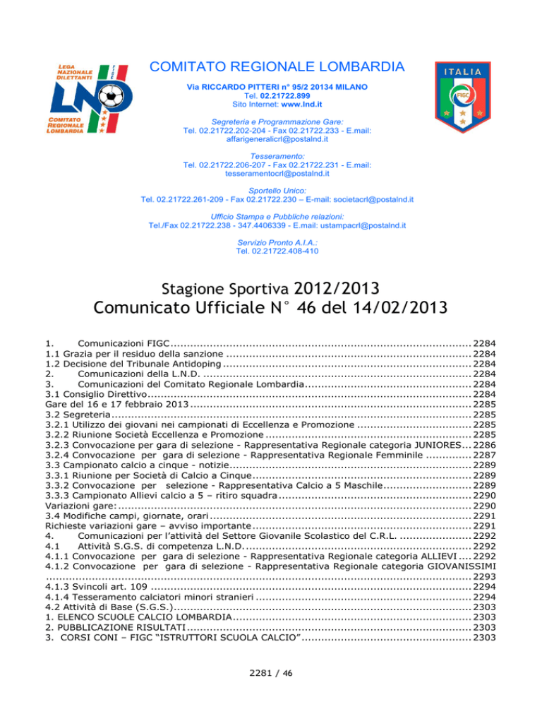 COMITATO REGIONALE LOMBARDIA Via RICCARDO PITTERI n° 95/2 20134 MILANO Tel. 02.21722.899 Sito Internet: www.lnd.it Segreteria e Programmazione Gare: Tel. 02.21722.202-204 - Fax 02.21722.233 - E.mail: [email protected] Tesseramento: Tel. 02.21722.206-207 - Fax 02.21722.231 - E.mail: [email protected] Sportello Unico: Tel. 02.21722.261-209 - Fax 02.21722.230 – E-mail: [email protected] Ufficio Stampa e Pubbliche relazioni: Tel./Fax 02.21722.238 - 347.4406339 - E.mail: [email protected] Servizio Pronto A.I.A.: Tel. 02.21722.408-410 Stagione Sportiva 2012/2013 Comunicato Ufficiale N° 46 del 14/02/2013 1. Comunicazioni FIGC ............................................................................................ 2284 1.1 Grazia per il residuo della sanzione ........................................................................... 2284 1.2 Decisione del Tribunale Antidoping ............................................................................ 2284 2. Comunicazioni della L.N.D. .................................................................................. 2284 3. Comunicazioni del Comitato Regionale Lombardia ................................................... 2284 3.1 Consiglio Direttivo ................................................................................................... 2284 Gare del 16 e 17 febbraio 2013 ...................................................................................... 2285 3.2 Segreteria .............................................................................................................. 2285 3.2.1 Utilizzo dei giovani nei campionati di Eccellenza e Promozione ................................... 2285 3.2.2 Riunione Società Eccellenza e Promozione ............................................................... 2285 3.2.3 Convocazione per gara di selezione - Rappresentativa Regionale categoria JUNIORES ... 2286 3.2.4 Convocazione per gara di selezione - Rappresentativa Regionale Femminile .............. 2287 3.3 Campionato calcio a cinque - notizie .......................................................................... 2289 3.3.1 Riunione per Società di Calcio a Cinque ................................................................... 2289 3.3.2 Convocazione per selezione - Rappresentativa Calcio a 5 Maschile ........................... 2289 3.3.3 Campionato Allievi calcio a 5 – ritiro squadra ........................................................... 2290 Variazioni gare: ............................................................................................................ 2290 3.4 Modifiche campi, giornate, orari ................................................................................ 2291 Richieste variazioni gare – avviso importante ................................................................... 2291 4. Comunicazioni per l’attività del Settore Giovanile Scolastico del C.R.L. ...................... 2292 4.1 Attività S.G.S. di competenza L.N.D. ..................................................................... 2292 4.1.1 Convocazione per gara di selezione - Rappresentativa Regionale categoria ALLIEVI .... 2292 4.1.2 Convocazione per gara di selezione - Rappresentativa Regionale categoria GIOVANISSIMI .................................................................................................................................. 2293 4.1.3 Svincoli art. 109 .................................................................................................. 2294 4.1.4 Tesseramento calciatori minori stranieri .................................................................. 2294 4.2 Attività di Base (S.G.S.) ........................................................................................... 2303 1. ELENCO SCUOLE CALCIO LOMBARDIA ......................................................................... 2303 2. PUBBLICAZIONE RISULTATI ....................................................................................... 2303 3. CORSI CONI – FIGC “ISTRUTTORI SCUOLA CALCIO” .................................................... 2303 2281 / 46 4 . INCONTRI FORMATIVI INFORMATIVI SOCIETA’ ........................................................... 2303 4.3 Modifiche campi, giornate, orari ............................................................................... 2304 Richieste variazioni gare – avviso importante ................................................................... 2304 5. Notizie su Attività Agonistica ................................................................................ 2305 ECCELLENZA ............................................................................................................. 2305 VARIAZIONI AL PROGRAMMA GARE .......................................................................... 2305 RISULTATI ............................................................................................................. 2305 GIUDICE SPORTIVO ................................................................................................ 2306 PROMOZIONE............................................................................................................ 2308 VARIAZIONI AL PROGRAMMA GARE .......................................................................... 2308 RISULTATI ............................................................................................................. 2309 GIUDICE SPORTIVO ................................................................................................ 2310 PRIMA CATEGORIA .................................................................................................... 2314 VARIAZIONI AL PROGRAMMA GARE .......................................................................... 2314 RISULTATI ............................................................................................................. 2316 GIUDICE SPORTIVO ..........................................................................