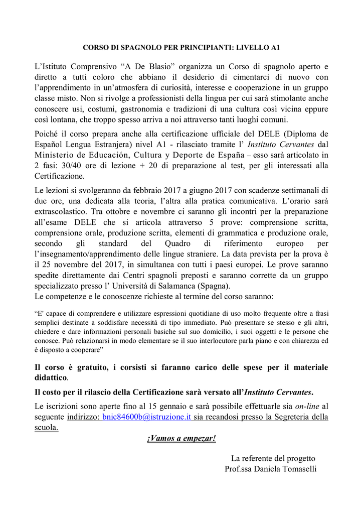 CORSO DI SPAGNOLO PER PRINCIPIANTI: LIVELLO A1 L’Istituto Comprensivo “A De Blasio” organizza un Corso di spagnolo aperto e diretto a tutti coloro che abbiano il desiderio di cimentarci di nuovo con l’apprendimento in un’atmosfera di curiosità, interesse e cooperazione in un gruppo classe misto. Non si rivolge a professionisti della lingua per cui sarà stimolante anche conoscere usi, costumi, gastronomia e tradizioni di una cultura così vicina eppure così lontana, che troppo spesso arriva a noi attraverso tanti luoghi comuni. Poiché il corso prepara anche alla certificazione ufficiale del DELE (Diploma de Español Lengua Estranjera) nivel A1 - rilasciato tramite l’ Instituto Cervantes dal Ministerio de Educación, Cultura y Deporte de España – esso sarà articolato in 2 fasi: 30/40 ore di lezione + 20 di preparazione al test, per gli interessati alla Certificazione. Le lezioni si svolgeranno da febbraio 2017 a giugno 2017 con scadenze settimanali di due ore, una dedicata alla teoria, l’altra alla pratica comunicativa. L’orario sarà extrascolastico. Tra ottobre e novembre ci saranno gli incontri per la preparazione all’esame DELE che si articola attraverso 5 prove: comprensione scritta, comprensione orale, produzione scritta, elementi di grammatica e produzione orale, secondo gli standard del Quadro di riferimento europeo per l’insegnamento/apprendimento delle lingue straniere. La data prevista per la prova è il 25 novembre del 2017, in simultanea con tutti i paesi europei. Le prove saranno spedite direttamente dai Centri spagnoli preposti e saranno corrette da un gruppo specializzato presso l’ Università di Salamanca (Spagna). Le competenze e le conoscenze richieste al termine del corso saranno: “E' capace di comprendere e utilizzare espressioni quotidiane di uso molto frequente oltre a frasi semplici destinate a soddisfare necessità di tipo immediato. Può presentare se stesso e gli altri, chiedere e dare informazioni personali basiche sul suo domicilio, i suoi oggetti e le persone che conosce. Può relazionarsi in modo elementare se il suo interlocutore parla piano e con chiarezza ed è disposto a cooperare” Il corso è gratuito, i corsisti si faranno carico delle spese per il materiale didattico. Il costo per il rilascio della Certificazione sarà versato all’Instituto Cervantes. Le iscrizioni sono aperte fino al 15 gennaio e sarà possibile effettuarle sia on-line al seguente indirizzo: [email protected] sia recandosi presso la Segreteria della scuola. ¡Vamos a empezar! La referente del progetto Prof.ssa Daniela Tomaselli