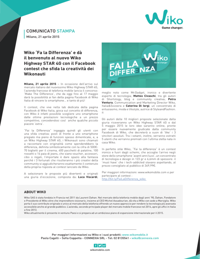 COMUNICATO STAMPA Milano, 21 aprile 2015 Wiko ‘Fa la Differenza’ e dà il benvenuto al nuovo Wiko Highway STAR 4G con il Facebook contest che sfida la creatività dei Wikonauti Milano, 21 aprile 2015 – In occasione dell’arrivo sul mercato italiano del nuovissimo Wiko Highway STAR 4G, l’azienda francese di telefonia mobile lancia il concorso: ‘Make The Difference’, che da oggi fino al 17 maggio darà la possibilità ai fan della pagina Facebook di Wiko Italia di vincere lo smartphone… e tanto di più! Il contest, che vive nella tab dedicata della pagina Facebook di Wiko Italia, gioca sul concetto di differenza, con Wiko è infatti possibile scegliere uno smartphone dalle ottime prestazioni tecnologiche a un prezzo competitivo, concedendosi così anche qualche piccolo piacere ‘extra’. “Fai la Differenza” ingaggia quindi gli utenti con una sfida creativa: posti di fronte a uno smartphone pregiato ma pieno di funzioni spesso dimenticate, e, a un Wiko Highway STAR 4G, i Wikonauti sono chiamati a raccontare con originalità come spenderebbero la differenza, definita simbolicamente con la cifra di 500€: 70 biglietti per il cinema, 400 pacchetti di patatine, 100 rossetti o 14 paia di jeans, che siano voucher, accessori, cibo o regali, l’importate è dare spazio alla fantasia perchè i 3 fortunati che risulteranno i più creativi della community si aggiudicheranno esattamente il contenuto della propria risposta al contest lanciato da Wiko. A selezionare le proposte più divertenti e originali una giuria d’eccezione, composta da: Luca Viscardi, meglio noto come Mr.Gadget, ironico e divertente esperto di tecnologia; Matteo Civaschi, tra gli autori di Shortology, blog e community creativa; Petra Ventura, Communication and Marketing Director Wiko, Italia&Svizzera e Caterina Di Iorgi, un concentrato di entusiasmo, moda e lifestyle, autrice di StyleandFashion. it Gli autori delle 10 migliori proposte selezionate dalla giuria riceveranno un Wiko Highway STAR 4G e dal 5 maggio 2015 le loro idee saranno online, pronte per essere nuovamente giudicate dalla community Facebook di Wiko, che decreterà a suon di ‘like’ i 3 vincitori assoluti. Tra i votanti, inoltre, verranno estratti 5 utenti che verranno premiati con l’ultima stella nata in casa Wiko. In perfetto stile Wiko, “Fai la differenza” è un contest ironico e fuori dagli schemi, che accoglie l’arrivo negli store dello smartphone ‘avanti anni luce’, un concentrato di tecnologia e design in 123 gr e 6,6mm di spessore: il ‘must have’ che i tech-addicted stavano aspettando, al prezzo consigliato al pubblico di 349,99€. Per maggiori informazioni: www.wikomobile.com e per partecipare al contest : http://bit.ly/FaiLaDifferenza_wiko ABOUT WIKO Wiko SAS è stata fondata in Francia nel 2011 da Laurent Dahan. Nel mercato della telefonia mobile dagli anni ’90, Dahan, Fondatore e Presidente di Wiko oltre che imprenditore visionario, insieme al CEO Michel Assadourian, dà vita a Wiko con sede a Marsiglia. Wiko porta il suo contributo originale e unico al mercato della telefonia offrendo un nuovo approccio per rendere la tecnologia più avanzata accessibile anche al grande pubblico. L’azienda, secondo principale player del mercato mobile francese nel 2014, apre gli uffici in Italia a fine 2013. Wiko attualmente è presente in ventuno Paesi e si prepara ad un ambizioso piano di espansione internazionale per il 2015. Per maggiori informazioni su Wiko e i suoi prodotti: www.wikomobile.it Paola Cagelli – Sofia Coppetta - CONNEXIA SRL - Tel: 02 8135541 - [email protected] wikomobile.com