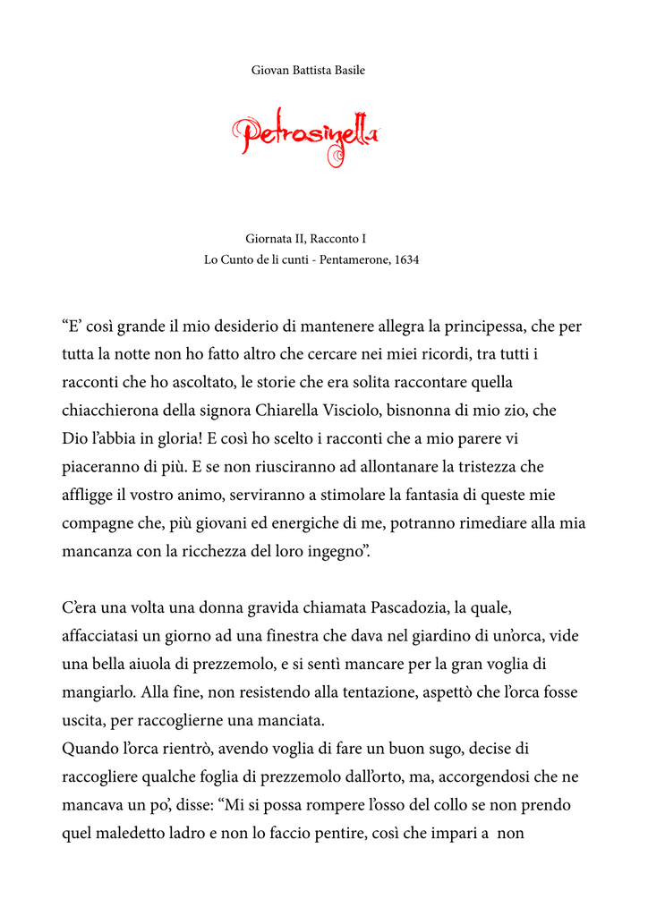 Giovan Battista Basile Petrosinella Giornata II, Racconto I Lo Cunto de li cunti - Pentamerone, 1634 “E’ così grande il mio desiderio di mantenere allegra la principessa, che per tutta la notte non ho fatto altro che cercare nei miei ricordi, tra tutti i racconti che ho ascoltato, le storie che era solita raccontare quella chiacchierona della signora Chiarella Visciolo, bisnonna di mio zio, che Dio l’abbia in gloria! E così ho scelto i racconti che a mio parere vi piaceranno di più. E se non riusciranno ad allontanare la tristezza che affligge il vostro animo, serviranno a stimolare la fantasia di queste mie compagne che, più giovani ed energiche di me, potranno rimediare alla mia mancanza con la ricchezza del loro ingegno”. C’era una volta una donna gravida chiamata Pascadozia, la quale, affacciatasi un giorno ad una finestra che dava nel giardino di un’orca, vide una bella aiuola di prezzemolo, e si sentì mancare per la gran voglia di mangiarlo. Alla fine, non resistendo alla tentazione, aspettò che l’orca fosse uscita, per raccoglierne una manciata. Quando l’orca rientrò, avendo voglia di fare un buon sugo, decise di raccogliere qualche foglia di prezzemolo dall’orto, ma, accorgendosi che ne mancava un po’, disse: “Mi si possa rompere l’osso del collo se non prendo quel maledetto ladro e non lo faccio pentire, così che impari a non scroccare dagli altri!”. Non avendo però Pascadozia ascoltato le parole dell’orca, continuò a rubare il prezzemolo dall’orto. Un giorno l’orca la sorprese sul fatto e, fuori di sé dalla rabbia, le disse: “T’ho scoperta brutta ladra! Come hai osato rubare nel mio giardino! Sta sicura che io non ti manderò a Roma per penitenza!”. La povera Pascadonzia cominciò a scusarsi in mille modi, dicendo di non avere rubato per lei, ma per evitare che sulla faccia del figlio che stava per nascere, restasse una voglia a forma di prezzemolo”. “Non arrampicarti sugli specchi”, rispose l’orca, “che non mi convinci con le tue chiacchiere! Sarai punita a dovere, salvo che tu non mi prometta di darmi il figlio che stai per partorire, sia esso maschio o femmina”. La povera Pascadozia, per evitare il peggio, giurò e stragiurò che avrebbe fatto ciò che lei le chiedeva, così l’orca la lasciò andar via. Quando fu tempo di partorire, nacque una bambina talmente bella da sembrare un gioiello, e poiché aveva una macchia a forma di prezzemolo sul petto, fu chiamata Petrosinella. Non appena la bambina ebbe sette anni, la madre la mandò dalla maestra. Lungo il tragitto Petrosinella incontrava ogni giorno l’orca, la quale la fermava dicendole: “Di’ a tua madre di ricordarsi della sua promessa”. Il tempo passava e Petrosinella riportava ogni giorno le parole dell’orca alla madre. E tante volte ripeté questa tiritera, che alla fine la madre disse a Petrosinella: “Se l’orca ti ricorda ancora quella maledetta promessa, tu rispondile: Prenditela!”. Quando Petrosinella si trovò di fronte all’orca, fece quanto le aveva detto la madre, e così l’orca, afferratala per i capelli, se la portò in un bosco dove non entrava mai la luce del sole e la imprigionò in una torre che non aveva nè porte nè scale, ma solo una piccola finestrella attraverso la quale, grazie alle trecce di Petrosinella, che erano lunghissime, l’orca saliva e scendeva. Un giorno che l’orca si era allontanata, la ragazza mise le sue lunghe trecce fuori dalla finestra, al sole . Passò da quelle parti il figlio di un principe, il quale, scorgendo tra quelle onde preziose um viso da sirena che incantava i cuori, se ne innamorò perdutamente. E così poco a poco, tra sospiri, riverenze, strizzatine d’occhi, parole gentili, baci lanciati sulle punte delle dita… riuscì finalmente ad ottenere un appuntamento, che sarebbe avvenuto di notte, quando la luna è già alta nel cielo. Quando fu il giorno stabilito, Petrosinella fece addormentare l’orca con un sonnifero e, a un fischio del principe, calò le trecce giù dalla torre e lo tirò su. I due innamorati restarono insieme fino all’alba, poi il principe se ne andò, scendendo dalla stessa scala d’oro. La cosa andò avanti per molte e molte notti, fin quando una comare se ne accorse e, impicciona come era stato il Rosso , raccontò tutto all’orca; le disse anche che bisognava stare attenti, perchè ben presto il giovane avrebbe portato via Petrosinella da quella torre. L’orca la ringraziò e le disse che era tempo perso per Petrosinella tentare di squagliarsela, perché era prigioniera di un incantesimo, secondo il quale avrebbe potuto fuggire solo se in posseso di tre ghiande nascoste in una trave della cucina. Ma, mentre l’orca diceva tutto questo, Petrosinella, che non si fidava della comare e stava sempre all’erta, ascoltò ogni cosa. Così, quando la Notte distese nel cielo le sue vesti nere e il principe, come al solito, salì da lei, gli raccontò tutto. Lui immediatamente si arrampicò sulla trave di cucina e trovò le ghiande che consegnò a Petrosinella. Costruirono poi una scala di corda con cui si calarono dalla torre e se la diedero a gambe in direzione della città. Lungo la strada però furono visti dalla comare, la quale immediatamente cominciò ad urlare, svegliando l’orca che, dopo esser scesa dalla medesima scala, cominciò ad inseguirli, correndo più veloce di un cavallo imbizzarrito. Allora Petrosinella gettò per terra la prima delle tre ghiande, che subito si trasformò in un cane terrificante che, abbaiando a più non posso con le mascelle spalancate, si scagliò contro l’orca per farsene un sol boccone. Ma questa, che era più furba di un parasacco , tirò fuori da una sacca un pezzo di pane e lo lanciò verso il cane, il quale, azzannatolo, abbassò la coda e si acquietò. Superato il primo ostacolo, l’orca riprese ad inseguire i due. Petrosinella allora le lanciò la seconda ghianda: ed ecco apparire un ferocissimo leone che, sbattendo 