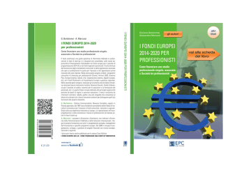 I FONDI EUROPEI 2014-2020 per professionisti Come finanziare uno studio professionale singolo, associato o Società tra professionisti Il testo costituisce una guida operativa di riferimento dedicata ai professionisti in fase di start-up o in situazioni più consolidate, sulle nuove opportunità di finanziamento individuabili nei fondi europei per il periodo di programmazione 2014-20, e nei fondi regionali e provinciali. Il tutto alla luce dell’evoluzione degli orientamenti comunitari e della legislazione nazionale che apre ai professionisti le porte per l’accesso a tali agevolazioni prima riservate alle sole imprese. Nella prima parte vengono trattati i programmi comunitari di interesse per professionisti (Cosme, Horizon 2020, Erasmus Plus, Europa Creativa, Salute, Life, Cooperazione esterna, Appalti europei, etc.) ed i Fondi Strutturali e di Investimento Europei a gestione regionale. Nella seconda parte vengono analizzati gli strumenti previsti dalla normativa nazionale (Lavoro Autonomo Invitalia, Garanzia Giovani, Fondo di Garanzia per l’accesso al credito, incentivi per le assunzioni e la formazione del personale, etc.). La parte finale è invece dedicata alle principali opportunità previste da bandi di regioni e province autonome. Il testo è arricchito da riferimenti normativi, tabelle, grafici e da utili sitografie che consentono al lettore di orientarsi tra i diversi strumenti esistenti per distinguere quelli più funzionali alla propria situazione. 9 788863 106749 ISBN 978-88-6310-674-9 G. Bartolomei - Dottore Commercialista, Revisore Contabile, esperto in finanza agevolata, dal 1987 socio fondatore e presidente della Fideas Srl società di consulenza per l’accesso ai fondi comunitari, nazionali e regionali. Grazie alla sua esperienza maturata sul campo, si è specializzato nell’europrogettazione e nella consulenza in favore di professionisti ed imprese anche in fase di start-up. A. Marcozzi - Laureata in Economia e Commercio, con indirizzo in Economia delle Amministrazioni Pubbliche e delle Istituzioni Internazionali, integra la propria formazione con corsi in progettazione europea, management dell’innovazione e specifici programmi europei. Dal 2008 si occupa di progettazione, sviluppo, e gestione di progetti finanziati con risorse europee, nazionali e regionali. I due autori hanno anche pubblicato per la stessa Casa Editrice: I FONDI EUROPEI 2014-20 - COME FINANZIARE UNA START-UP INNOVATIVA www.epc.it € 21,00 SEGUICI SU I FONDI EUROPEI 2014-2020 PER PROFESSIONISTI G. Bartolomei - A. Marcozzi Giuliano Bartolomei Alessandra Marcozzi gli autori I FONDI EUROPEI 2014-2020 PER PROFESSIONISTI Come finanziare uno studio professionale singolo, associato o Società tra professionisti altri titoli vai alla scheda del libro Pagine tratte da www.epc.it - Tutti i diritti riservati Giuliano Bartolomei - Alessandra Marcozzi I fondi europei 2014-2020 per professionisti Come finanziare uno studio professionale singolo, associato o Società tra professionisti FONDI EUROPEI PROF.indb 1 27/07/2015 15:22:57 Pagine tratte da www.epc.it - Tutti i diritti riservati I FONDI EUROPEI 2014-2020 PER PROFESSIONISTI ISBN: 978-88-6310-674-9 Copyright © 2015 EPC S.r.l. Socio Unico EPC S.r.l. Socio Unico - Via dell’Acqua Traversa, 187/189 - 00135 Roma www.epc.it Servizio clienti: 06 33245277 - Fax 06 3313212 Redazione: Tel. 06 33245264/205 Proprietà letteraria e tutti i diritti riservati alla EPC S.r.l. Socio Unico. La struttura e il contenuto del presente volume non possono essere riprodotti, neppure parzialmente, salvo espressa autorizzazione della Casa Editrice. Non ne è altresì consentita la memorizzazione su qualsiasi supporto (magnetico, magneto-ottico, ottico, fotocopie ecc.). La Casa Editrice, pur garantendo la massima cura nella preparazione del volume, declina ogni responsabilità per possibili errori od omissioni, nonché per eventuali danni risultanti dall’uso dell’informazione ivi contenuta. Il codice QR che si trova sul retro della copertina, consente attraverso uno smartphone di accedere direttamente alle informazioni e agli eventuali aggiornamenti di questo volume. Le stesse informazioni sono disponibili alla pagina: https://www.epc.it/Prodotto/Editoria/Libri/I-fondi-europei-2014-2020-per-professionisti/2229 000_Prime pagine.indd.indd 2 30/07/2015 15:39:07 Pagine tratte da www.epc.it - Tutti i diritti riservati SOMMARIO PREMESSA.................................................................................... 7 capitolo 1 I FONDI EUROPEI 2014-20 PER I PROFESSIONISTI ............................. 9 1.1. Il piano d’azione europeo 2014-20 per imprese e professionisti............ 9 1.2. I Paesi beneficiari dei fondi europei.......................................... 15 I programmi a gestione diretta 1.3. COSME per la competitività delle imprese e le PMI........................ 20 1.4. Erasmus per Giovani Imprenditori e Professionisti.......................... 29 1.5. EURES The European Job Mobility Portal................................... 34 1.6. Erasmus Plus per l’istruzione, la formazione, i giovani e lo sport.......... 36 1.7. HORIZON 2020, Programma europeo per la ricerca e l’innovazione....... 44 1.8. HORIZON 2020, Candidature per esperti indipendenti .................... 55 1.9. Azioni Marie Sklodowska Curie, formazione e mobilità dei ricercatori...................................................... 56 1.10. Esperti e Coach nello SME Instrument di Horizon 2020.................... 59 1.11. Terzo programma UE per la salute........................................... 63 1.12. Europa Creativa ............................................................... 65 1.13. Programma europeo 2014-2020 per la crescita sostenibile: risorse naturali. LIFE per l’ambiente e l’azione per il clima................. 69 3 000_Sommario.indd 3 30/07/2015 16:18:00 Pagine tratte da www.epc.it - Tutti i diritti riservati I FONDI EUROPEI 2014-2020 PER I PROFESSIONISTI 1.14. Programmi d