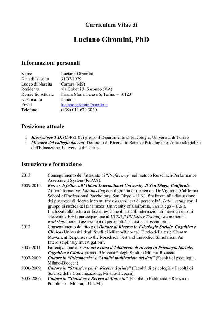 Curriculum Vitae di Luciano Giromini, PhD Informazioni personali Nome Data di Nascita Luogo di Nascita Residenza Domicilio Attuale Nazionalità Email Telefono Luciano Giromini 31/07/1979 Carrara (MS) via Gobetti 3, Saronno (VA) Piazza Maria Teresa 6, Torino – 10123 Italiana [email protected] (+39) 011 670 3060 Posizione attuale □ Ricercatore T.D. (M/PSI-07) presso il Dipartimento di Psicologia, Università di Torino □ Membro del collegio docenti, Dottorato di Ricerca in Scienze Psicologiche, Antropologiche e dell'Educazione, Università di Torino Istruzione e formazione 2013 2009-2014 2012 2007-2011 2007-2009 2006-2009 2005-2006 Conseguimento dell’attestato di “Proficiency” nel metodo Rorschach-Performance Assessment System (R-PAS). Research fellow all’Alliant International University di San Diego, California. Attività formative: Lab-meeting con il gruppo di ricerca del Dr Viglione (California School of Professional Psychology, San Diego – U.S.), finalizzati alla discussione dei progressi di ricerca inerenti test e assessment di personalità; Lab-meeting con il gruppo di ricerca del Dr Pineda (University of California, San Diego – U.S.), finalizzati alla lettura critica e revisione di articoli internazionali inerenti neuroni specchio e EEG; partecipazione al UCSD fMRI Safety Training e a numerosi workshop inerenti assessment di personalità, statistica e psicometria. Conseguimento del titolo di Dottore di Ricerca in Psicologia Sociale, Cognitiva e Clinica (Università degli Studi di Milano-Bicocca). Titolo della tesi: “Human Movement Responses to the Rorschach Test and Embodied Simulation: An Interdisciplinary Investigation”. Partecipazione ai seminari e corsi del dottorato di ricerca in Psicologia Sociale, Cognitiva e Clinica presso l’Università degli Studi di Milano-Bicocca. Cultore in “Psicometria” e “Analisi multivariata dei dati” (Facoltà di psicologia, Milano-Bicocca) Cultore in “Statistica per la Ricerca Sociale” (Facoltà di psicologia e Facoltà di Scienze della Comunicazione, Milano-Bicocca) Cultore in “Statistica e Rcerca di Mercato” (Facoltà di Pubblicità e Relazioni Pubbliche – Milano, I.U.L.M.) 2004-2005 2004 Corsi professionali per la somministrazione, la codifica e l’interpretazione del test di Rorschach (metodo Exner, liv.1 & liv.2 + Rorschach in età infantile), del test Blacky e della batteria WAIS-R (ARP Milano) Laurea in Psicologia con votazione 110/110 e Lode (Università di Milano-Bicocca). Titolo della tesi: “AD/HD in Adolescenza”. Attività didattica 2014-2015 2013-2014 2013-2014 2010-2014 2008-2009 2008 2008 2007-2009 2006-2009 2006 2005-2006 Titolare del laboratorio “Psicodiagnostica”, presso il dipartimento di Psicologia, Università di Torino. Professore del corso “Introduction to Psychology” (corso analogo a Psicologia generale, ma più orientato alla clinica e alle neuroscienze), presso la Alliant International University di San Diego, California. Professore del corso “Introduction to Statistics” (corso analogo a Statistica per la Ricerca Sociale, livello base), presso la Alliant International University di San Diego, California. “Statistics Tutor” (tutor in statistica, psicometria e metodologia della ricerca) per l’Academic Support Center (ACS) dell’Alliant International University di San Diego, California. Questo ruolo prevede la supervisione degli aspetti metodologici e statistici delle ricerche di dottorato condotte dagli studenti della Alliant International University – San Diego (circa 15 studenti per anno). Gli argomenti trattati spaziano dalla psicologia dinamica e clinica (ad es. obesità, regolazione dell’emozione, Rorschach, …) alla psicologia sociale (ad es. differenze cross-culturali, i social media, la teoria dei giochi, …). Tutor, esercitatore ed esaminatore dei corsi “La misura in psicologia” e “Analisi multivariata dei dati” per il Consorzio Nettuno (Università a distanza, MilanoBicocca) Professore a contratto per un corso di metodologia (30 ore, focalizzato su statistica, psicometria e analisi dei dati) a favore di un gruppo di dottorandi in Scienze della Formazione dell’Università di Torino Tutoraggio specializzato in psicometria a favore di studentessa non vedente (Milano-Bicocca) Professore a contratto per le attività integrative dei corsi “Psicometria” e “Analisi multivariata dei dati”, Facoltà di Psicologia (Milano-Bicocca) Professore a contratto per le attività integrative del corso “Statistica per la ricerca sociale”, Facoltà di Psicologia (Milano-Bicocca) Tutoraggio specializzato in psicometria a favore di studentessa non vedente (Milano-Bicocca) Professore a contratto per le attività integrative del corso “Metodi statistici per la valutazione dei servizi”, Facoltà di Economia (Milano-Bicocca) Borse di studio, premi e riconoscimenti scientifici 2014 2013 Vincitore del International Psychoanalytic Association (IPA) Grant, bandito dalla IPA. Titolo del progetto: “Maternal Skills and Overweight Risk: a Longitudinal Study on the Reflective Functioning Role” Conferimento del Visto O-1, “Alien of Extraordinary Ability in the Science of Personality Assessment”, rilasciato dal U.S. Citizenship and Immigration Services, per meriti scientifici nel campo dell’assessment di personalità. 2013 2012-2013 2013 2012 2012 2010 2010 2008 2007 Conferimento di un Assegno di Ricerca Post-Doc presso la Alliant International University di San Diego, California (supervisor: prof. Donald J. Viglione). Reviewer per la rivista internazionale Journal of Personality Assessment (5-year Impact Factor = 2.181). Vincitore del Premio AIP – Ordine degli Psicologi per Miglior Tesi di Dottorato dell’anno 2012. Vincitore di un Assegno di Ricerca Post-Doc presso l’Università degli Studi di Milano-Bicocca. “Mary Cerney Award 2012”, premio attribuito dalla Society for Personality Assessment (SPA) per il migliore articolo pubblicato da uno